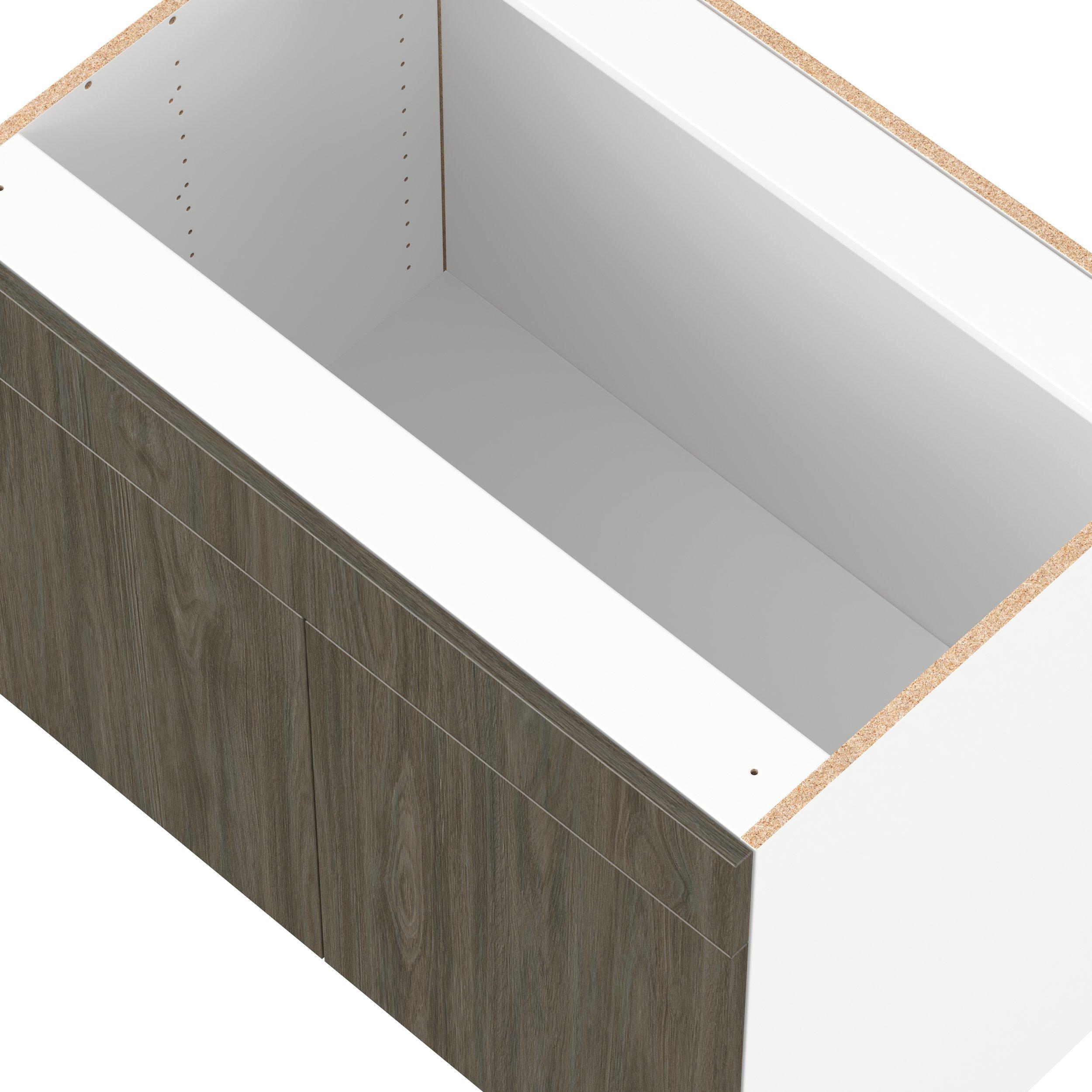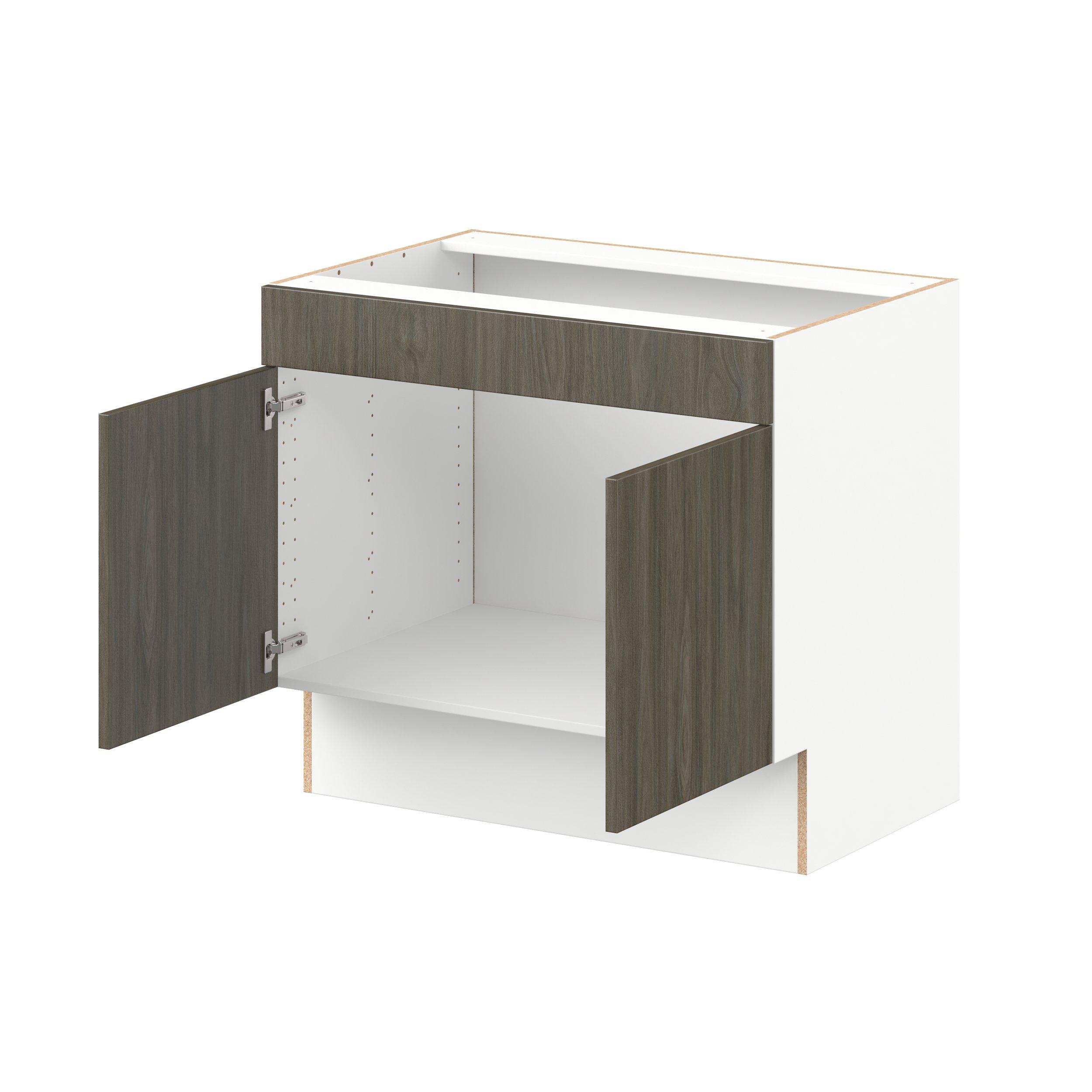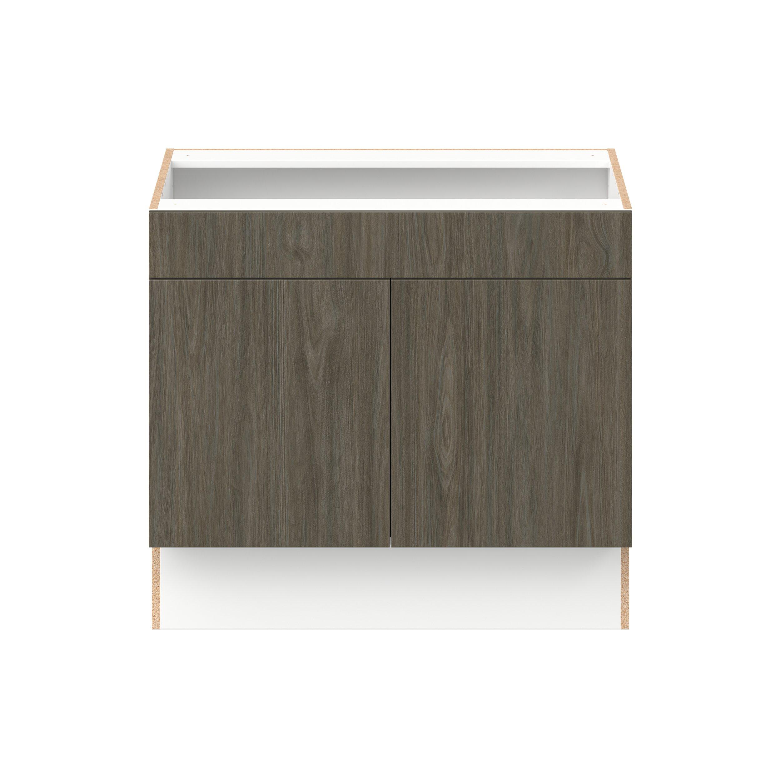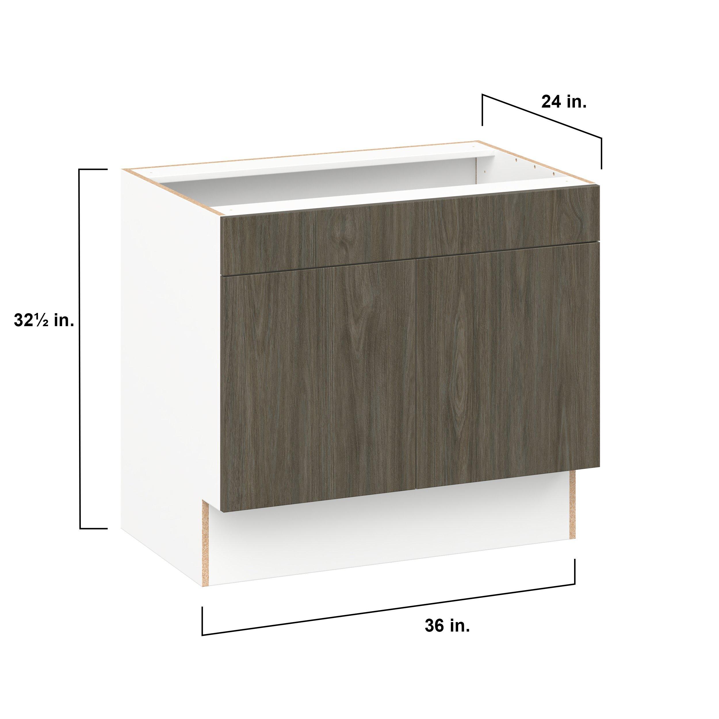 Elevate your project with the contemporary charm of Glenwood slab-style cabinets. Available in desert Mojavi oak and rich burnt walnut finishes, this collection captures the warmth and beauty of natural wood with the practicality of textured melamine. Crafted from one-piece MDF Studio Design Collection Glenwood 36 in. Burnt Walnut Sink Base Cabinet with False Front - ADA is designed to resist hairline cracks while the easy-to-clean finish stands up to stains and moisture. Featuring 5-piece doors and dovetail drawer joints, these cabinets offer durability and elegance. This collection combines style with everyday storage solutions.