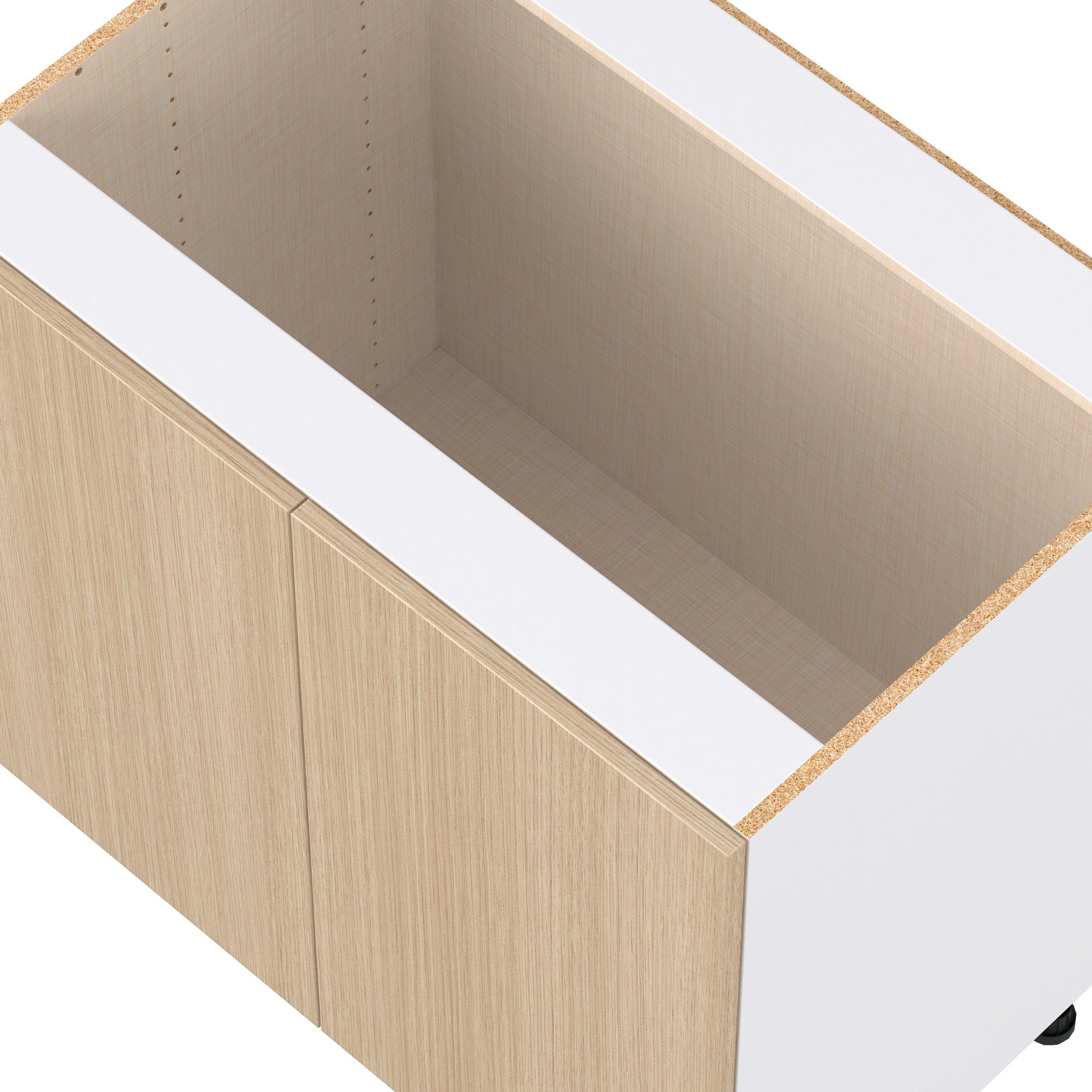 Elevate your project with the contemporary charm of Glenwood slab-style cabinets. Available in desert Mojavi oak and rich burnt walnut finishes, this collection captures the warmth and beauty of natural wood with the practicality of textured melamine. Crafted from one-piece MDF Studio Design Collection Glenwood 36 in. Mojavi Oak Sink Base Cabinet is designed to resist hairline cracks while the easy-to-clean finish stands up to stains and moisture. Featuring 5-piece doors and dovetail drawer joints, these cabinets offer durability and elegance. This collection combines style with everyday storage solutions.