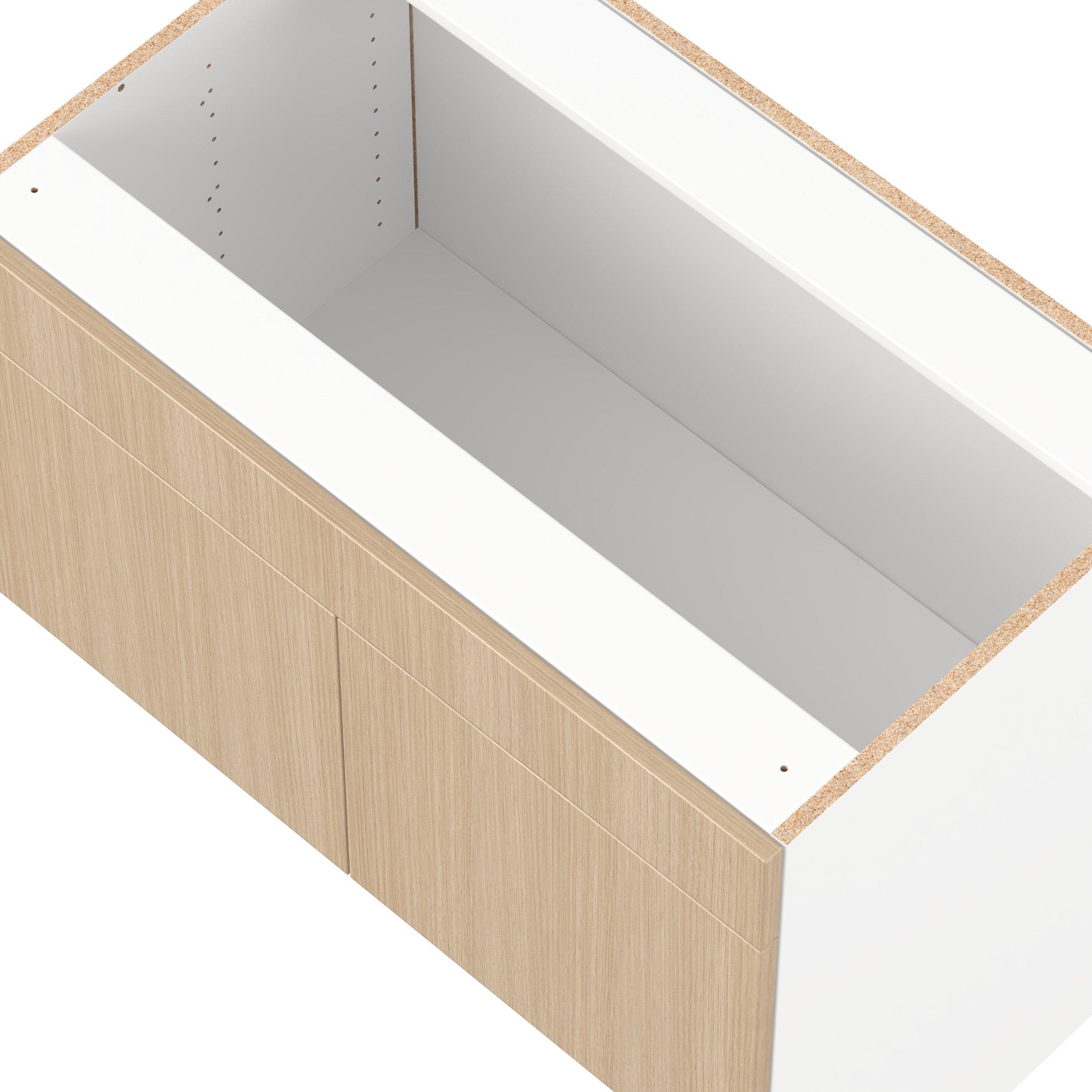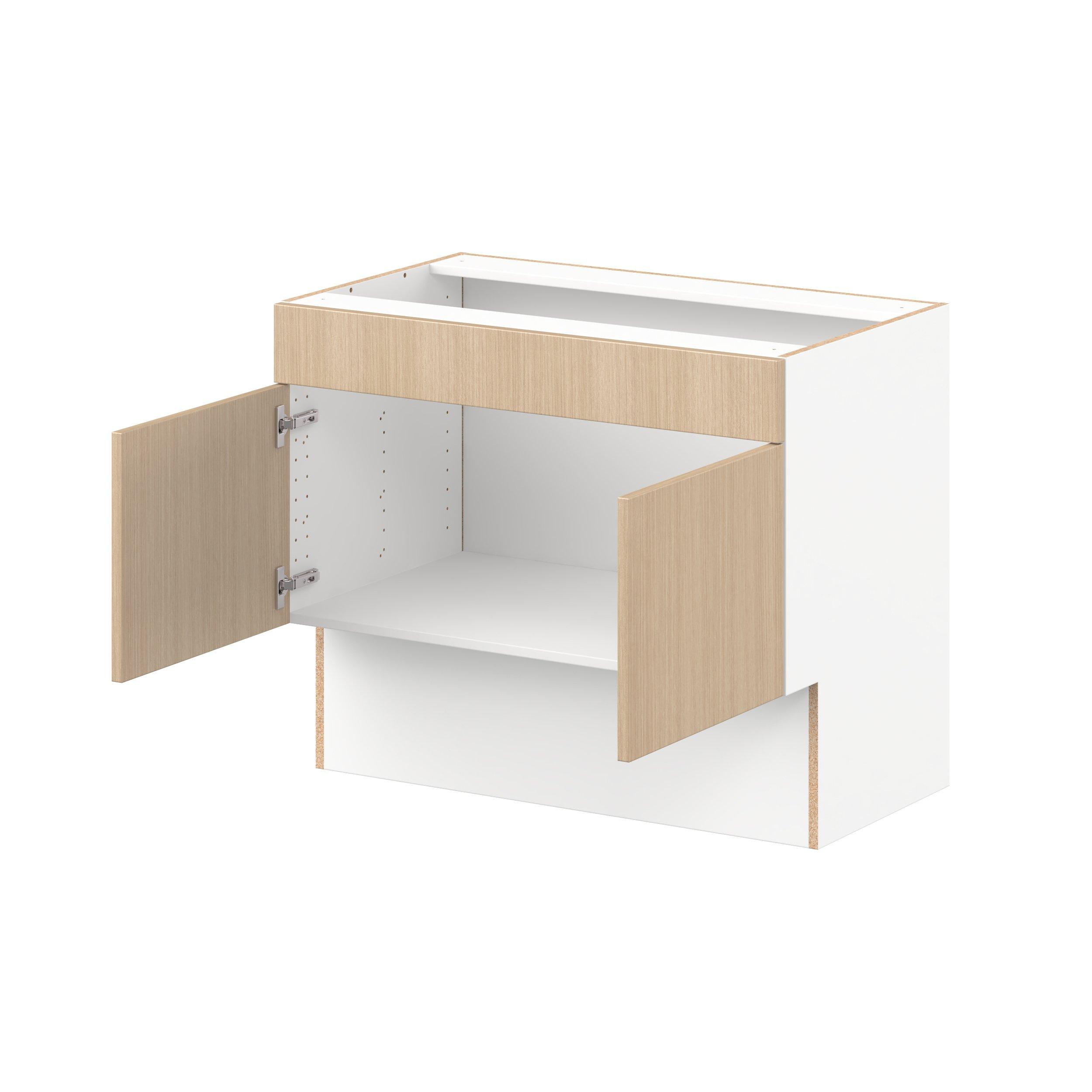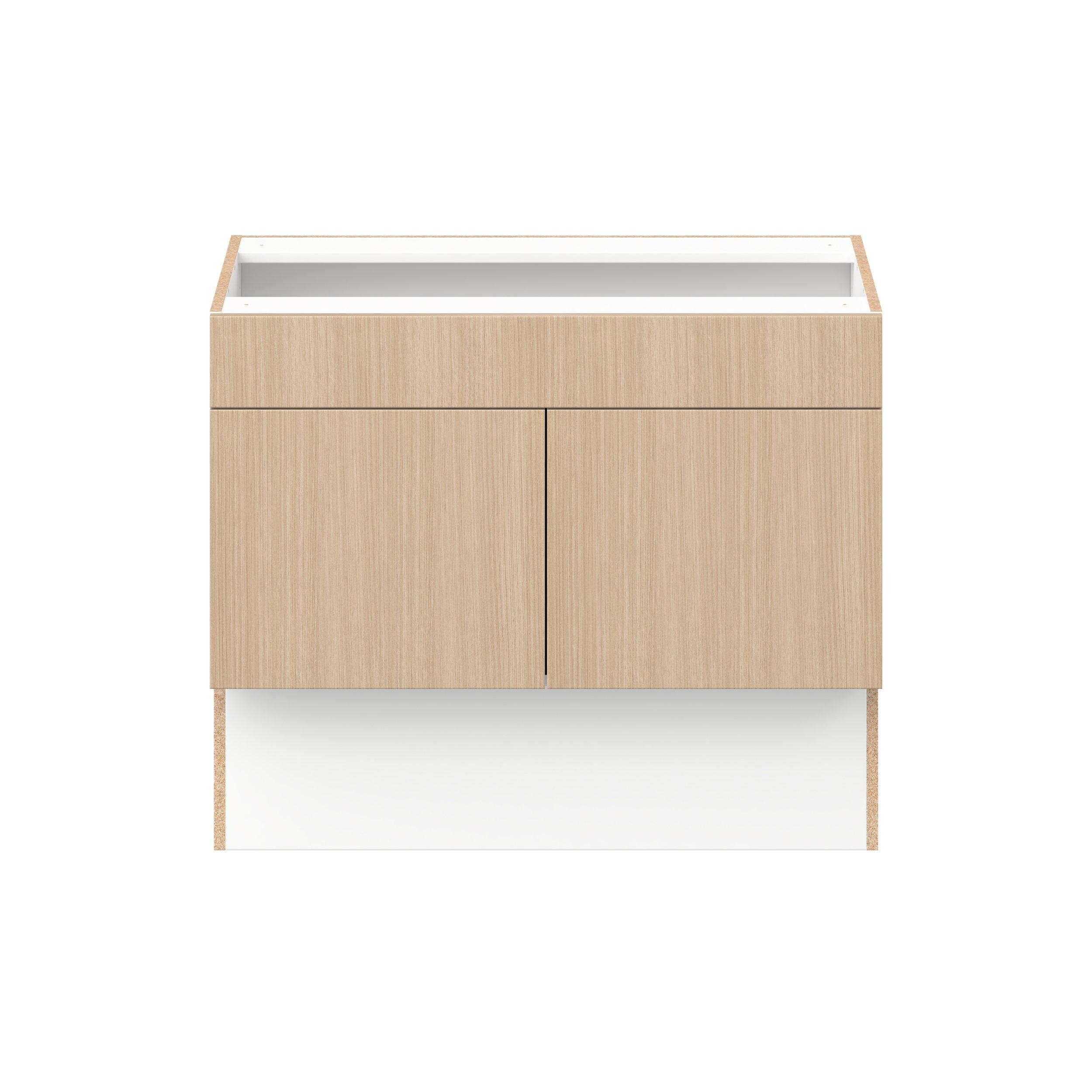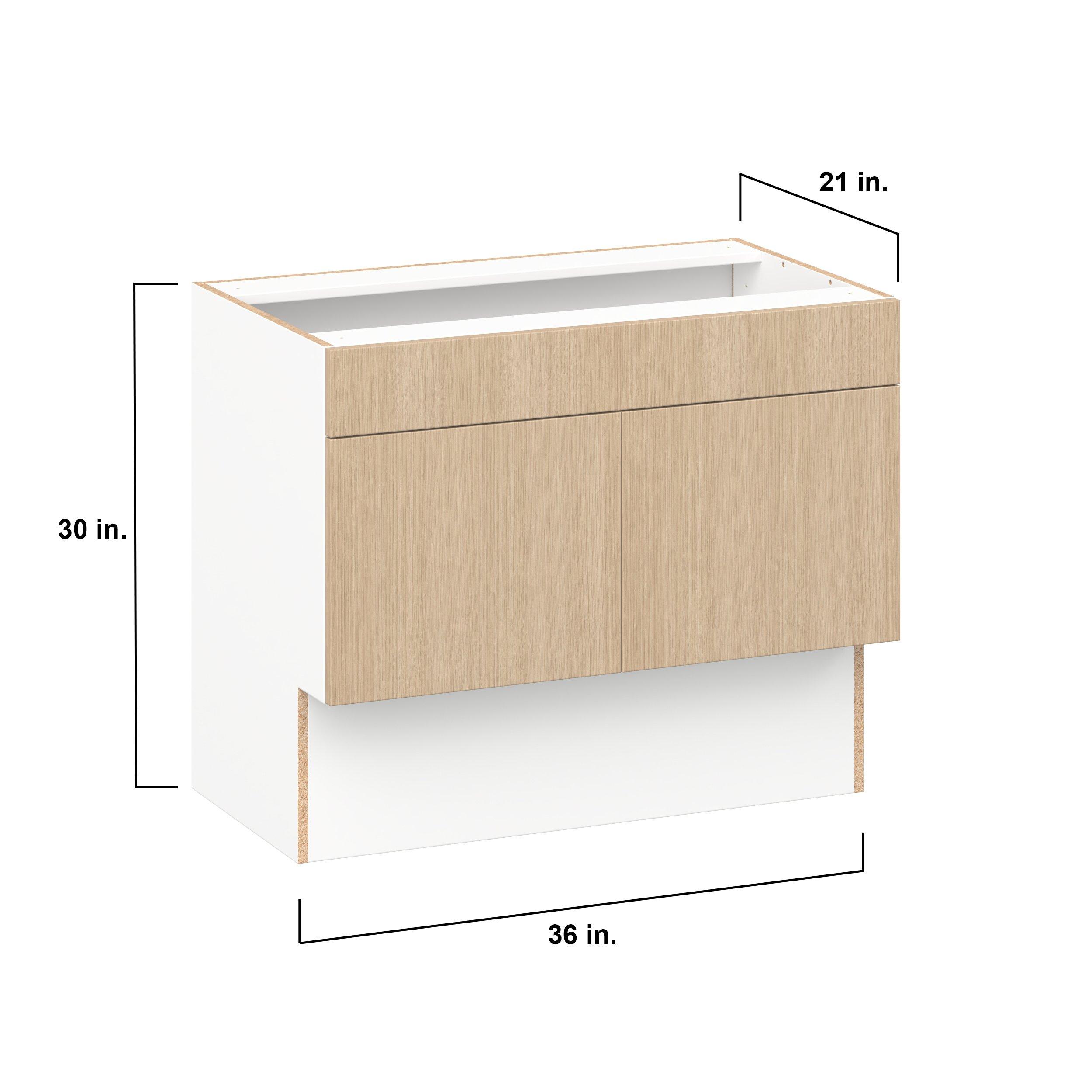 Elevate your project with the contemporary charm of Glenwood slab-style cabinets. Available in desert Mojavi oak and rich burnt walnut finishes, this collection captures the warmth and beauty of natural wood with the practicality of textured melamine. Crafted from one-piece MDF Studio Design Collection Glenwood 36 in. Mojavi Oak Vanity Sink Base Cabinet with Removable Front - ADA is designed to resist hairline cracks while the easy-to-clean finish stands up to stains and moisture. Featuring 5-piece doors and dovetail drawer joints, these cabinets offer durability and elegance. This collection combines style with everyday storage solutions.