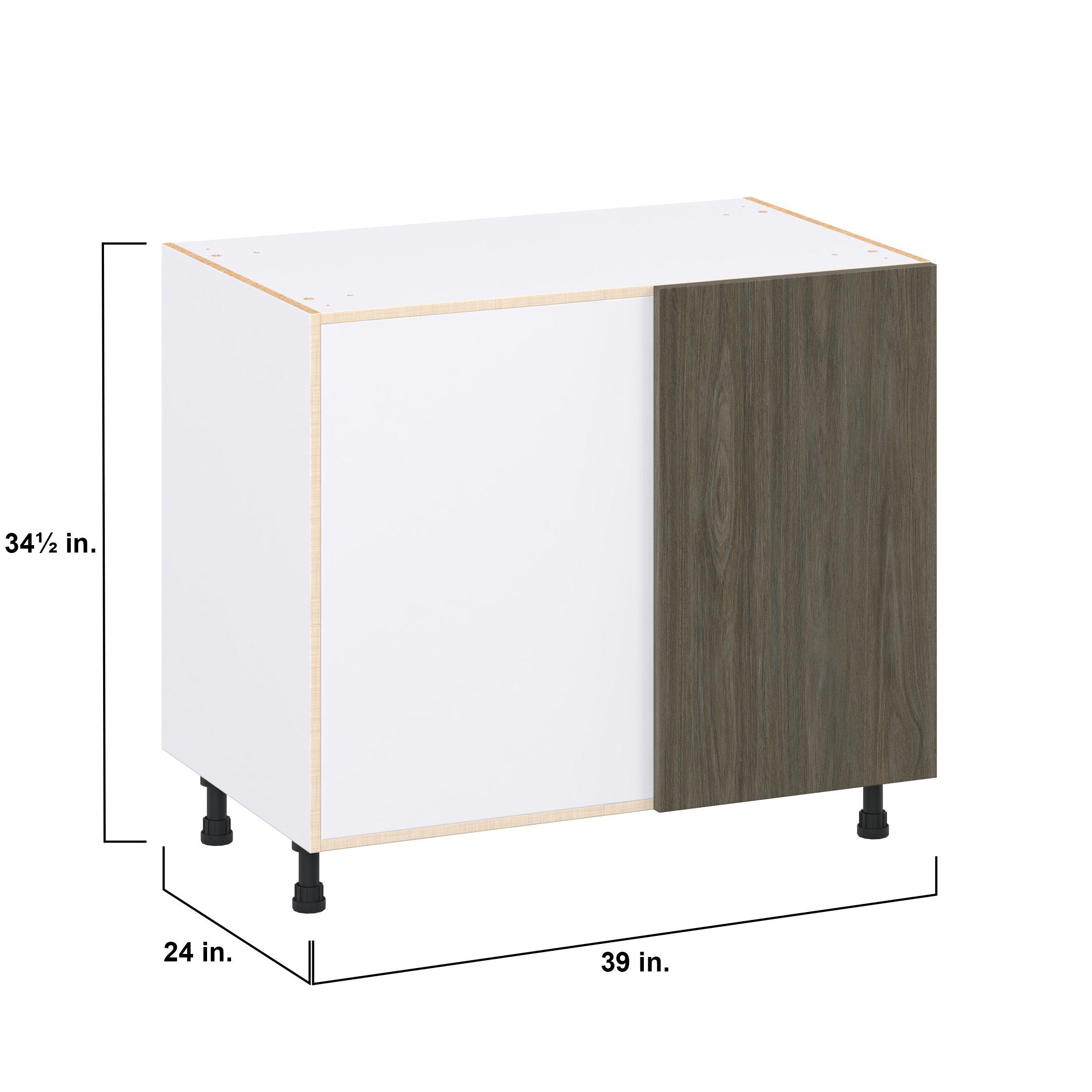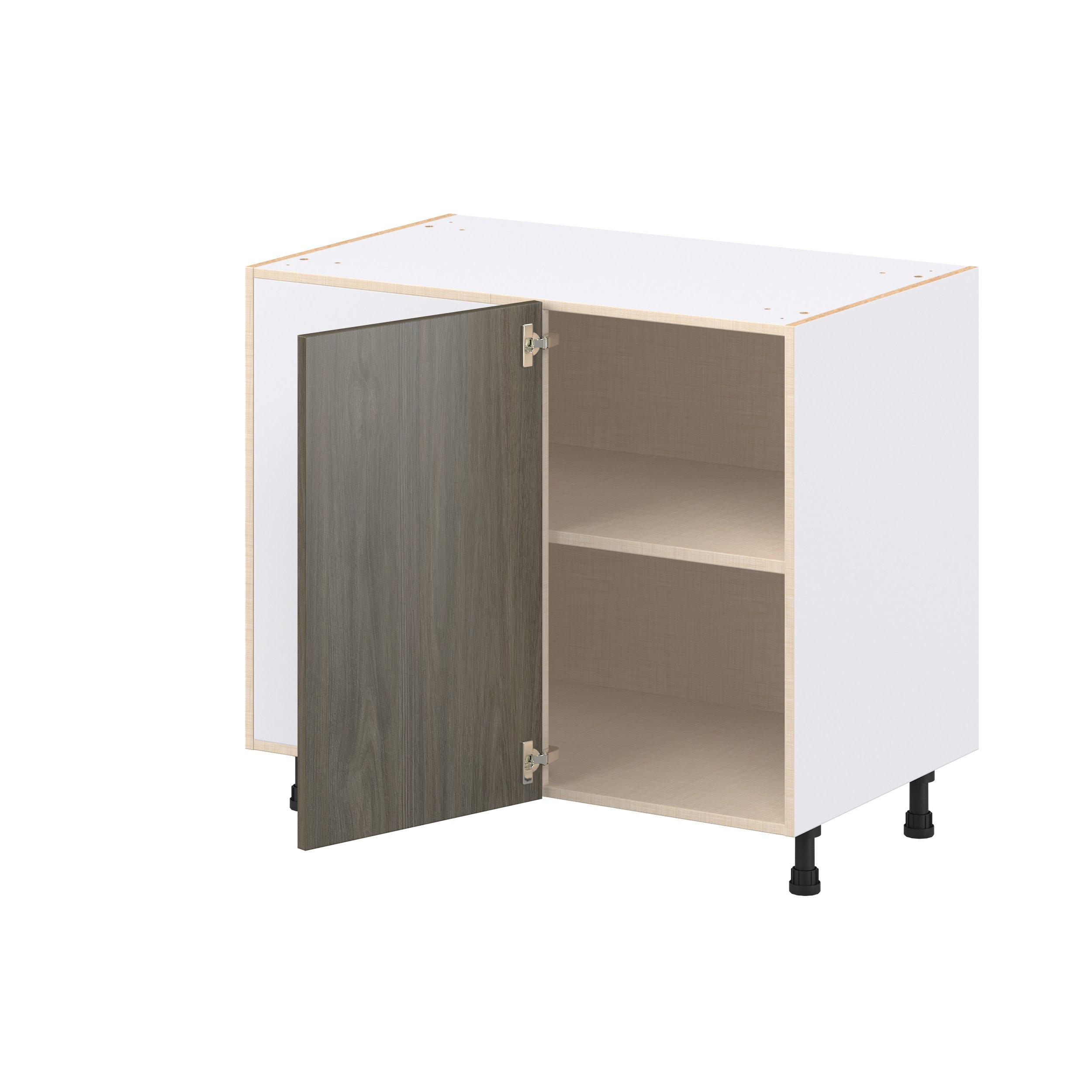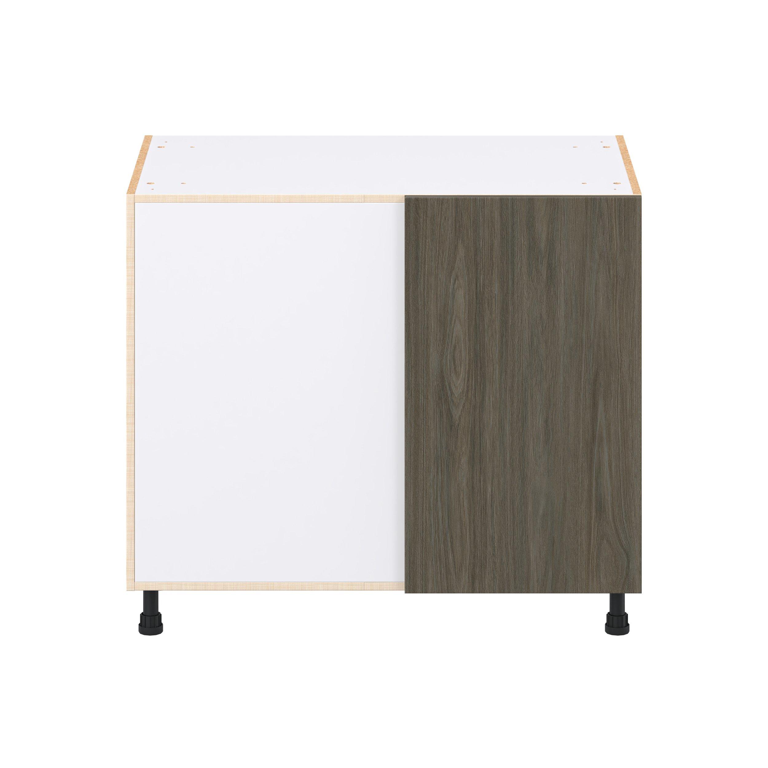 Elevate your project with the contemporary charm of Glenwood slab-style cabinets. Available in desert Mojavi oak and rich burnt walnut finishes, this collection captures the warmth and beauty of natural wood with the practicality of textured melamine. Crafted from one-piece MDF Studio Design Collection Glenwood 39 in. Burnt Walnut Blind Corner Base Cabinet is designed to resist hairline cracks while the easy-to-clean finish stands up to stains and moisture. Featuring 5-piece doors and dovetail drawer joints, these cabinets offer durability and elegance. This collection combines style with everyday storage solutions.