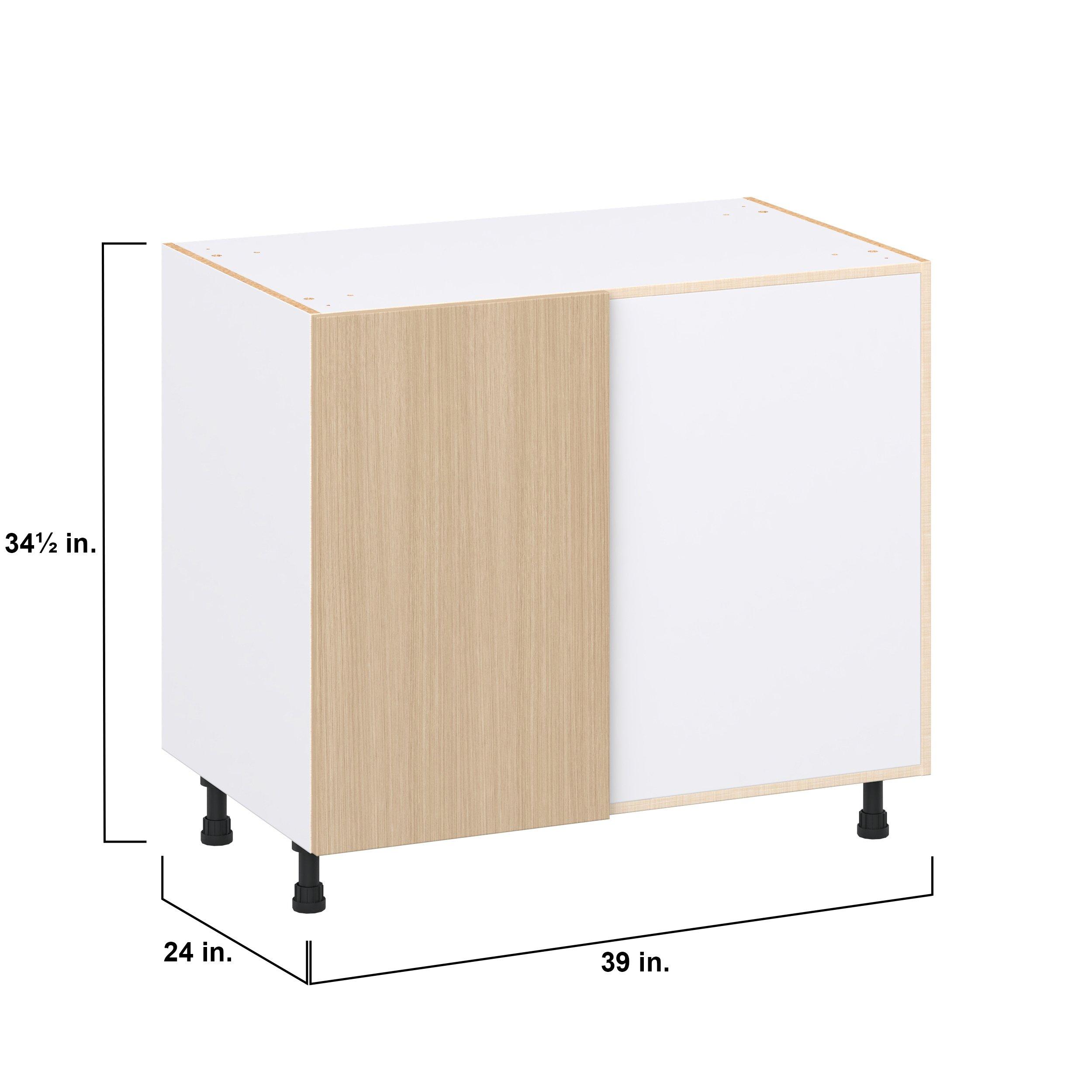Elevate your project with the contemporary charm of Glenwood slab-style cabinets. Available in desert Mojavi oak and rich burnt walnut finishes, this collection captures the warmth and beauty of natural wood with the practicality of textured melamine. Crafted from one-piece MDF Studio Design Collection Glenwood 39 in. Mojavi Oak Blind Corner Base Cabinet is designed to resist hairline cracks while the easy-to-clean finish stands up to stains and moisture. Featuring 5-piece doors and dovetail drawer joints, these cabinets offer durability and elegance. This collection combines style with everyday storage solutions.