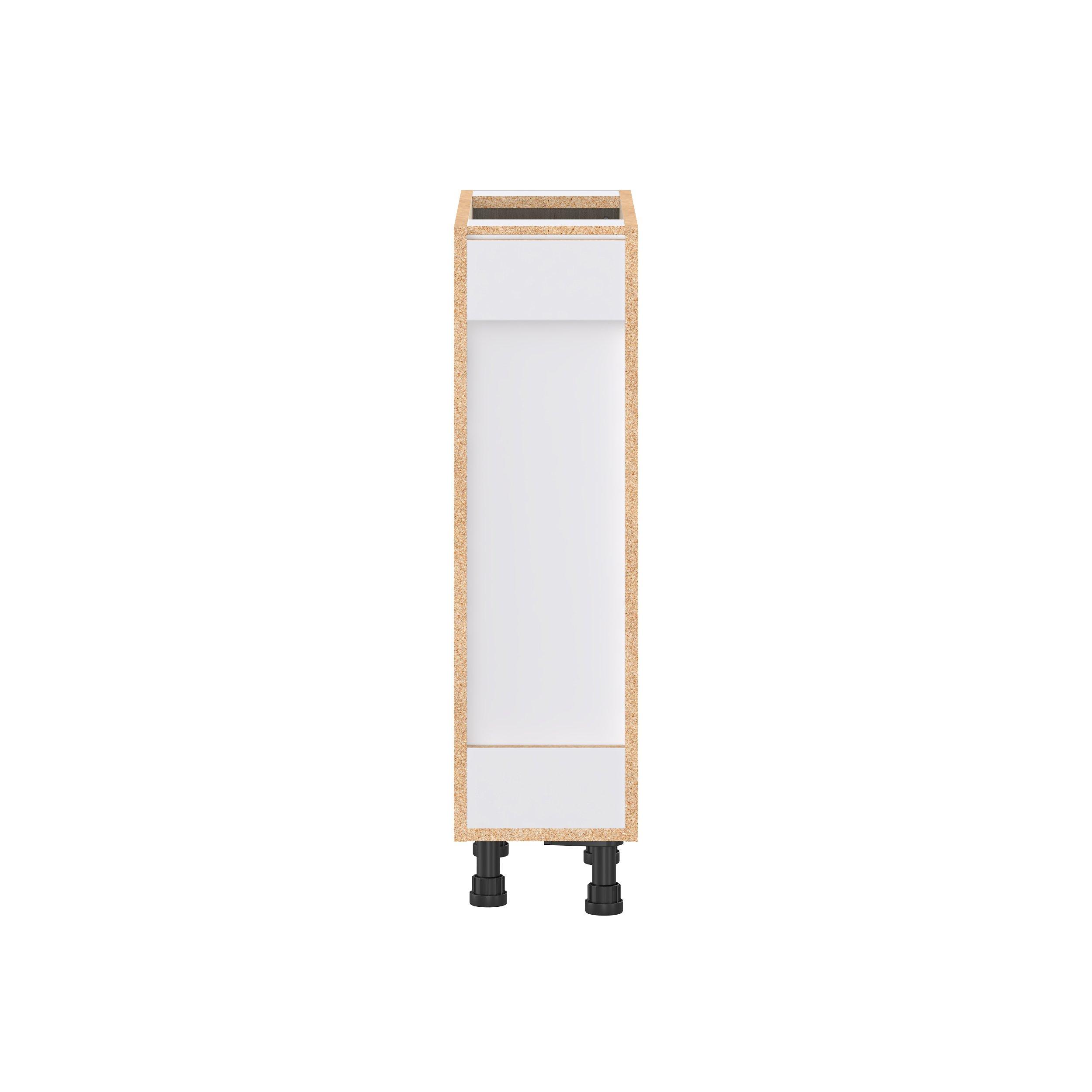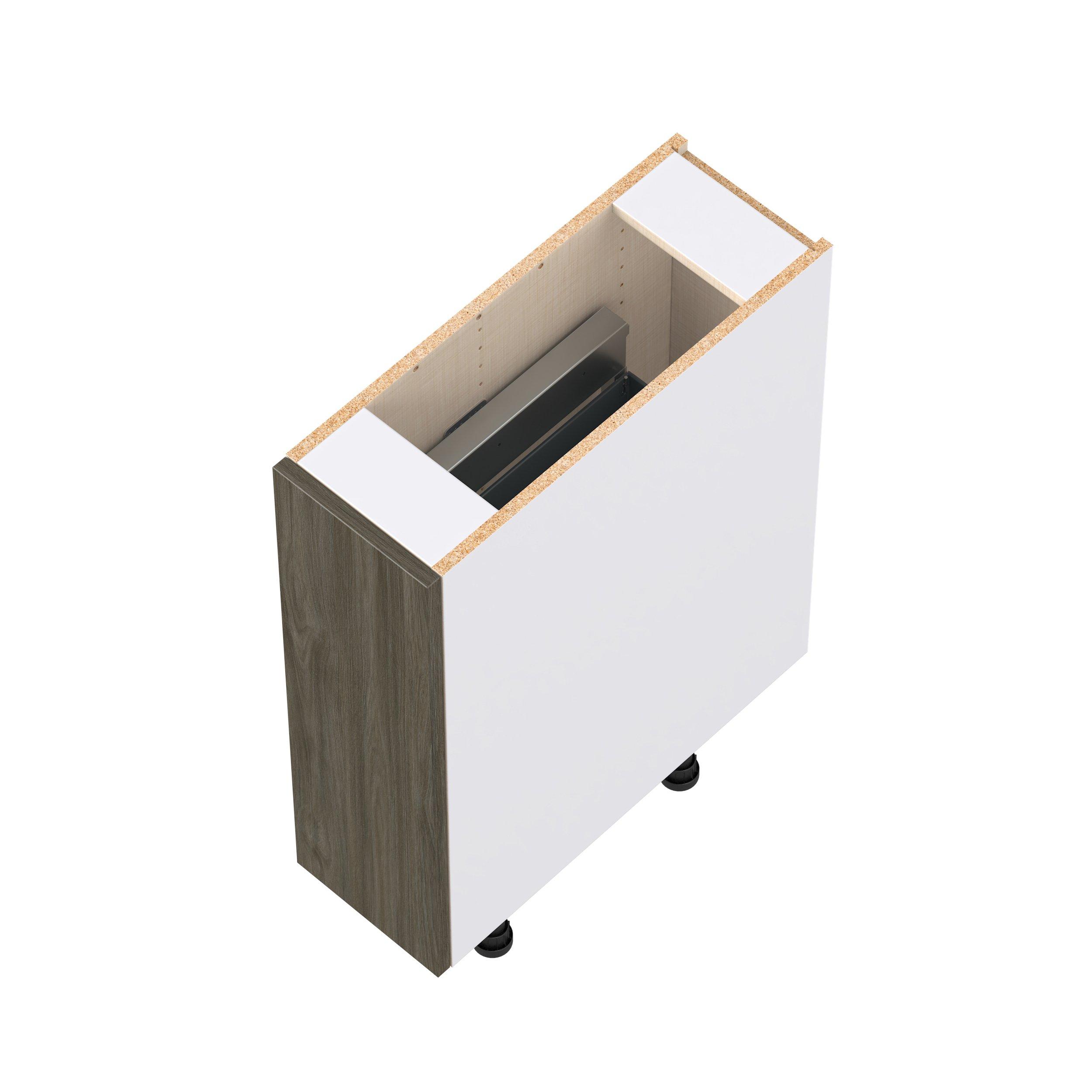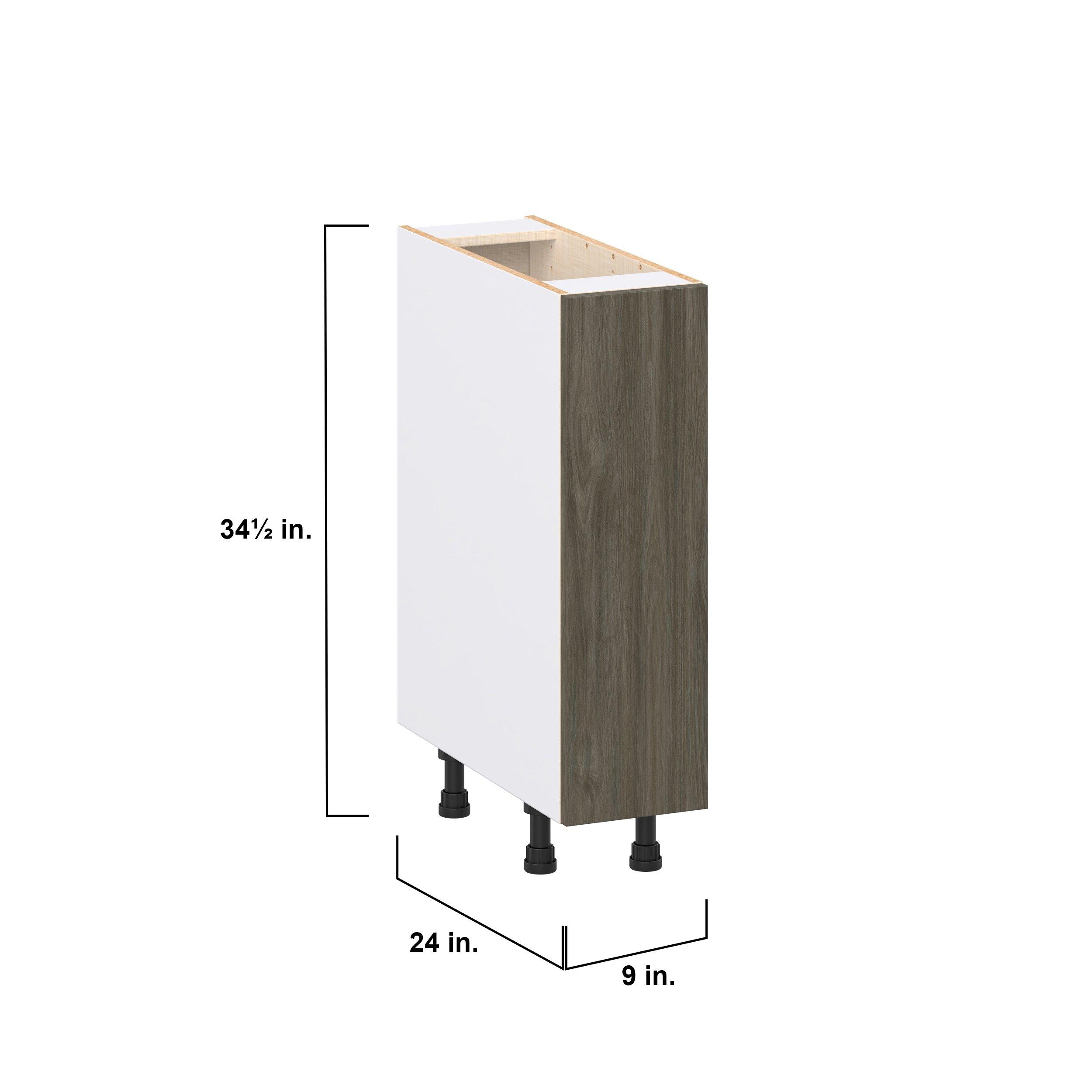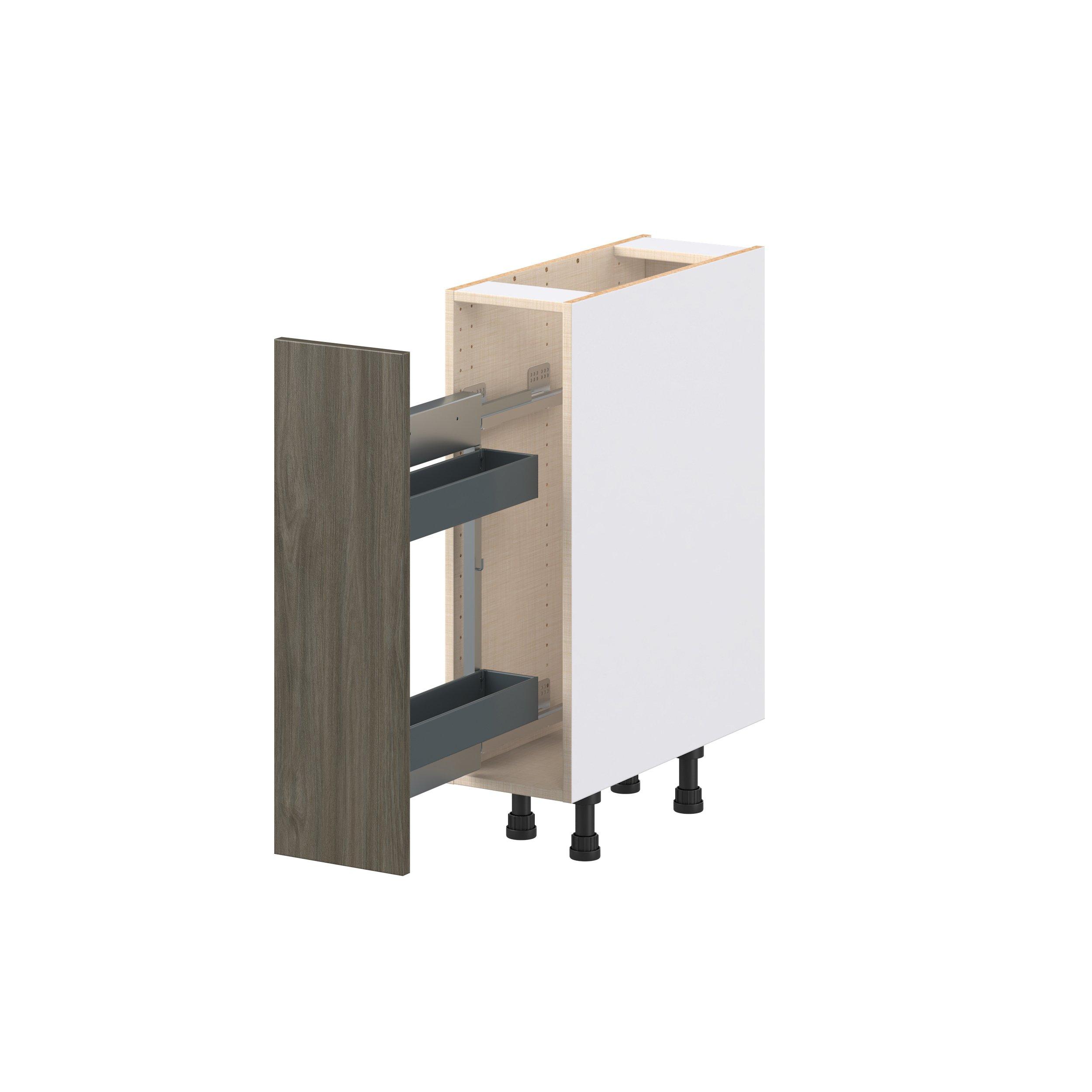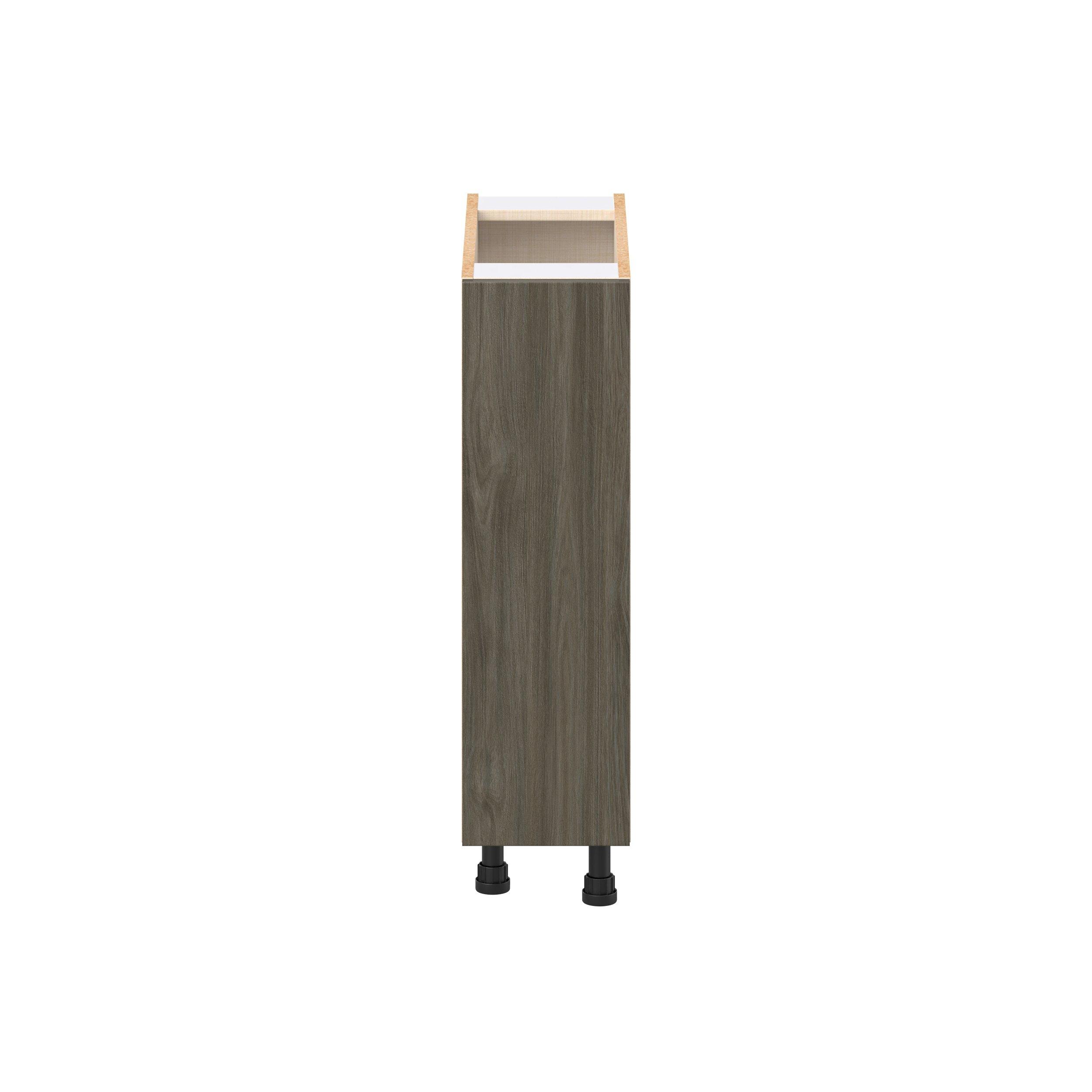 Elevate your project with the contemporary charm of Glenwood slab-style cabinets. Available in desert Mojavi oak and rich burnt walnut finishes, this collection captures the warmth and beauty of natural wood with the practicality of textured melamine. Crafted from one-piece MDF Studio Design Collection Glenwood 9 in. Burnt Walnut Spice Rack Pull-Out Base Cabinet is designed to resist hairline cracks while the easy-to-clean finish stands up to stains and moisture. Featuring 5-piece doors and dovetail drawer joints, these cabinets offer durability and elegance. This collection combines style with everyday storage solutions.