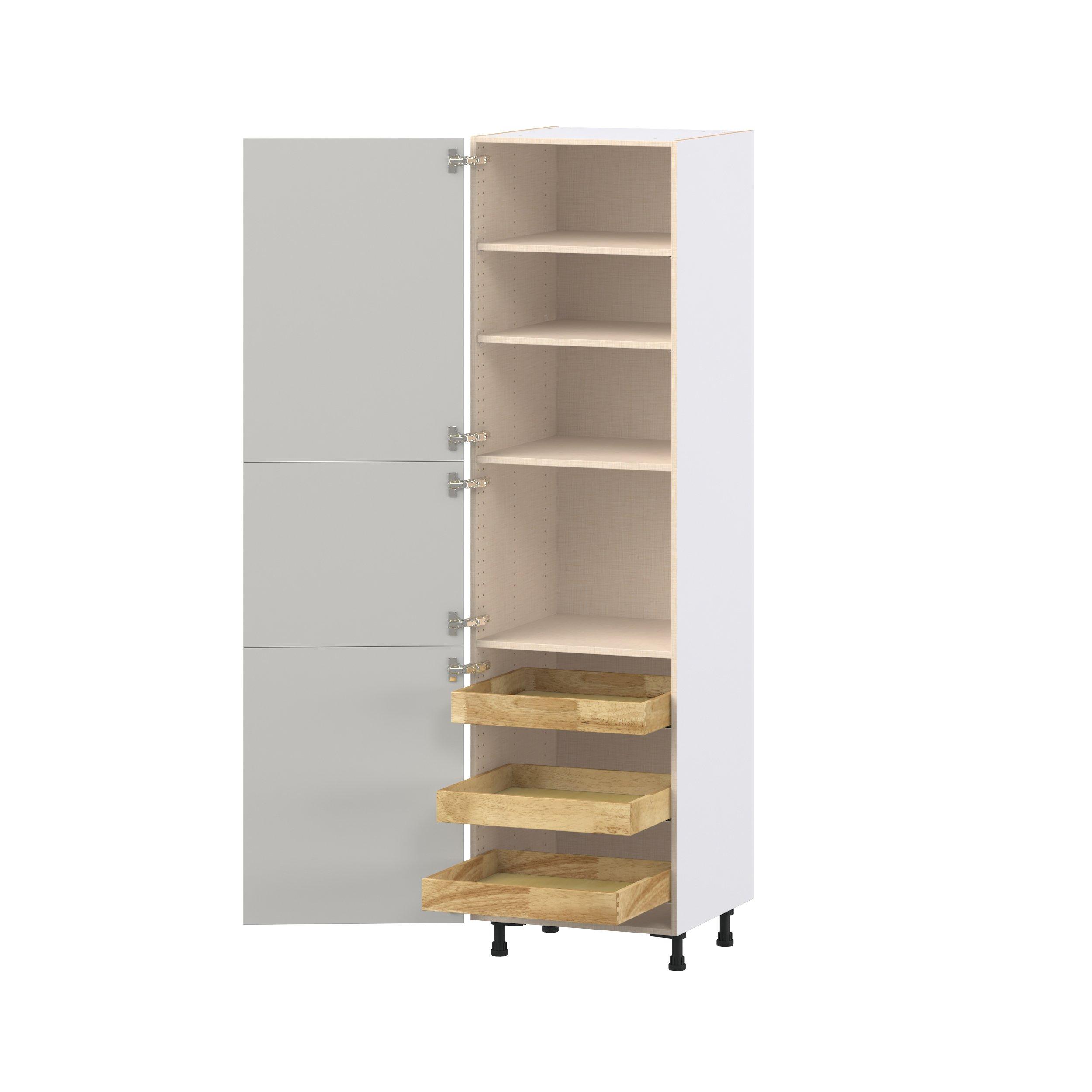 Treat yourself to the refined charm of Lenox shaker-inspired cabinets. Featuring a high-quality premium painted light gray finish, this collection offers sophistication that’s truly built to endure. Crafted from one-piece MDF Studio Design Collection Lenox 24 in. Painted Light Gray Pantry Cabinet with Inner Pull-Out Drawer is designed to resist hairline cracks while the easy-to-clean finish stands up to stains and moisture. Featuring 5-piece doors and dovetail drawer joints, these cabinets offer durability and elegance. This collection combines style with everyday storage solutions.