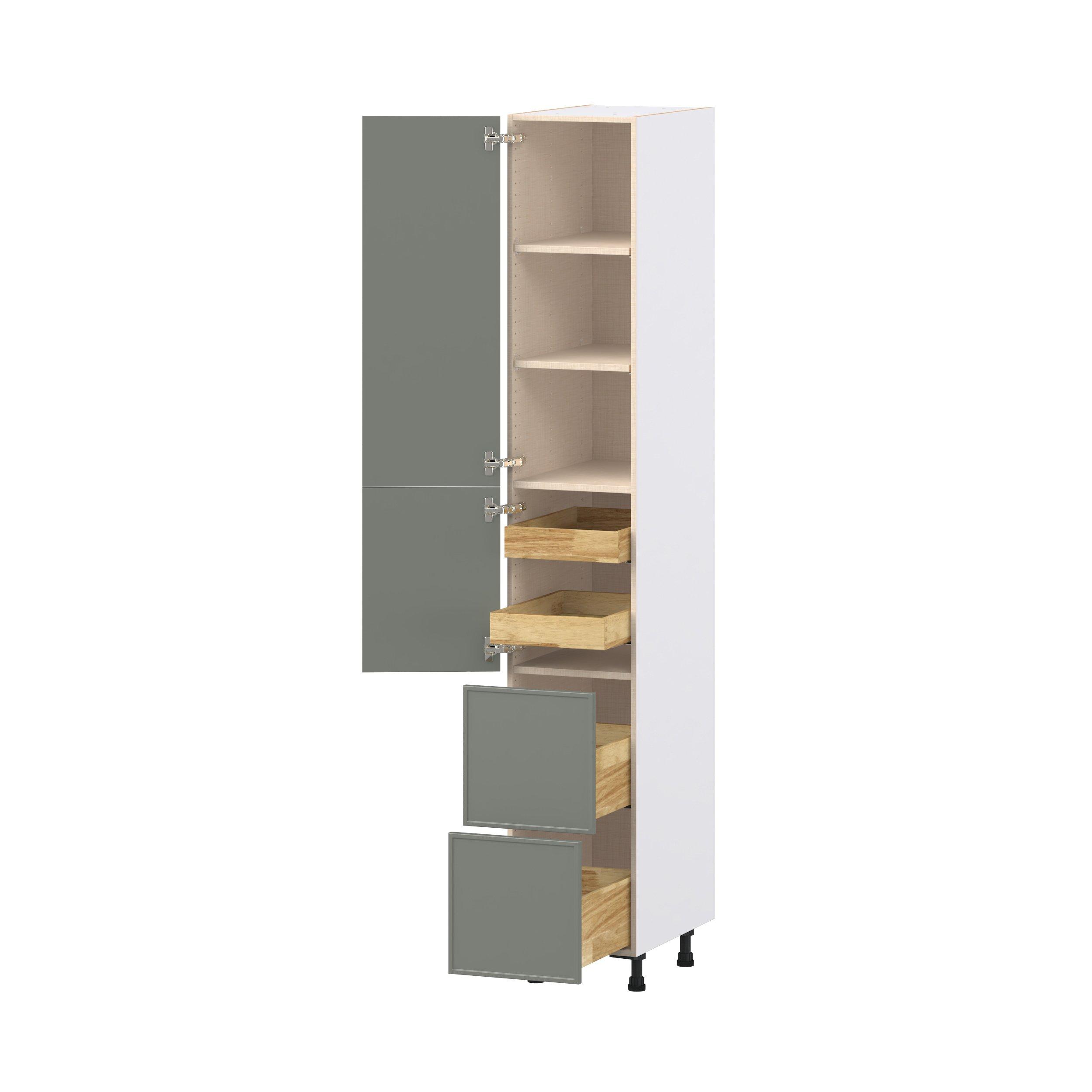 Enjoy a modern twist on a classic with Linden slim shaker cabinets. Available in premium-painted fresh washed linen and earthy moss green finishes, this collection exudes warmth and creates an inviting atmosphere Crafted from one-piece MDF Studio Design Collection Linden 15 in. Painted Moss Green Door and Drawer Pantry Cabinet with Inner Pull-Out is designed to resist hairline cracks while the easy-to-clean finish stands up to stains and moisture. Featuring 5-piece doors and dovetail drawer joints, these cabinets offer durability and elegance. This collection combines style with everyday storage solutions.