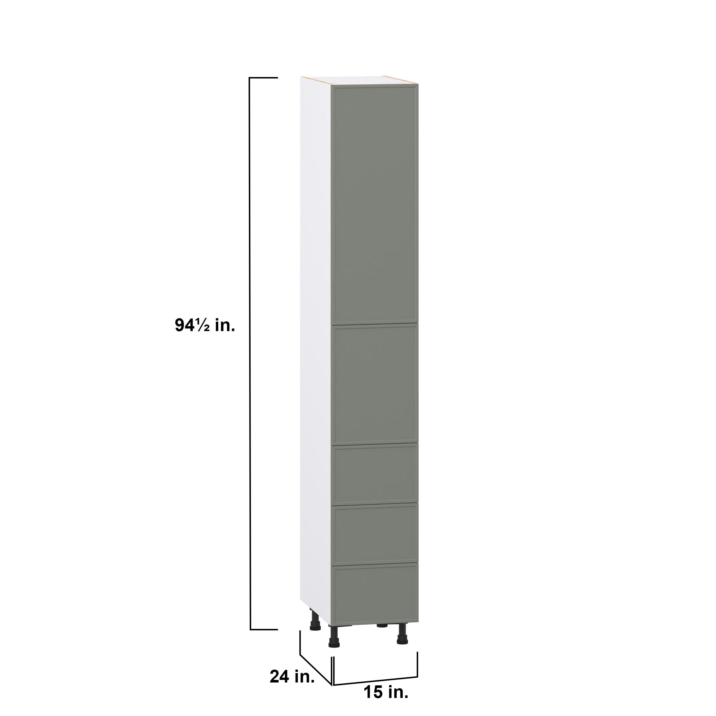 Enjoy a modern twist on a classic with Linden slim shaker cabinets. Available in premium-painted fresh washed linen and earthy moss green finishes, this collection exudes warmth and creates an inviting atmosphere Crafted from one-piece MDF Studio Design Collection Linden 15 in. Painted Moss Green Door and Drawer Pantry Cabinet with Inner Pull-Out is designed to resist hairline cracks while the easy-to-clean finish stands up to stains and moisture. Featuring 5-piece doors and dovetail drawer joints, these cabinets offer durability and elegance. This collection combines style with everyday storage solutions.