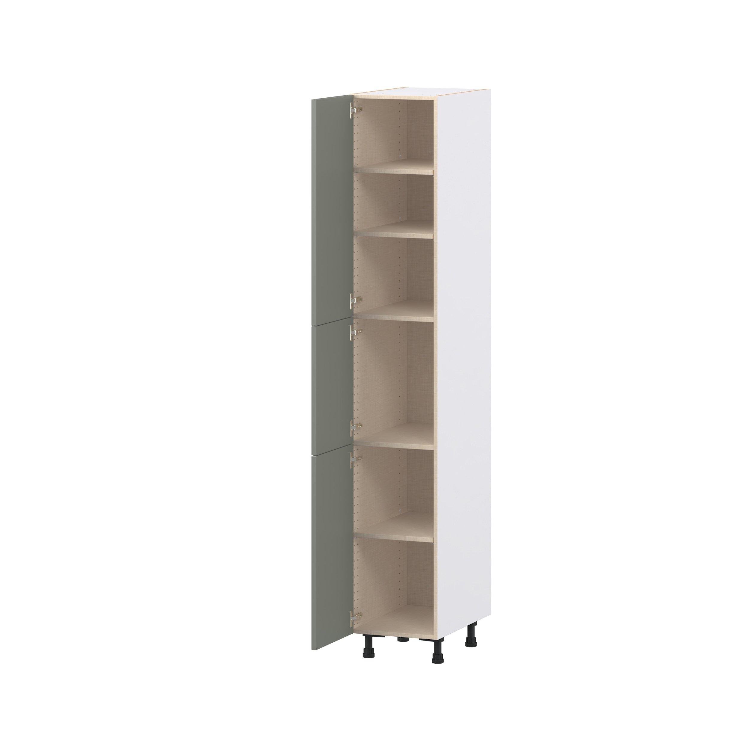 Enjoy a modern twist on a classic with Linden slim shaker cabinets. Available in premium-painted fresh washed linen and earthy moss green finishes, this collection exudes warmth and creates an inviting atmosphere Crafted from one-piece MDF Studio Design Collection Linden 15 in. Painted Moss Green Door Pantry Cabinet is designed to resist hairline cracks while the easy-to-clean finish stands up to stains and moisture. Featuring 5-piece doors and dovetail drawer joints, these cabinets offer durability and elegance. This collection combines style with everyday storage solutions.