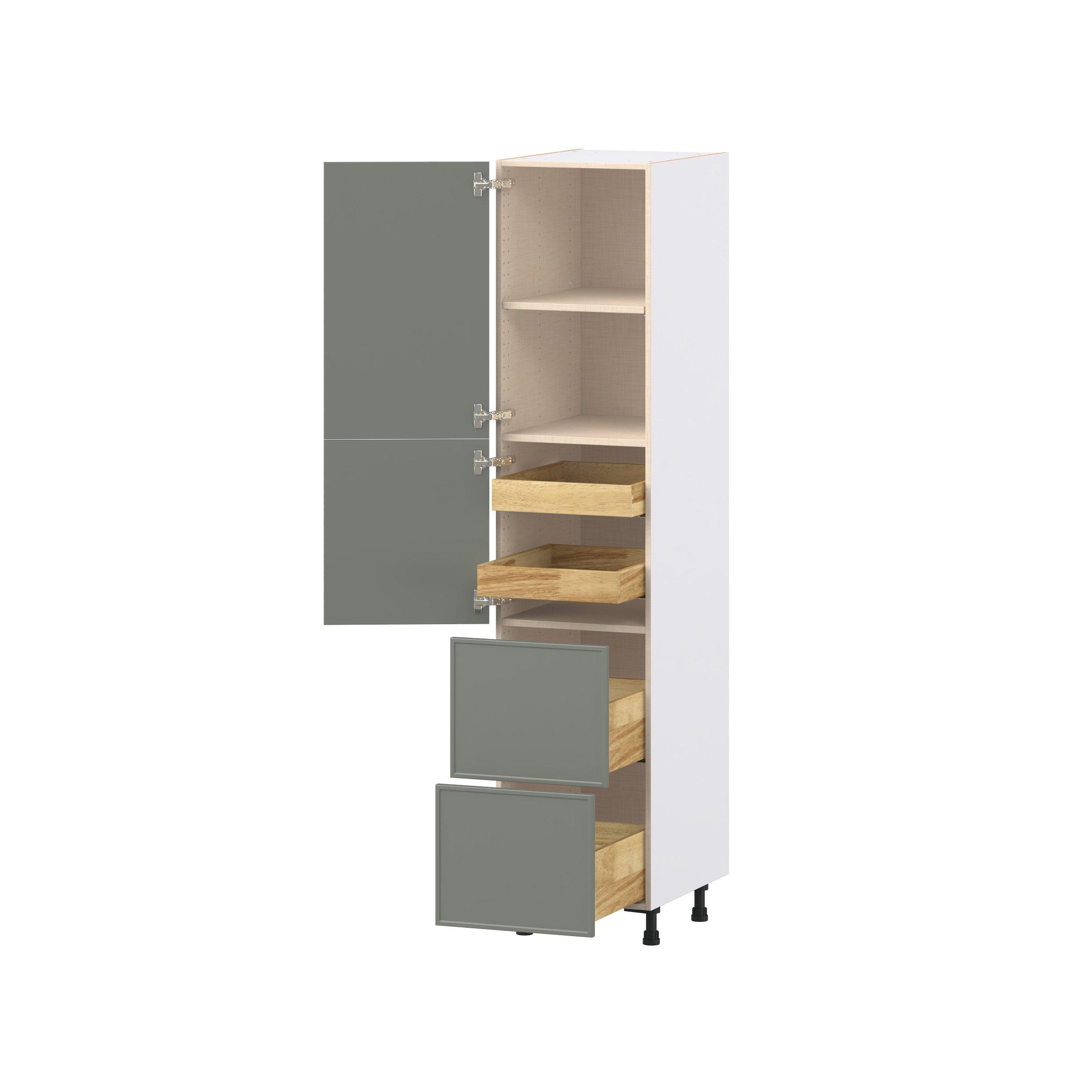 Enjoy a modern twist on a classic with Linden slim shaker cabinets. Available in premium-painted fresh washed linen and earthy moss green finishes, this collection exudes warmth and creates an inviting atmosphere Crafted from one-piece MDF Studio Design Collection Linden 18 in. Painted Moss Green Door and Drawer Pantry Cabinet with Inner Pull-Out is designed to resist hairline cracks while the easy-to-clean finish stands up to stains and moisture. Featuring 5-piece doors and dovetail drawer joints, these cabinets offer durability and elegance. This collection combines style with everyday storage solutions.