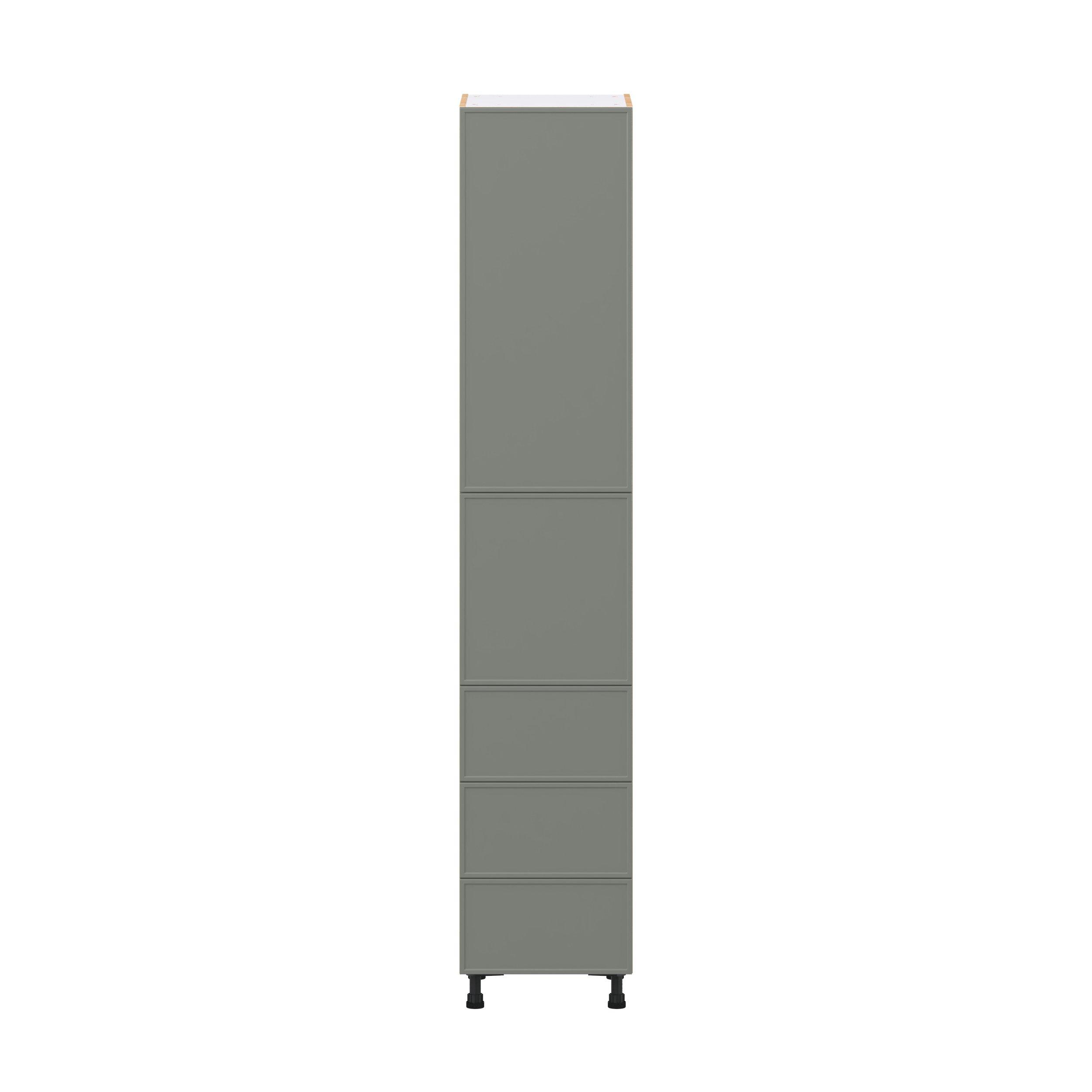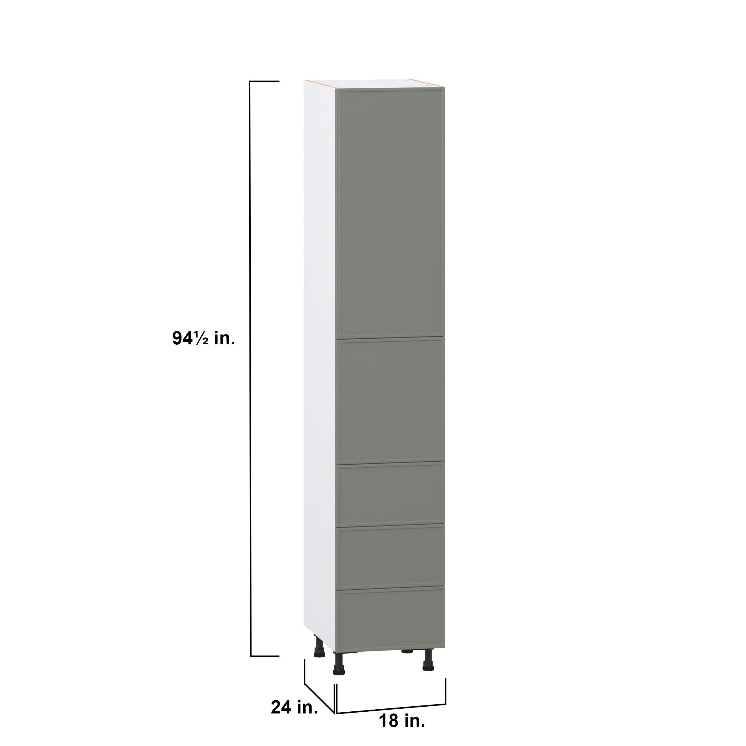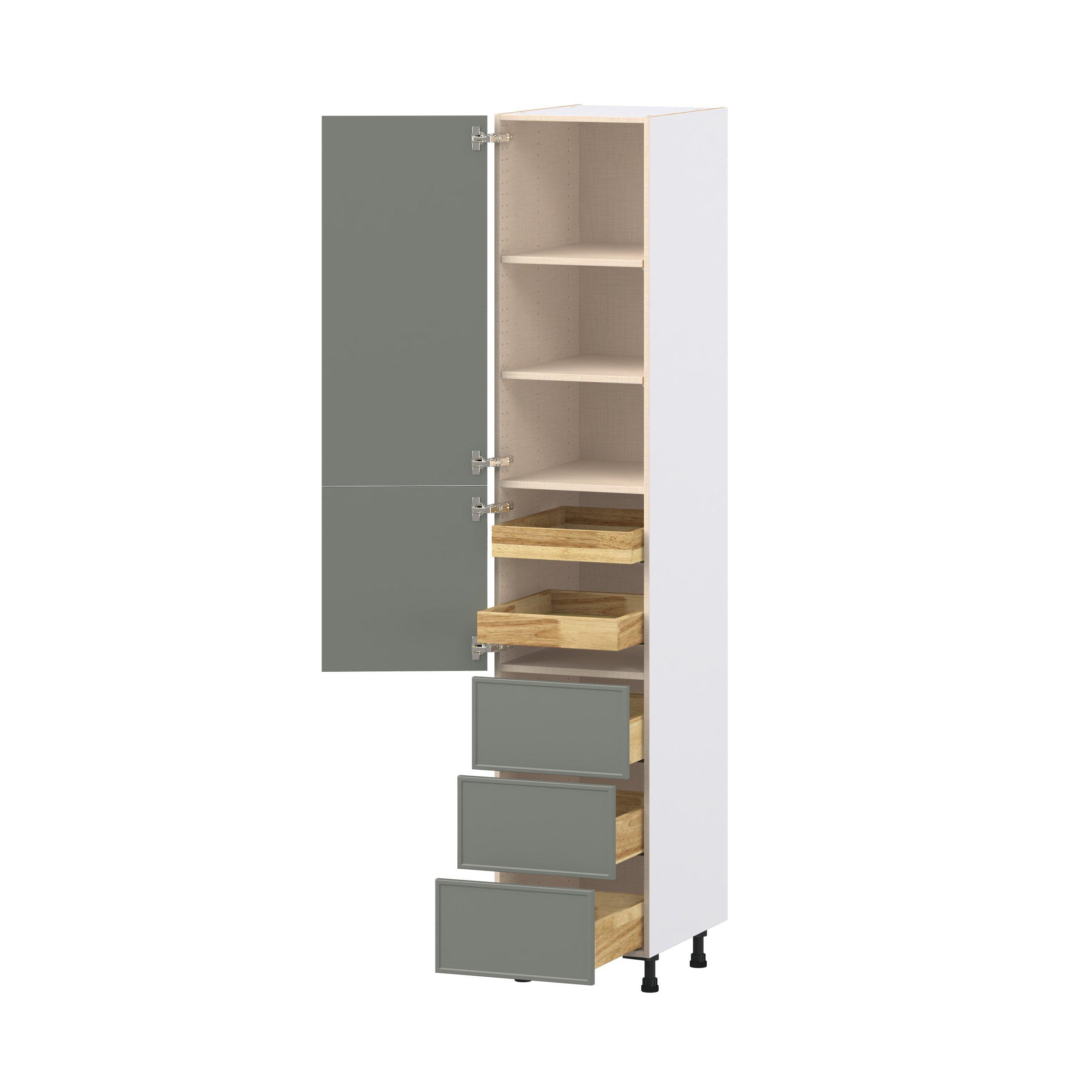 Enjoy a modern twist on a classic with Linden slim shaker cabinets. Available in premium-painted fresh washed linen and earthy moss green finishes, this collection exudes warmth and creates an inviting atmosphere Crafted from one-piece MDF Studio Design Collection Linden 18 in. Painted Moss Green Door and Drawer Pantry Cabinet with Inner Pull-Out is designed to resist hairline cracks while the easy-to-clean finish stands up to stains and moisture. Featuring 5-piece doors and dovetail drawer joints, these cabinets offer durability and elegance. This collection combines style with everyday storage solutions.