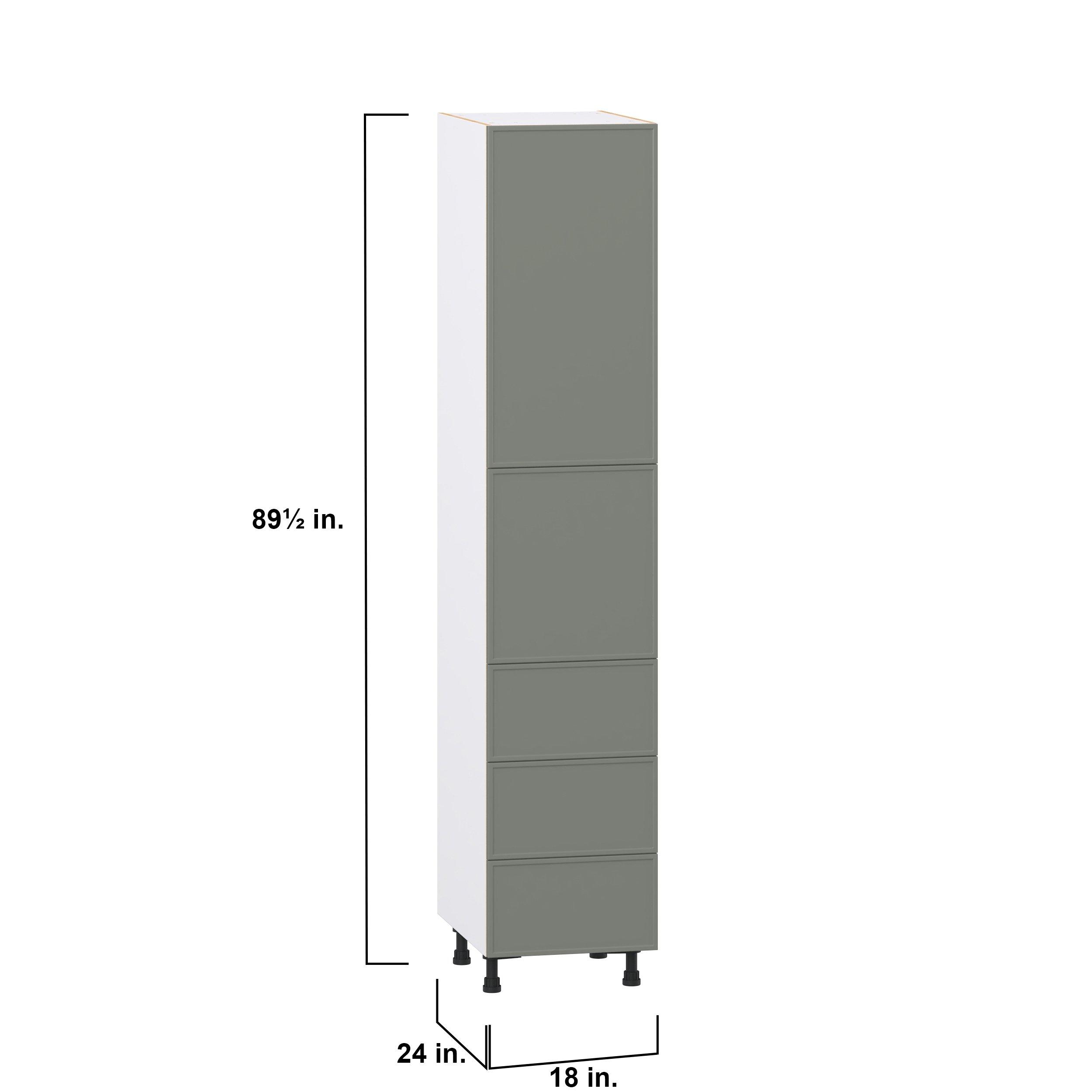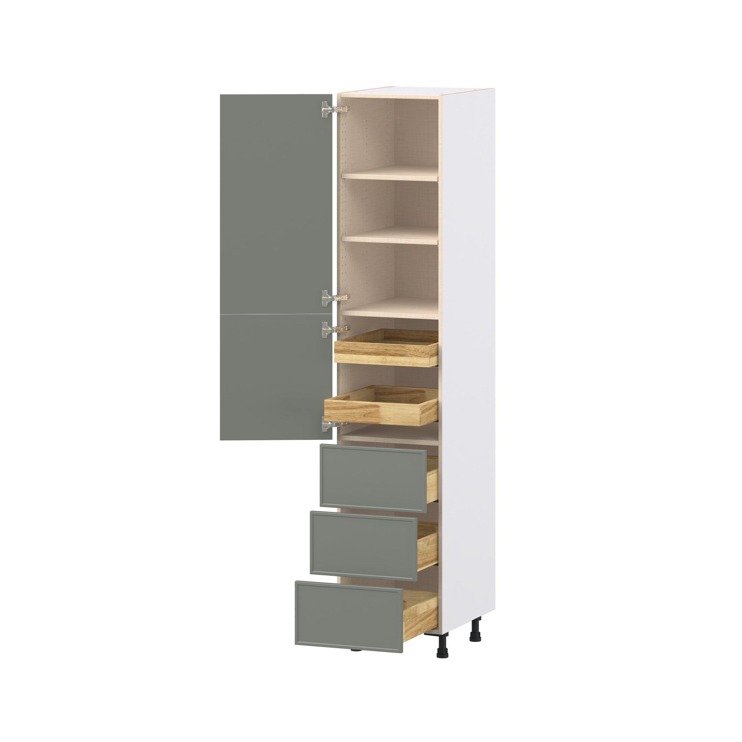 Enjoy a modern twist on a classic with Linden slim shaker cabinets. Available in premium-painted fresh washed linen and earthy moss green finishes, this collection exudes warmth and creates an inviting atmosphere Crafted from one-piece MDF Studio Design Collection Linden 18 in. Painted Moss Green Door and Drawer Pantry Cabinet with Inner Pull-Out is designed to resist hairline cracks while the easy-to-clean finish stands up to stains and moisture. Featuring 5-piece doors and dovetail drawer joints, these cabinets offer durability and elegance. This collection combines style with everyday storage solutions.