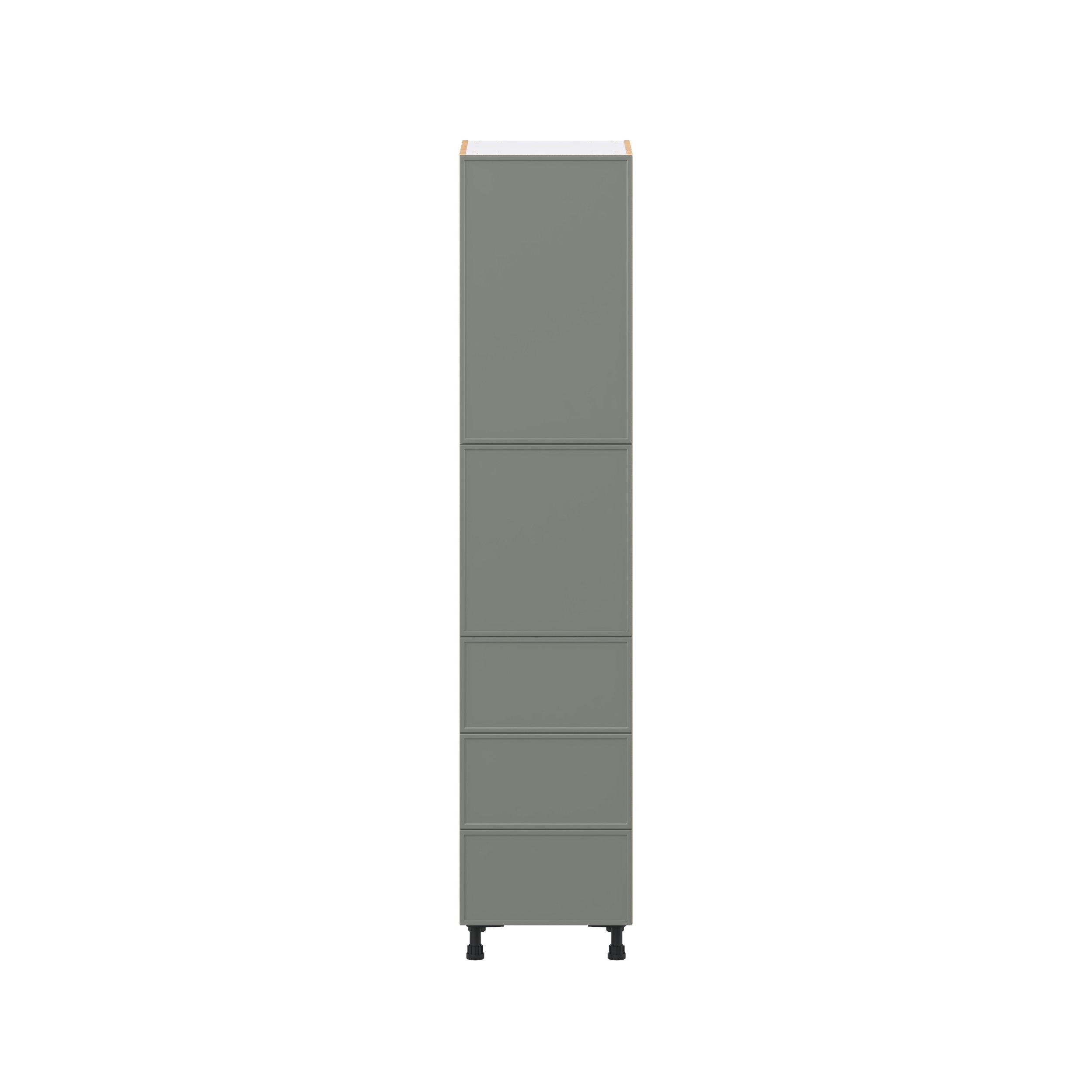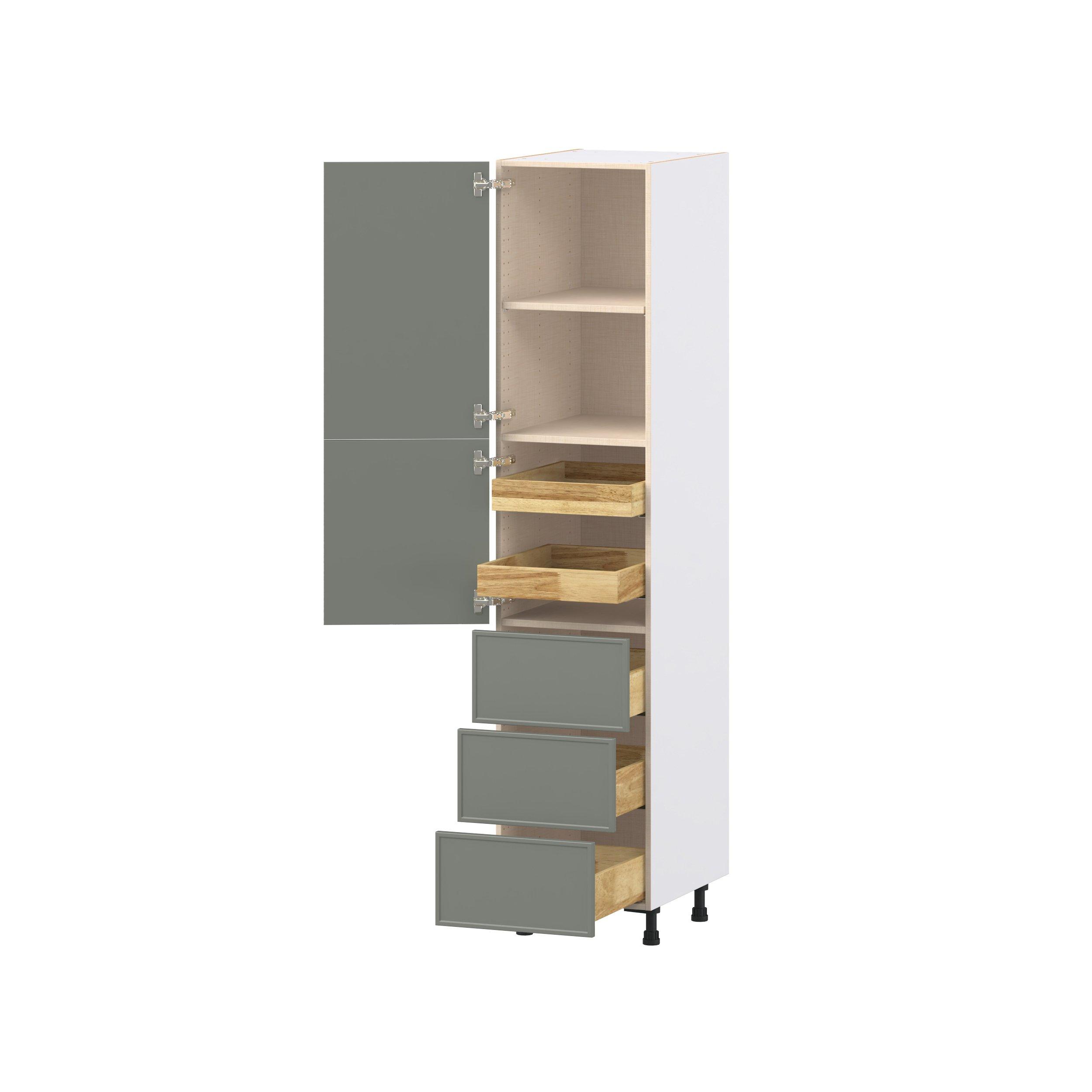 Enjoy a modern twist on a classic with Linden slim shaker cabinets. Available in premium-painted fresh washed linen and earthy moss green finishes, this collection exudes warmth and creates an inviting atmosphere Crafted from one-piece MDF Studio Design Collection Linden 18 in. Painted Moss Green Door and Drawer Pantry Cabinet with Inner Pull-Out is designed to resist hairline cracks while the easy-to-clean finish stands up to stains and moisture. Featuring 5-piece doors and dovetail drawer joints, these cabinets offer durability and elegance. This collection combines style with everyday storage solutions.