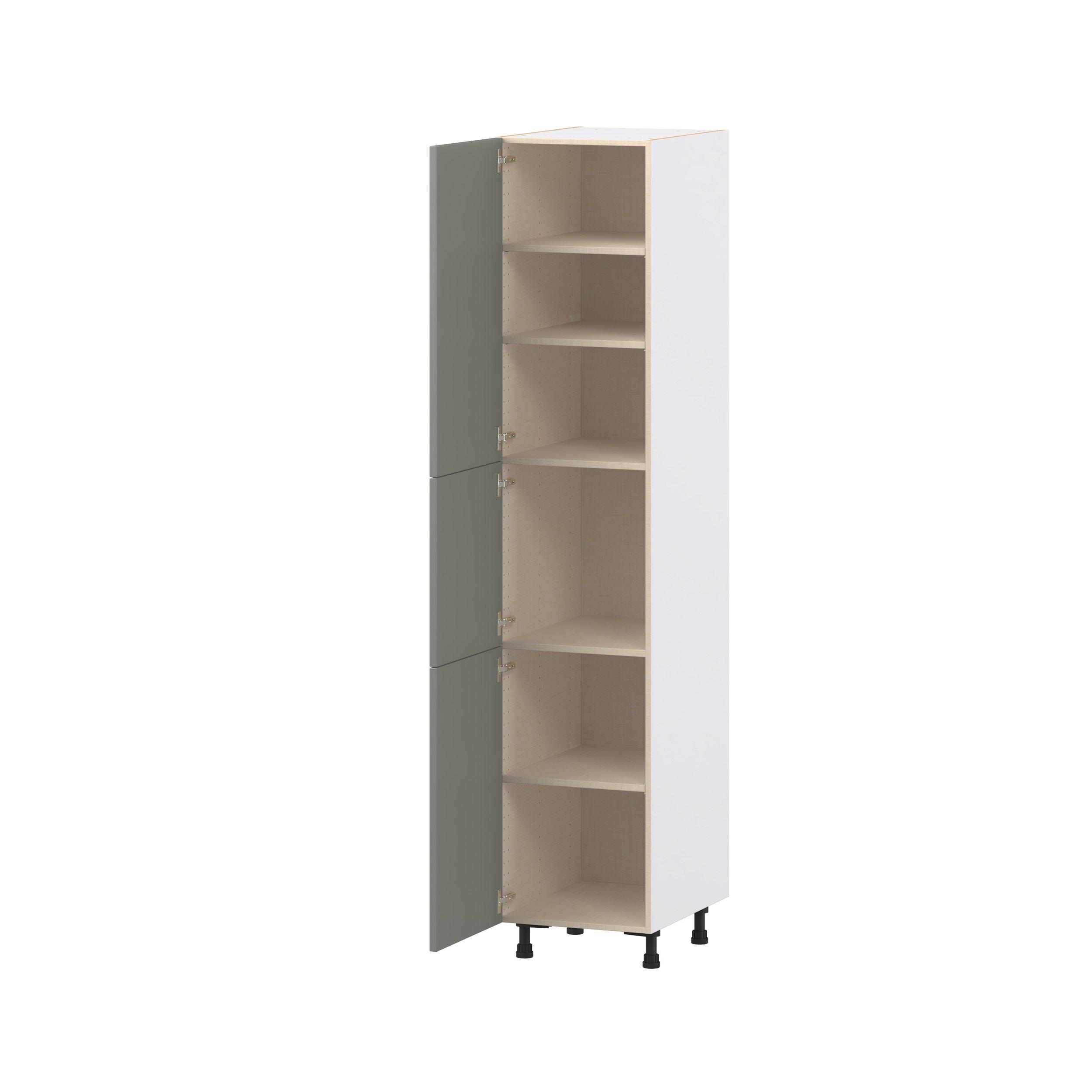 Enjoy a modern twist on a classic with Linden slim shaker cabinets. Available in premium-painted fresh washed linen and earthy moss green finishes, this collection exudes warmth and creates an inviting atmosphere Crafted from one-piece MDF Studio Design Collection Linden 18 in. Painted Moss Green Door Pantry Cabinet is designed to resist hairline cracks while the easy-to-clean finish stands up to stains and moisture. Featuring 5-piece doors and dovetail drawer joints, these cabinets offer durability and elegance. This collection combines style with everyday storage solutions.