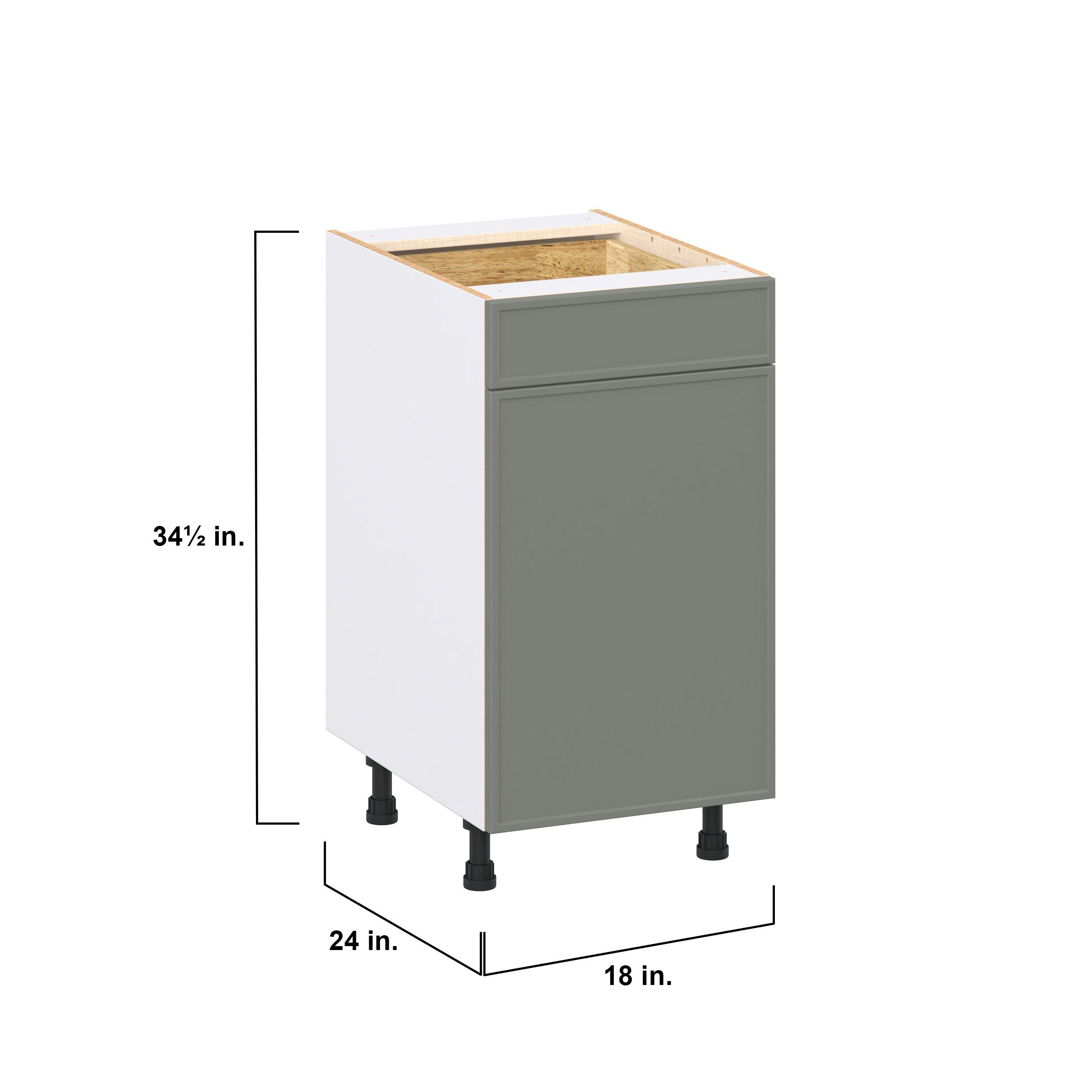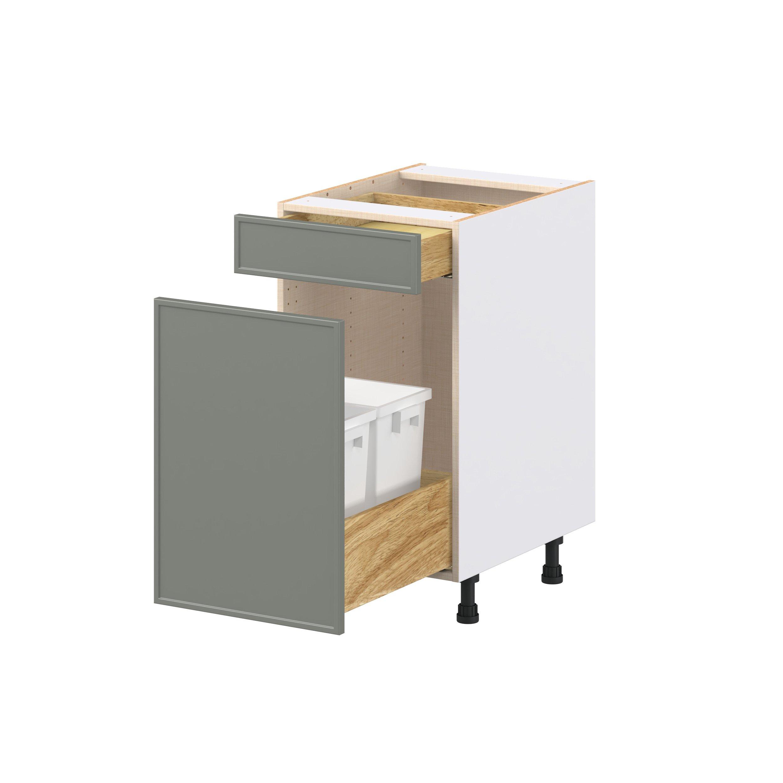 Enjoy a modern twist on a classic with Linden slim shaker cabinets. Available in premium-painted fresh washed linen and earthy moss green finishes, this collection exudes warmth and creates an inviting atmosphere Crafted from one-piece MDF Studio Design Collection Linden 18 in. Painted Moss Green Trash Can Pull-Out Base Cabinet is designed to resist hairline cracks while the easy-to-clean finish stands up to stains and moisture. Featuring 5-piece doors and dovetail drawer joints, these cabinets offer durability and elegance. This collection combines style with everyday storage solutions.