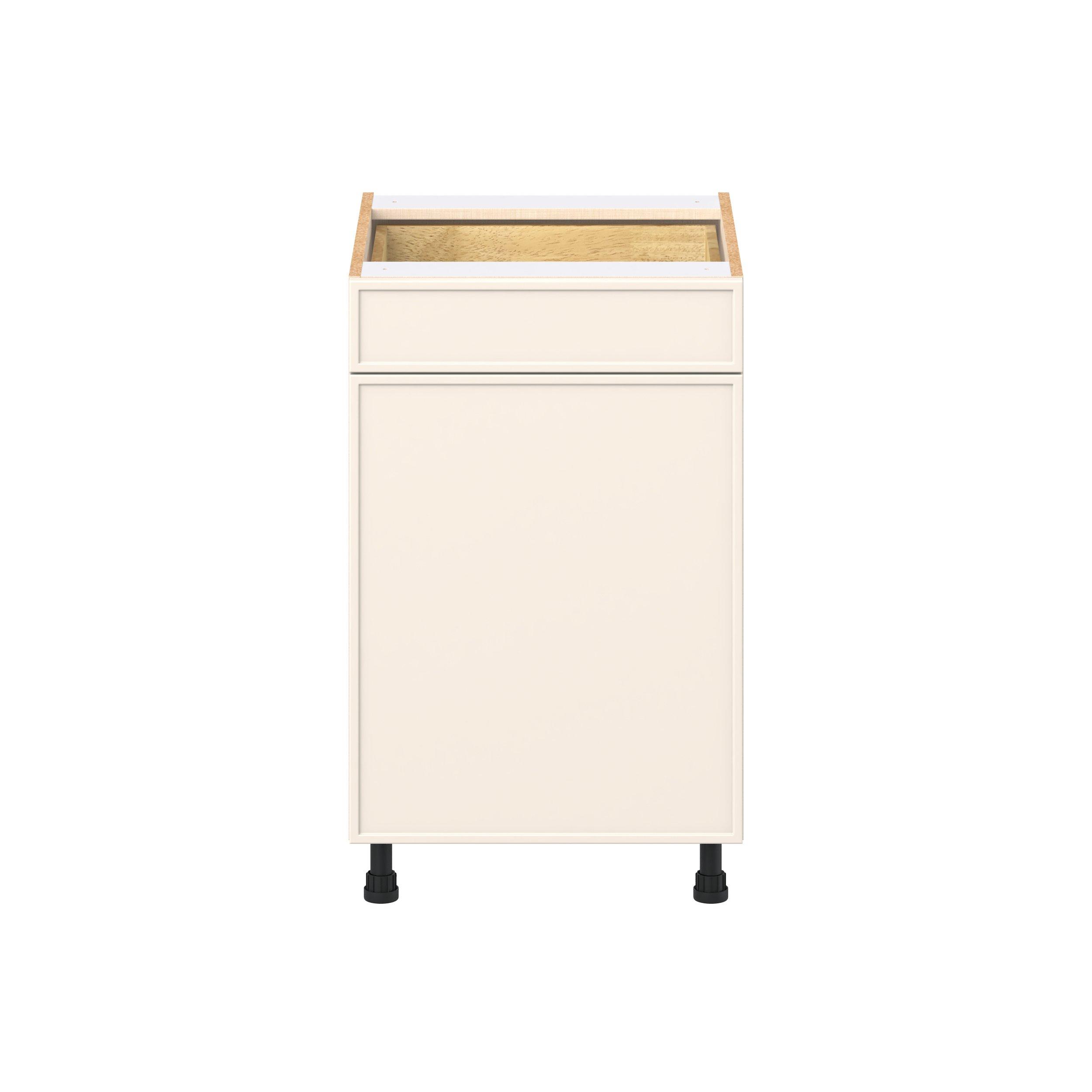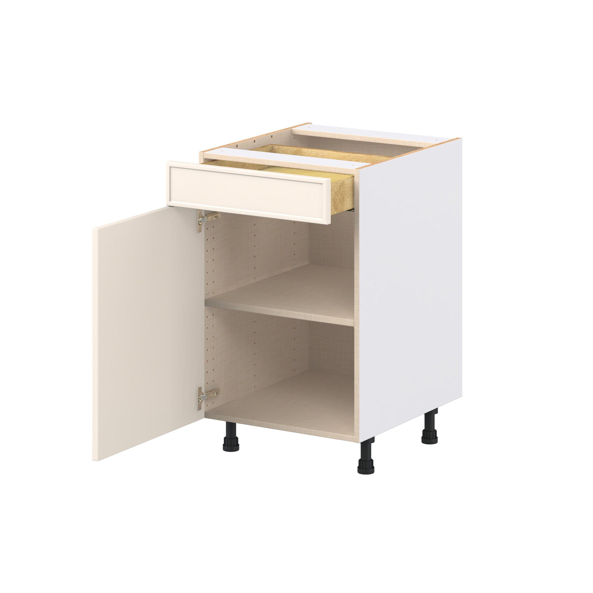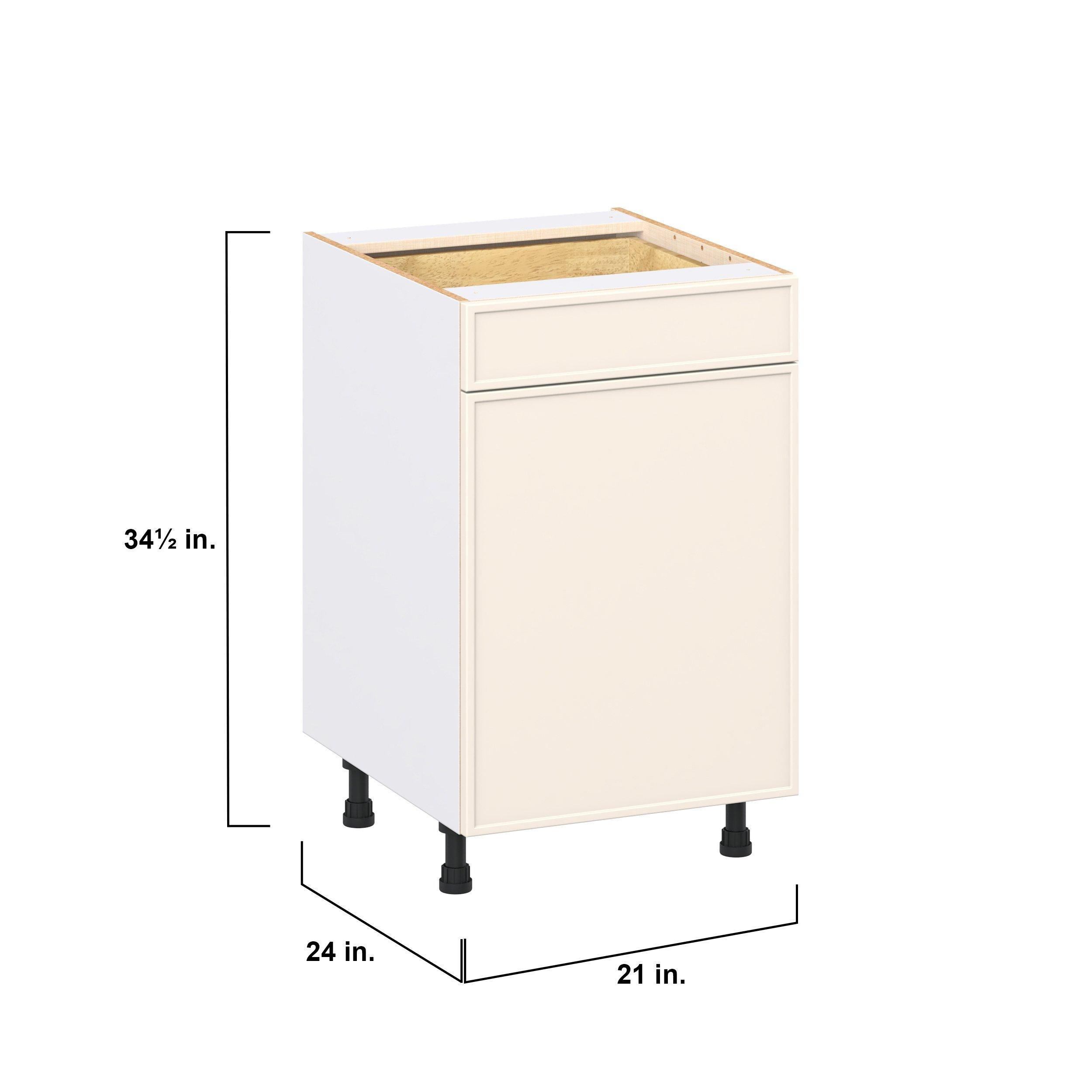 Enjoy a modern twist on a classic with Linden slim shaker cabinets. Available in premium-painted fresh washed linen and earthy moss green finishes, this collection exudes warmth and creates an inviting atmosphere Crafted from one-piece MDF Studio Design Collection Linden 21 in. Painted Washed Linen Door and Drawer Base Cabinet is designed to resist hairline cracks while the easy-to-clean finish stands up to stains and moisture. Featuring 5-piece doors and dovetail drawer joints, these cabinets offer durability and elegance. This collection combines style with everyday storage solutions.