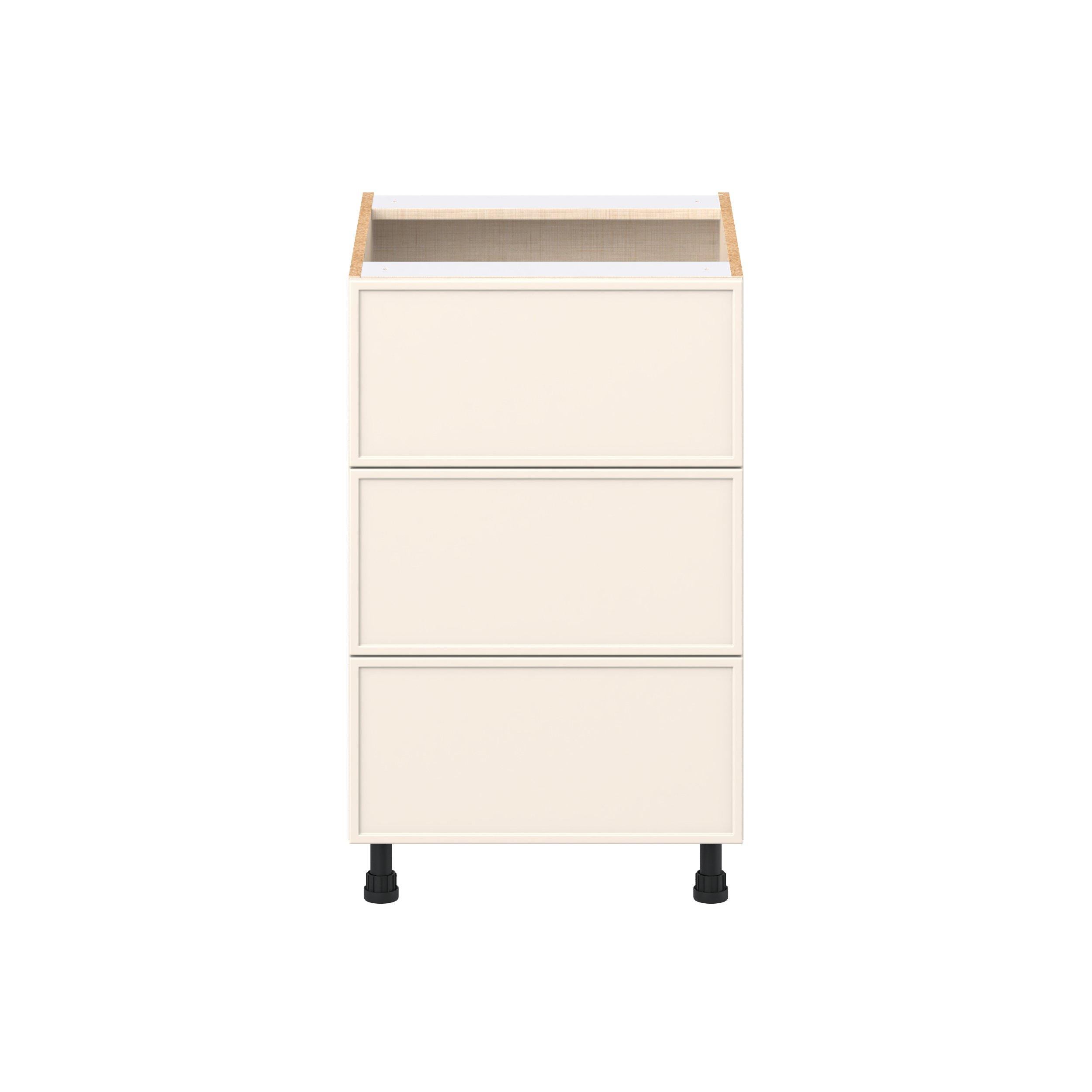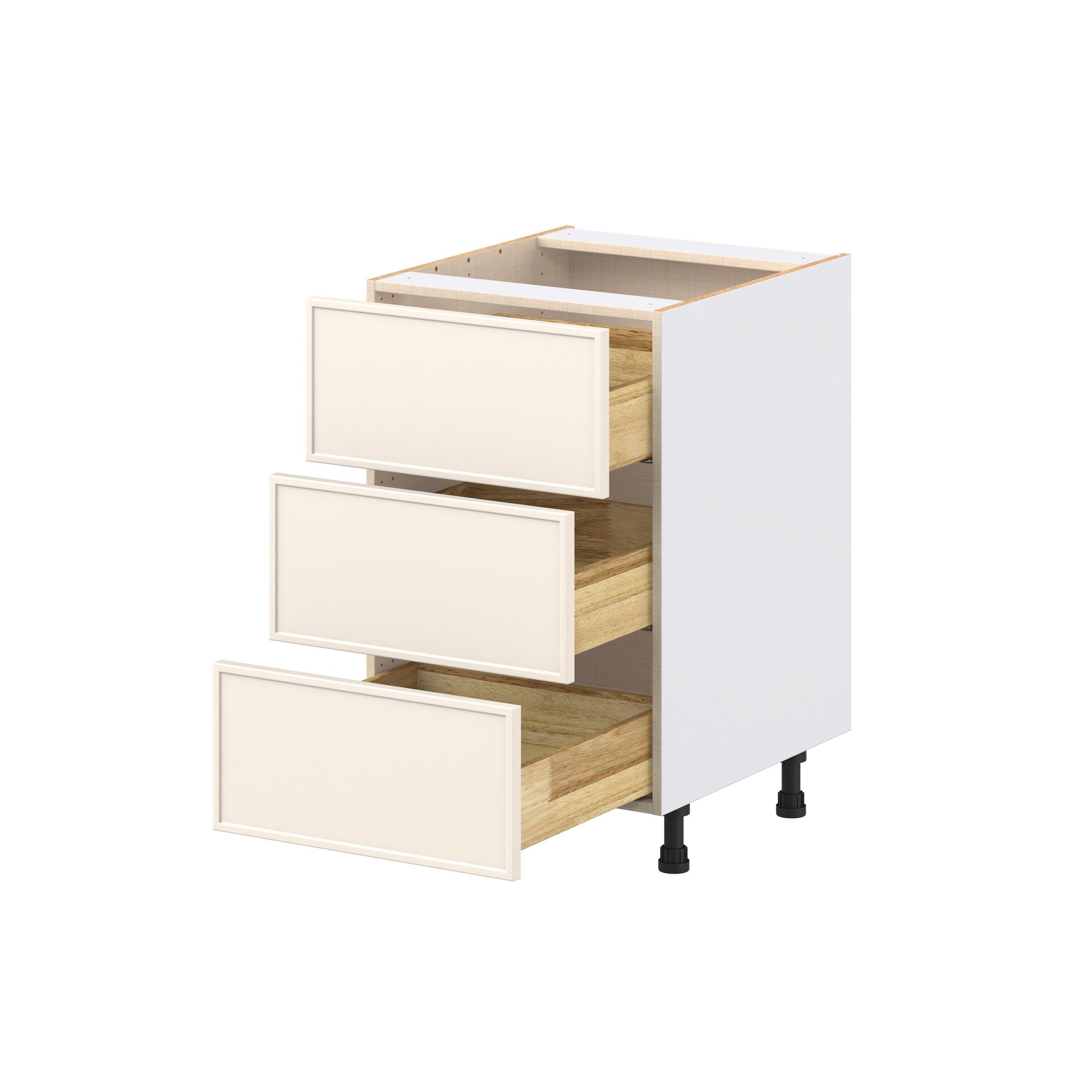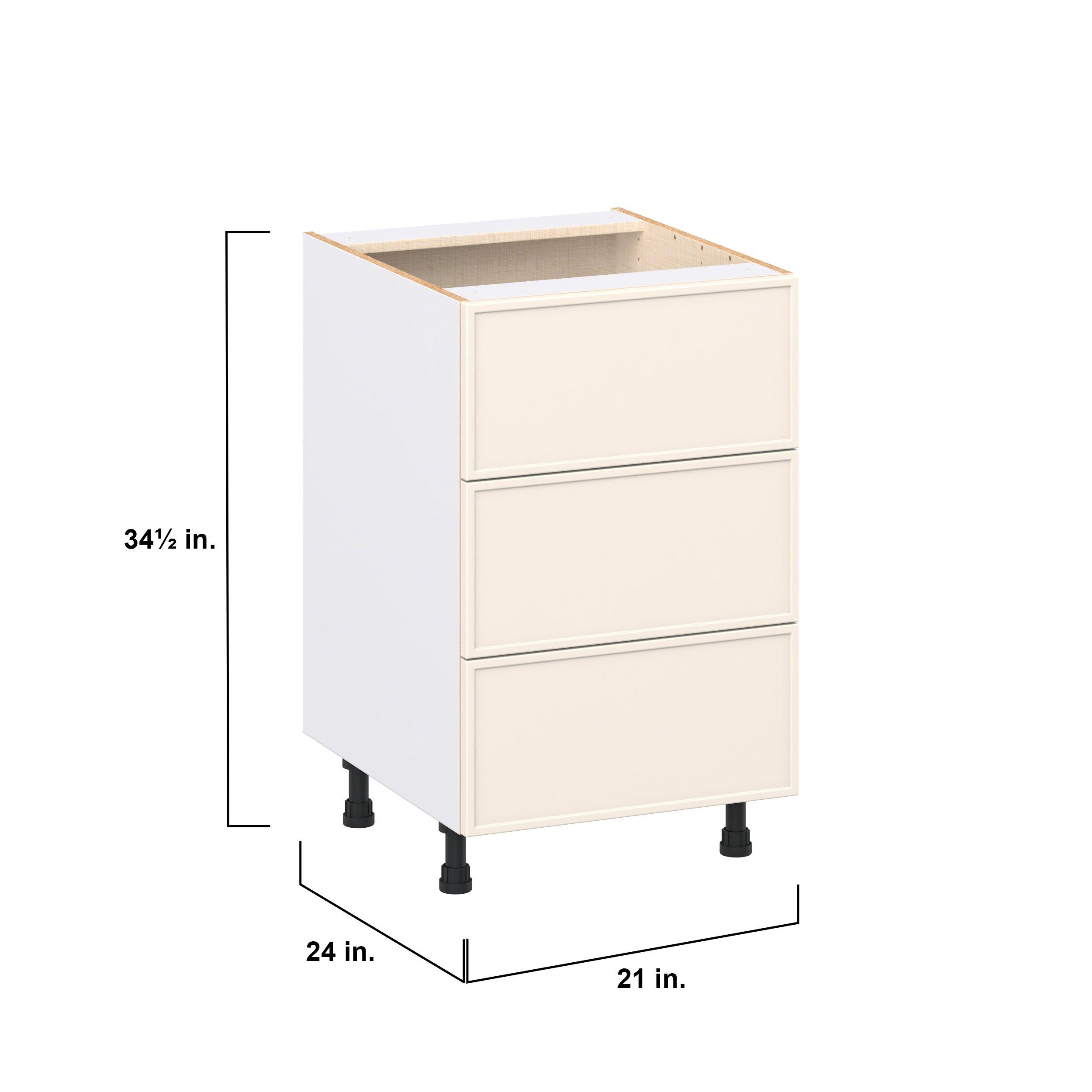 Enjoy a modern twist on a classic with Linden slim shaker cabinets. Available in premium-painted fresh washed linen and earthy moss green finishes, this collection exudes warmth and creates an inviting atmosphere Crafted from one-piece MDF Studio Design Collection Linden 21 in. Painted Washed Linen Drawer Base Cabinet is designed to resist hairline cracks while the easy-to-clean finish stands up to stains and moisture. Featuring 5-piece doors and dovetail drawer joints, these cabinets offer durability and elegance. This collection combines style with everyday storage solutions.