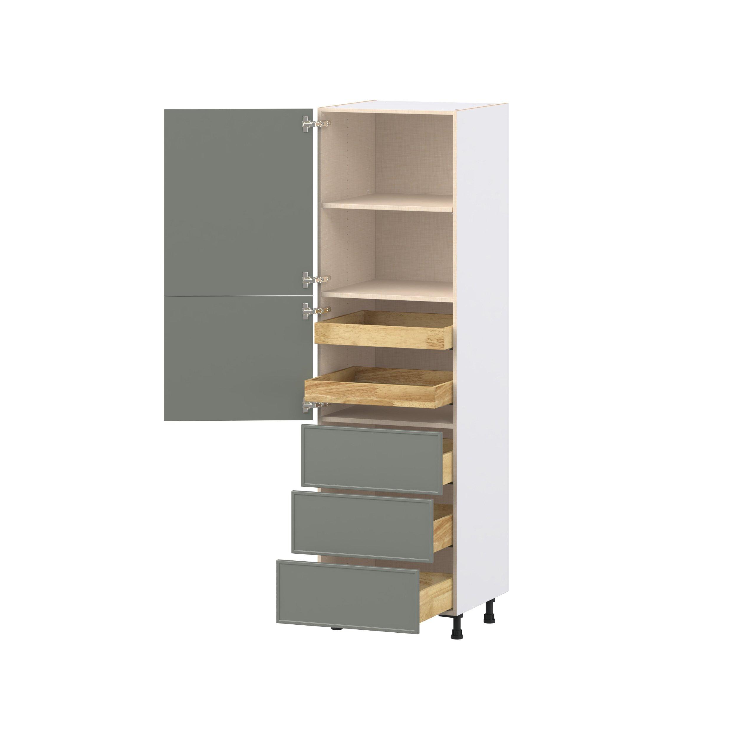 Enjoy a modern twist on a classic with Linden slim shaker cabinets. Available in premium-painted fresh washed linen and earthy moss green finishes, this collection exudes warmth and creates an inviting atmosphere Crafted from one-piece MDF Studio Design Collection Linden 24 in. Painted Moss Green Door and Drawer Pantry Cabinet with Inner Pull-Out is designed to resist hairline cracks while the easy-to-clean finish stands up to stains and moisture. Featuring 5-piece doors and dovetail drawer joints, these cabinets offer durability and elegance. This collection combines style with everyday storage solutions.