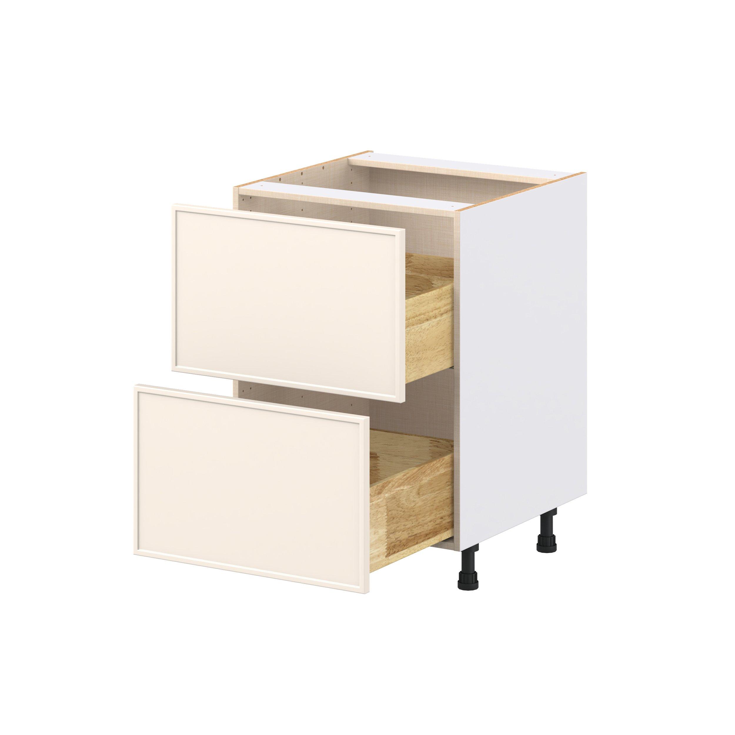 Enjoy a modern twist on a classic with Linden slim shaker cabinets. Available in premium-painted fresh washed linen and earthy moss green finishes, this collection exudes warmth and creates an inviting atmosphere Crafted from one-piece MDF Studio Design Collection Linden 24 in. Painted Washed Linen Drawer Base Cabinet is designed to resist hairline cracks while the easy-to-clean finish stands up to stains and moisture. Featuring 5-piece doors and dovetail drawer joints, these cabinets offer durability and elegance. This collection combines style with everyday storage solutions.