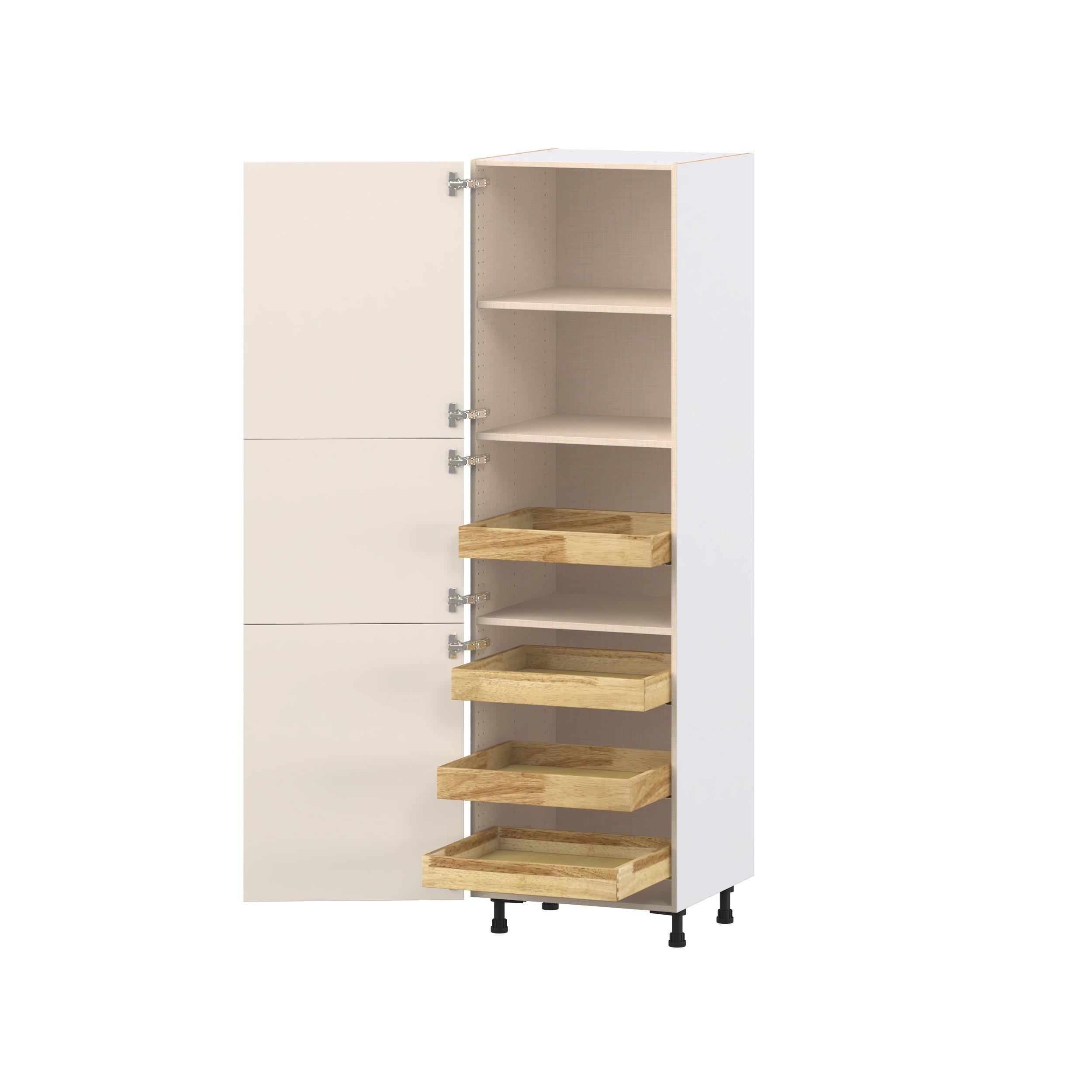 Enjoy a modern twist on a classic with Linden slim shaker cabinets. Available in premium-painted fresh washed linen and earthy moss green finishes, this collection exudes warmth and creates an inviting atmosphere Crafted from one-piece MDF Studio Design Collection Linden 24 in. Painted Washed Linen Pantry Cabinet with Inner Pull-Out Drawer is designed to resist hairline cracks while the easy-to-clean finish stands up to stains and moisture. Featuring 5-piece doors and dovetail drawer joints, these cabinets offer durability and elegance. This collection combines style with everyday storage solutions.