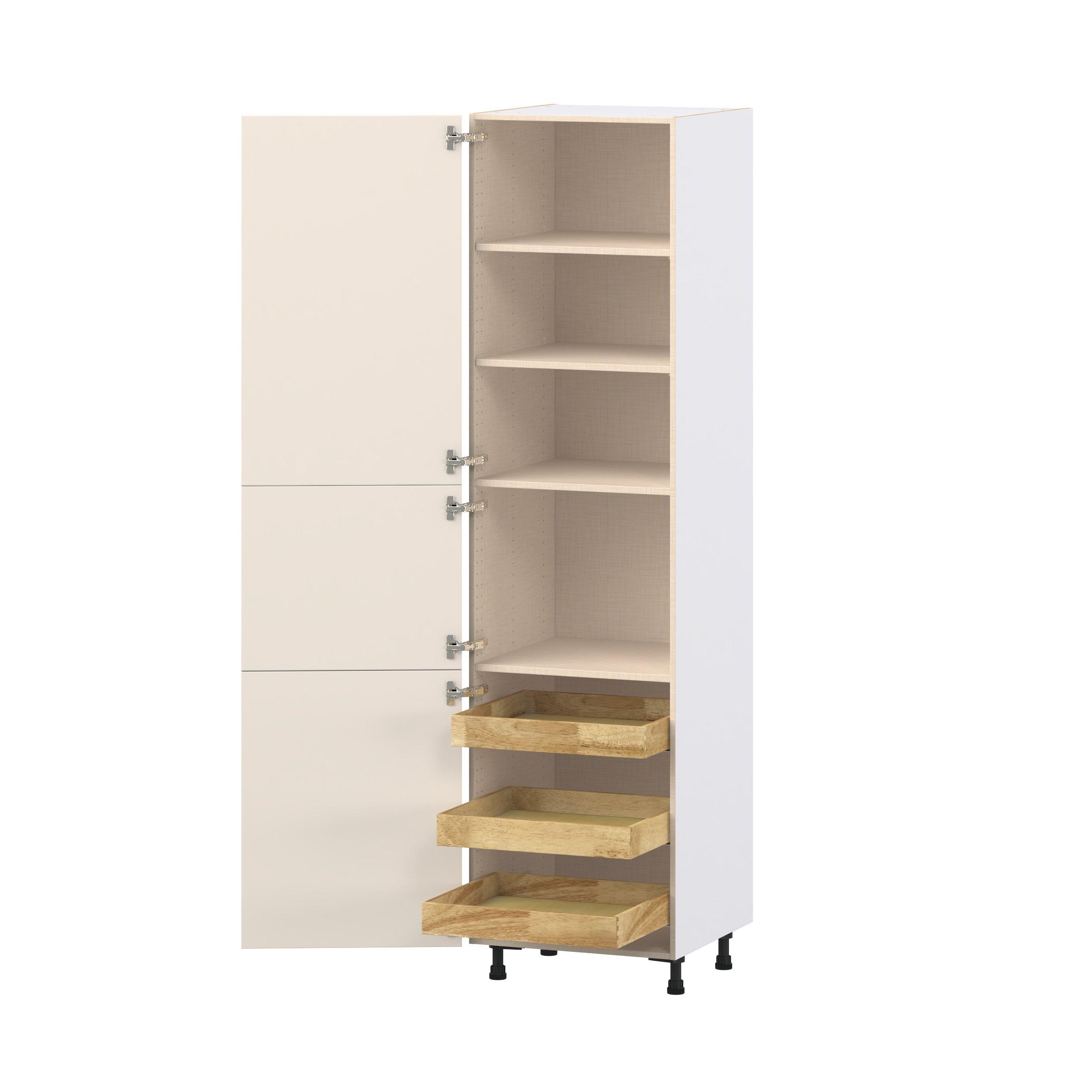 Enjoy a modern twist on a classic with Linden slim shaker cabinets. Available in premium-painted fresh washed linen and earthy moss green finishes, this collection exudes warmth and creates an inviting atmosphere Crafted from one-piece MDF Studio Design Collection Linden 24 in. Painted Washed Linen Pantry Cabinet with Inner Pull-Out Drawer is designed to resist hairline cracks while the easy-to-clean finish stands up to stains and moisture. Featuring 5-piece doors and dovetail drawer joints, these cabinets offer durability and elegance. This collection combines style with everyday storage solutions.