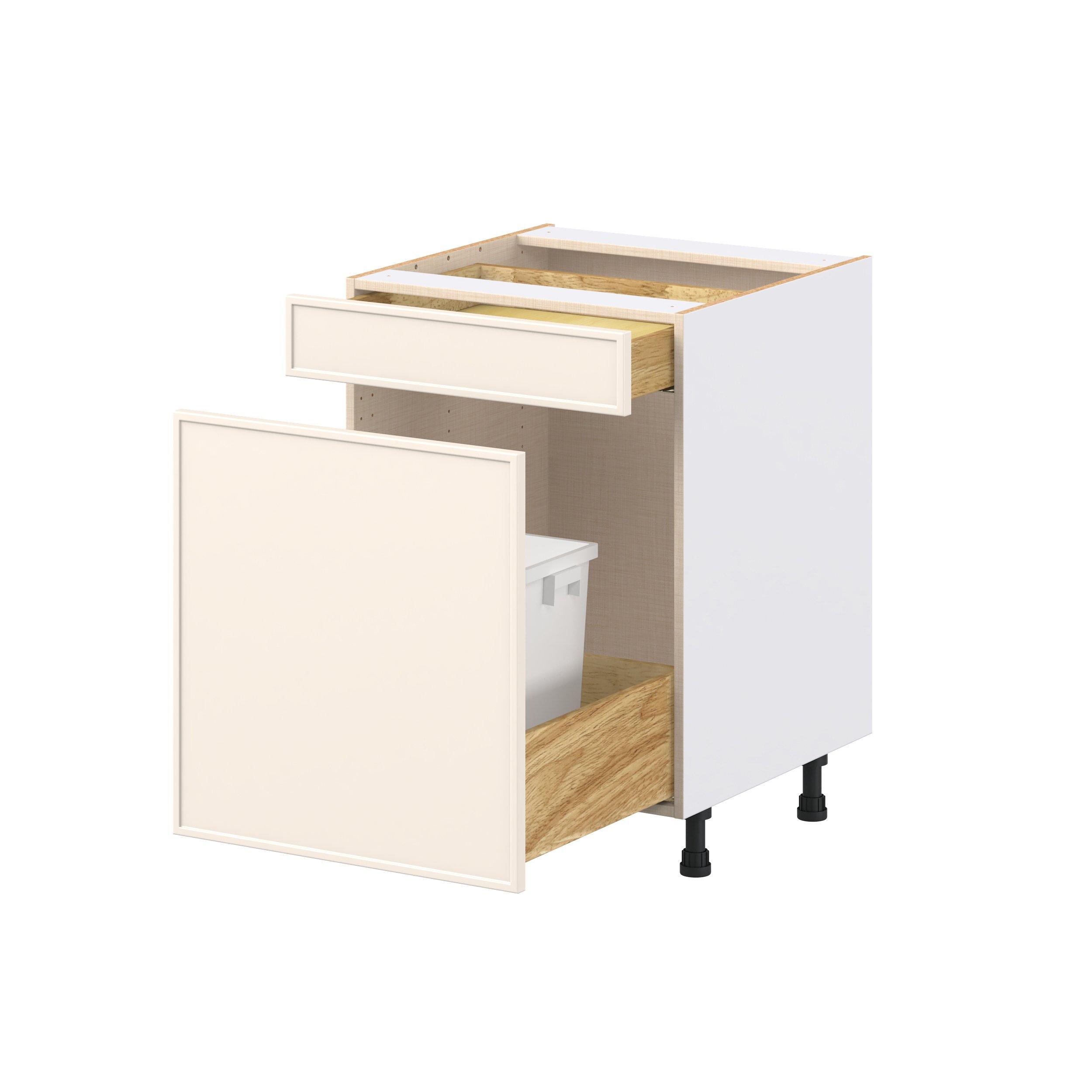 Enjoy a modern twist on a classic with Linden slim shaker cabinets. Available in premium-painted fresh washed linen and earthy moss green finishes, this collection exudes warmth and creates an inviting atmosphere Crafted from one-piece MDF Studio Design Collection Linden 24 in. Painted Washed Linen Trash Can Pull-Out Base Cabinet is designed to resist hairline cracks while the easy-to-clean finish stands up to stains and moisture. Featuring 5-piece doors and dovetail drawer joints, these cabinets offer durability and elegance. This collection combines style with everyday storage solutions.