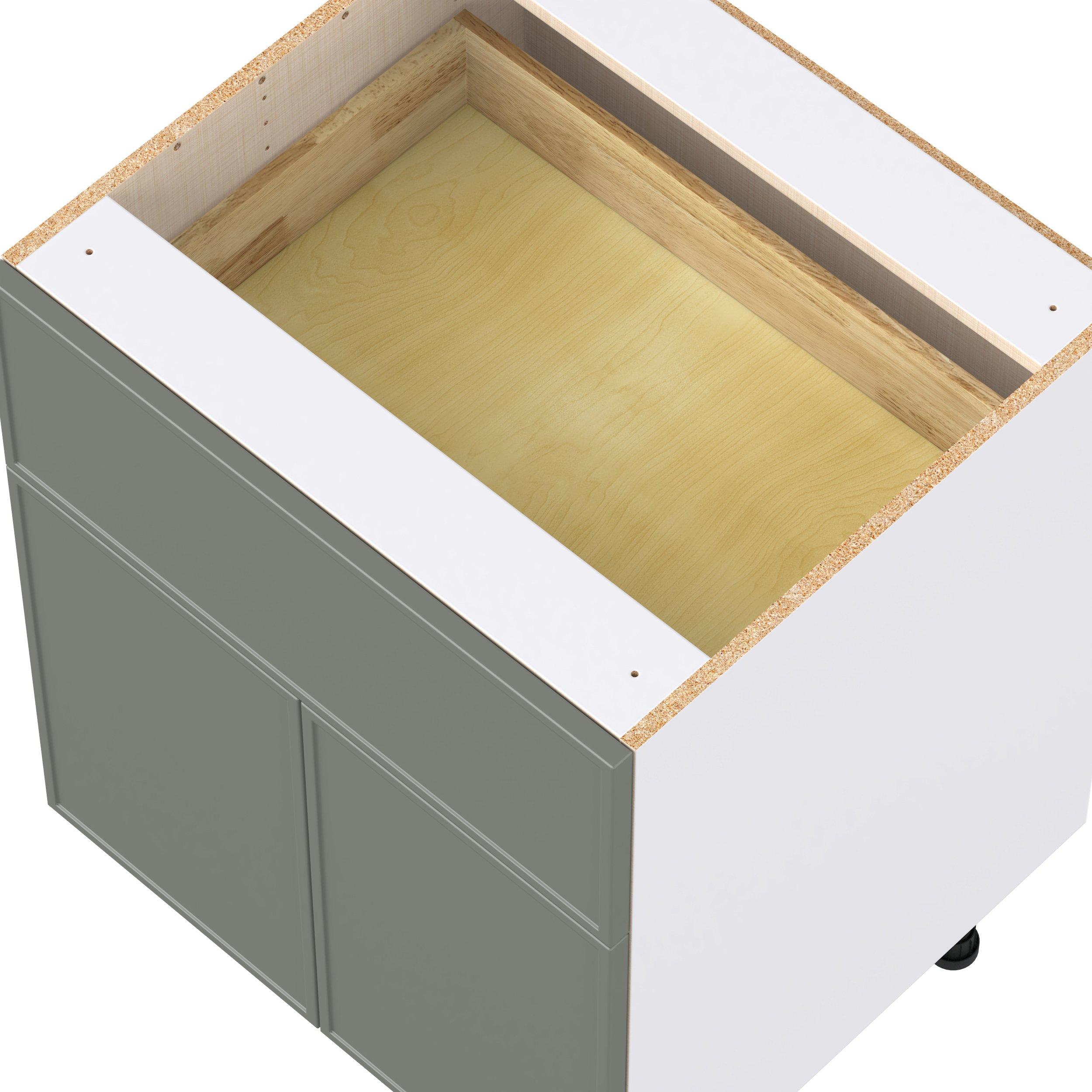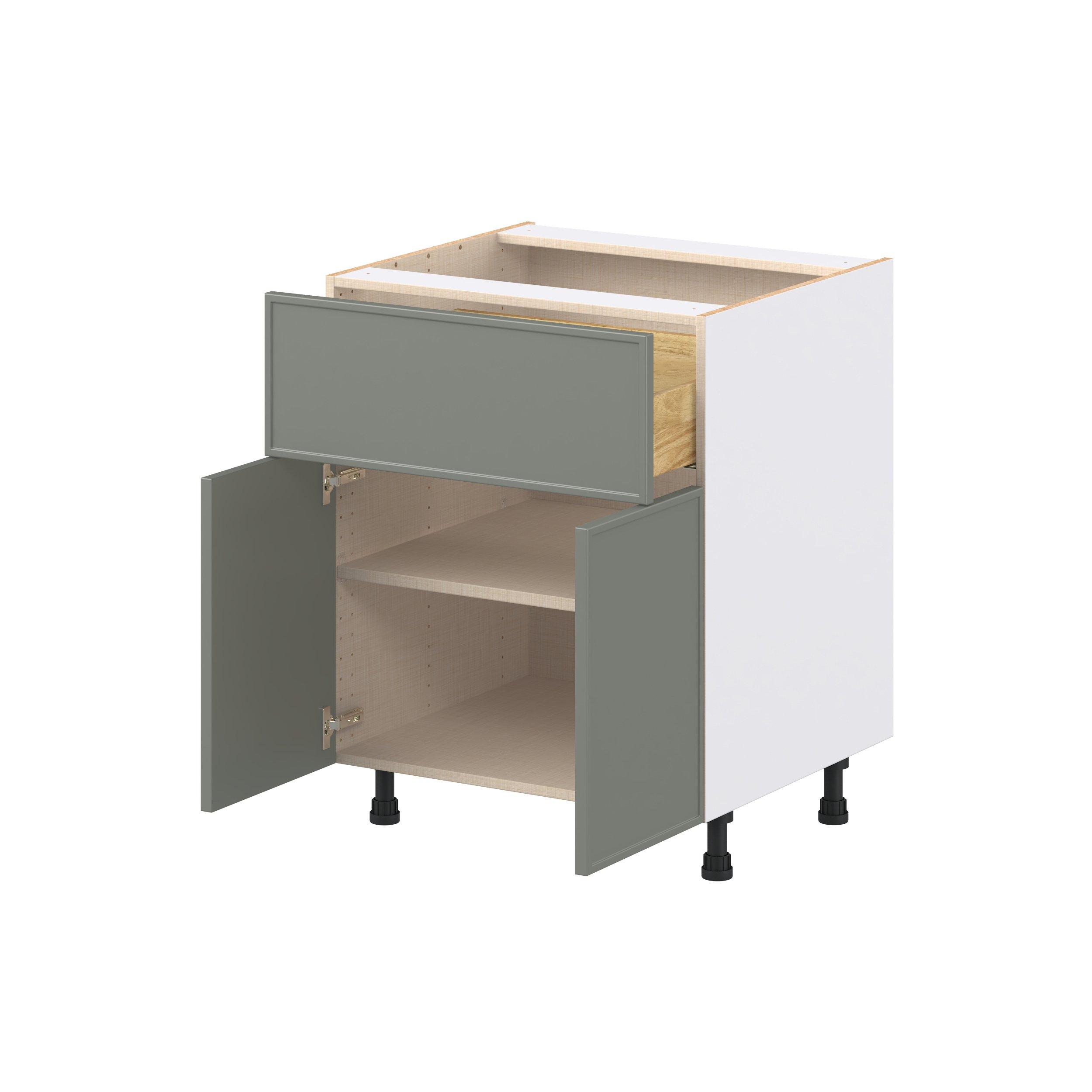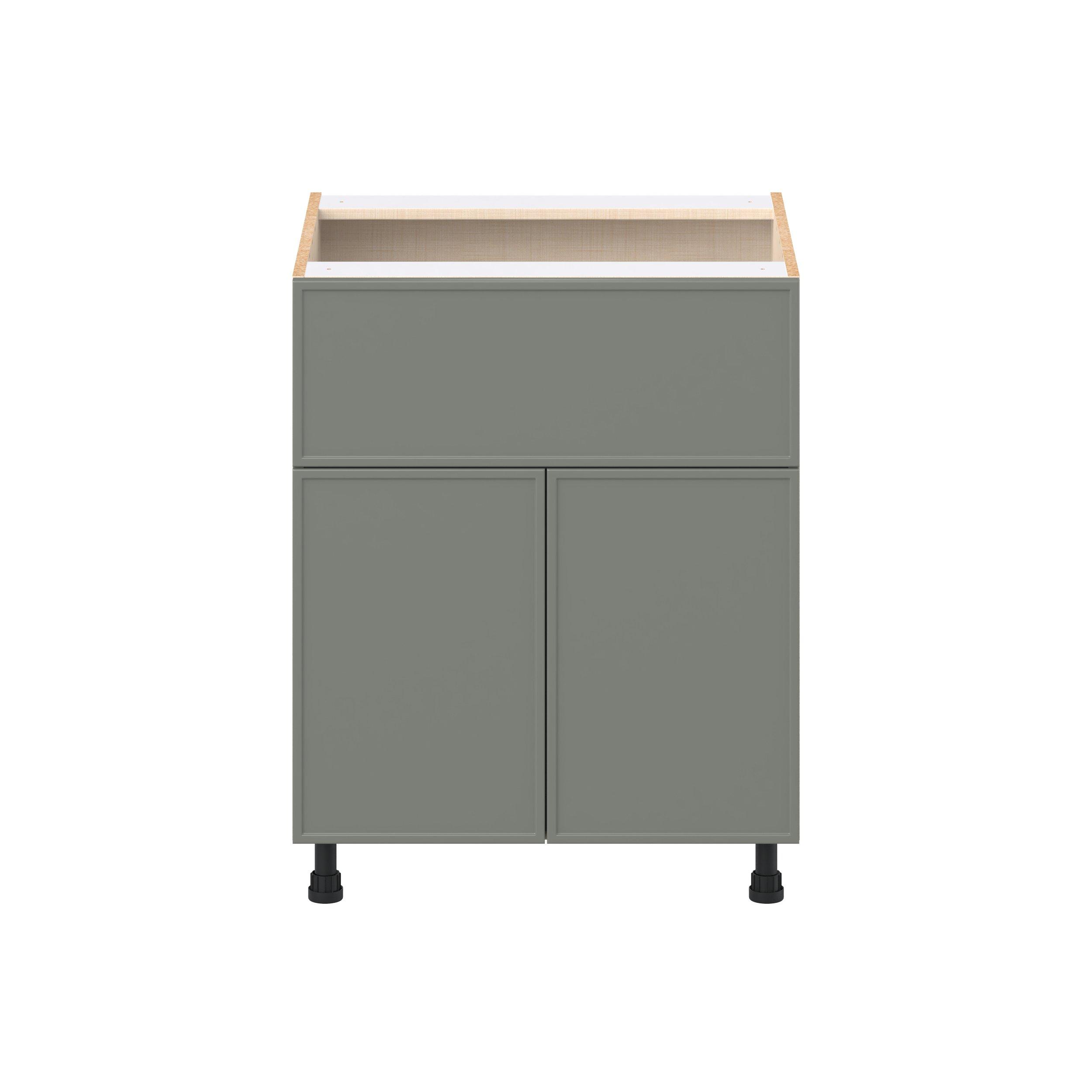 Double DoorEnjoy a modern twist on a classic with Linden slim shaker cabinets. Available in premium-painted fresh washed linen and earthy moss green finishes, this collection exudes warmth and creates an inviting atmosphere Crafted from one-piece MDF Studio Design Collection Linden 27 in. Painted Moss Green Door and Drawer Base Cabinet is designed to resist hairline cracks while the easy-to-clean finish stands up to stains and moisture. Featuring 5-piece doors and dovetail drawer joints, these cabinets offer durability and elegance. This collection combines style with everyday storage solutions.