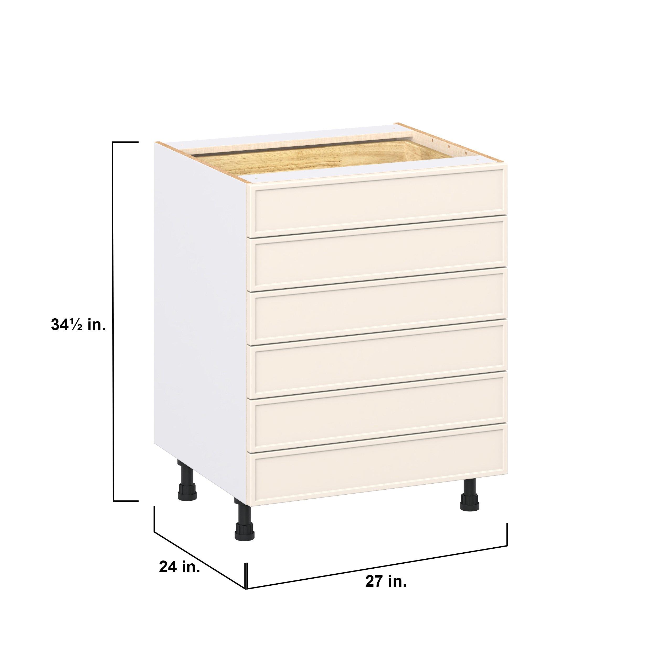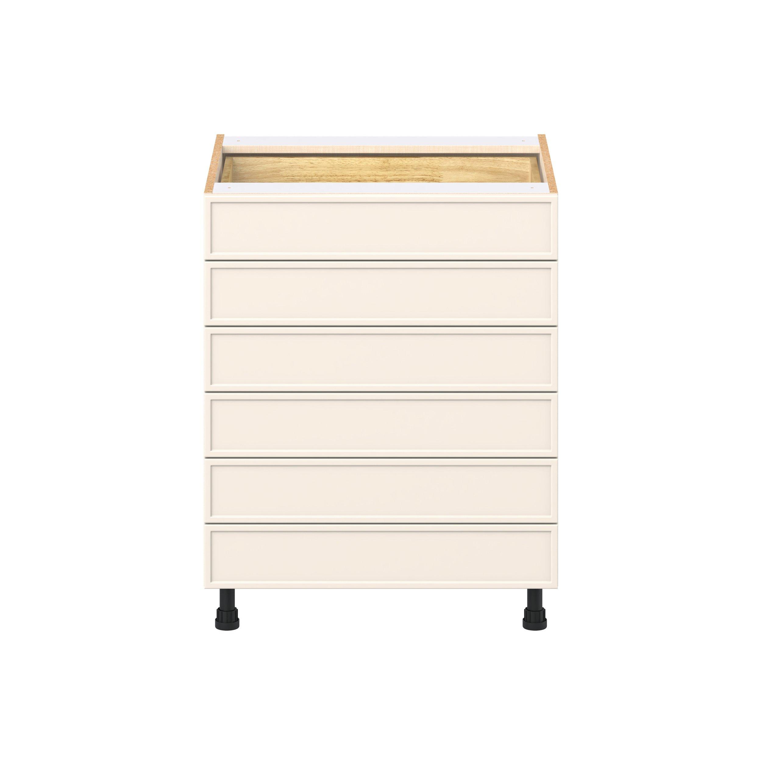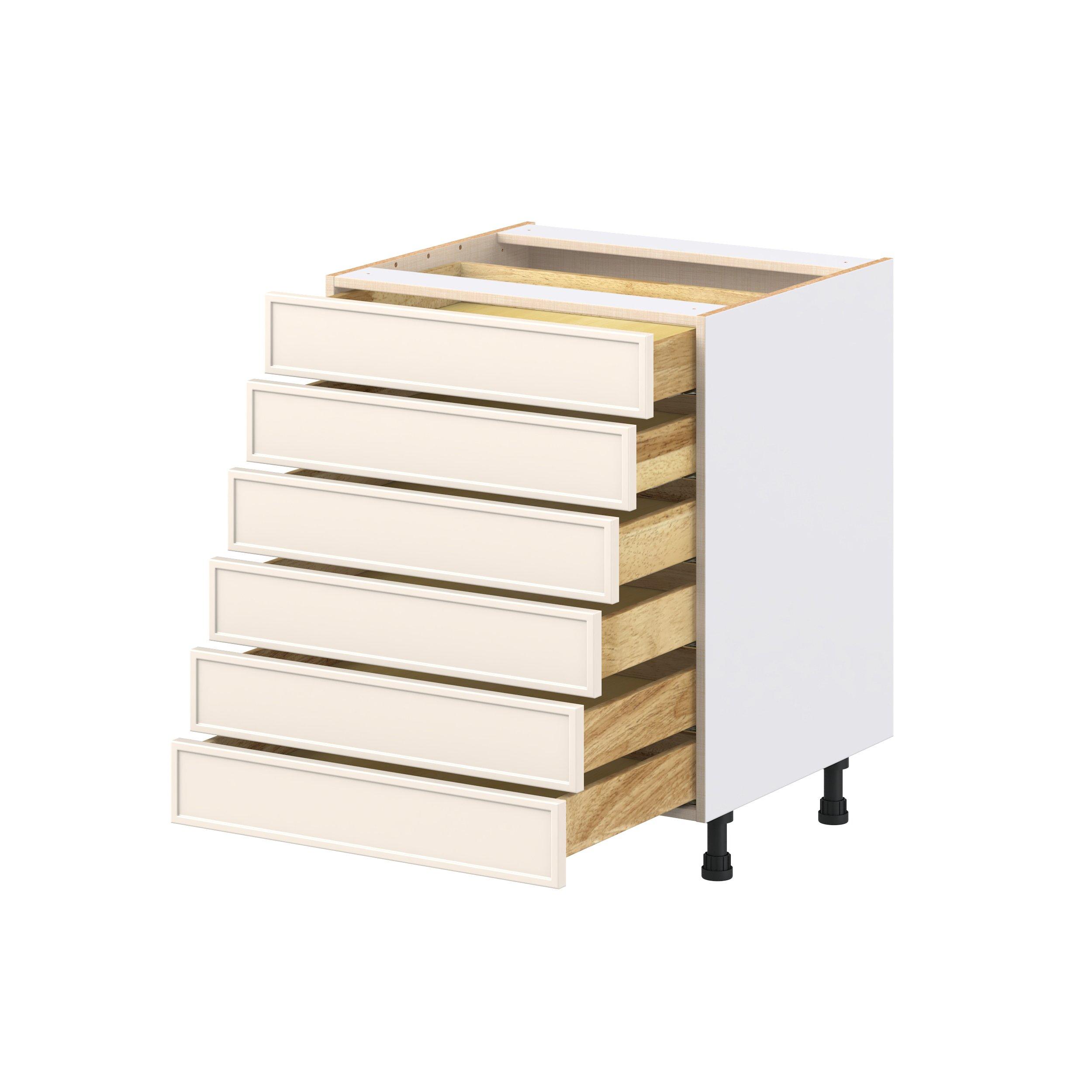 Enjoy a modern twist on a classic with Linden slim shaker cabinets. Available in premium-painted fresh washed linen and earthy moss green finishes, this collection exudes warmth and creates an inviting atmosphere Crafted from one-piece MDF Studio Design Collection Linden 27 in. Painted Washed Linen Drawer Base Cabinet is designed to resist hairline cracks while the easy-to-clean finish stands up to stains and moisture. Featuring 5-piece doors and dovetail drawer joints, these cabinets offer durability and elegance. This collection combines style with everyday storage solutions.