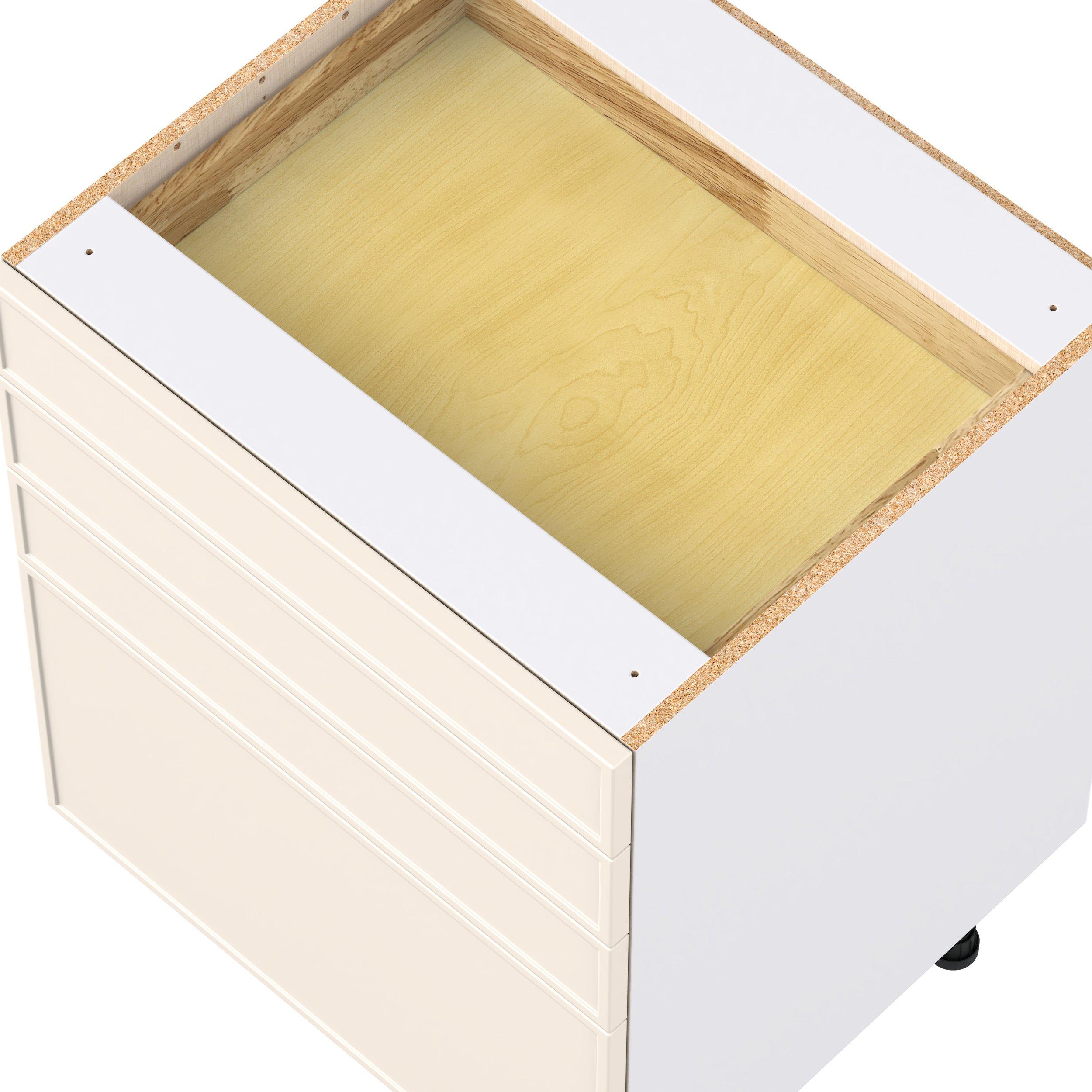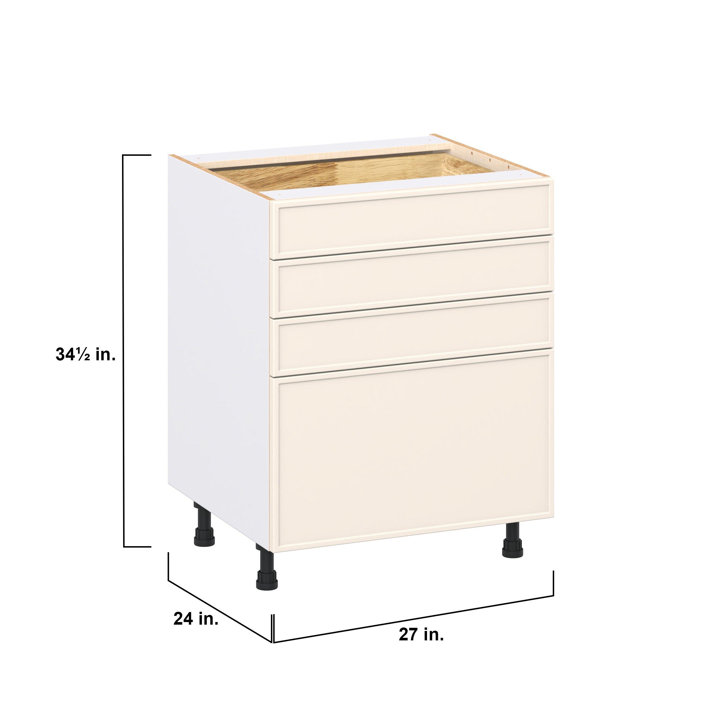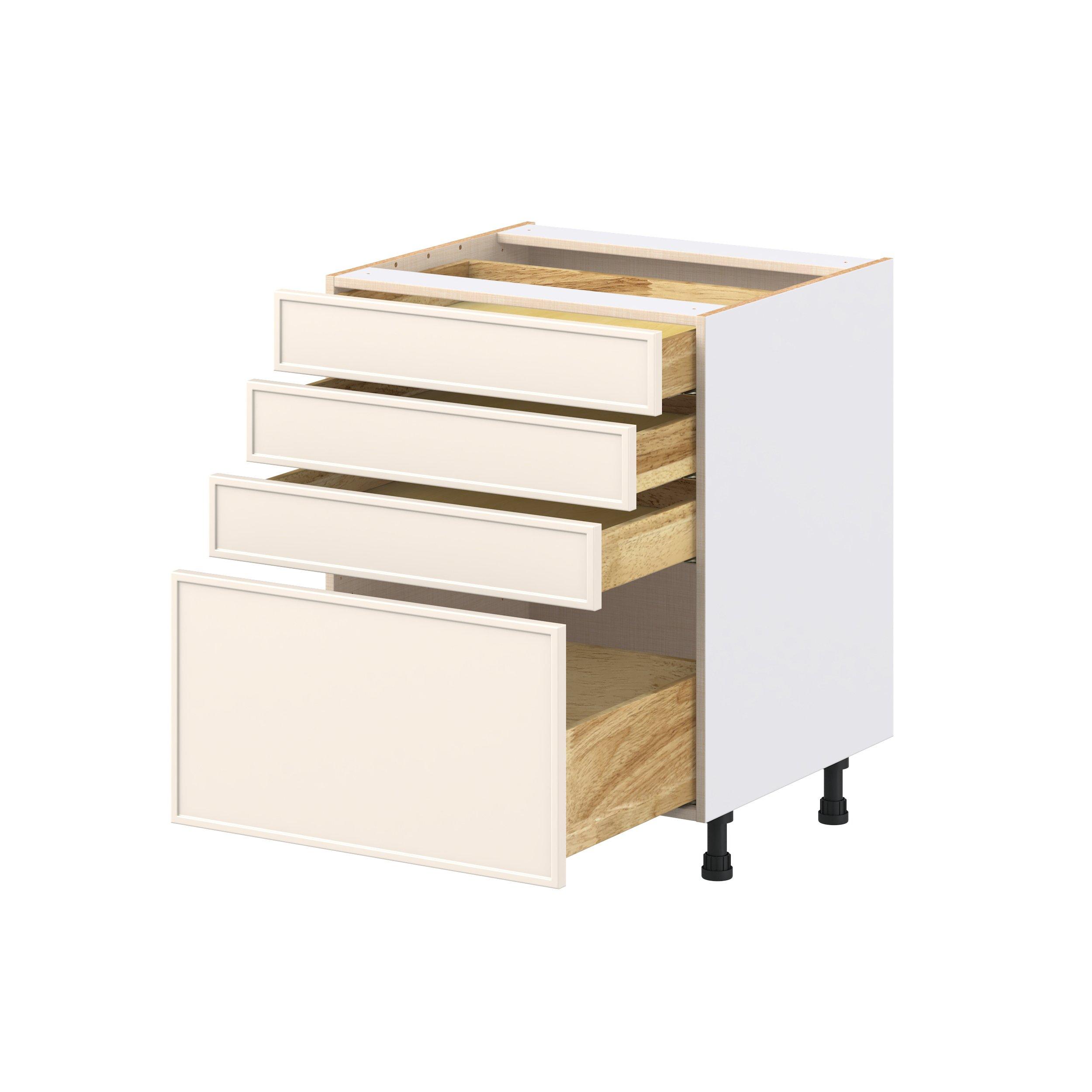 Enjoy a modern twist on a classic with Linden slim shaker cabinets. Available in premium-painted fresh washed linen and earthy moss green finishes, this collection exudes warmth and creates an inviting atmosphere Crafted from one-piece MDF Studio Design Collection Linden 27 in. Painted Washed Linen Drawer Base Cabinet is designed to resist hairline cracks while the easy-to-clean finish stands up to stains and moisture. Featuring 5-piece doors and dovetail drawer joints, these cabinets offer durability and elegance. This collection combines style with everyday storage solutions.
