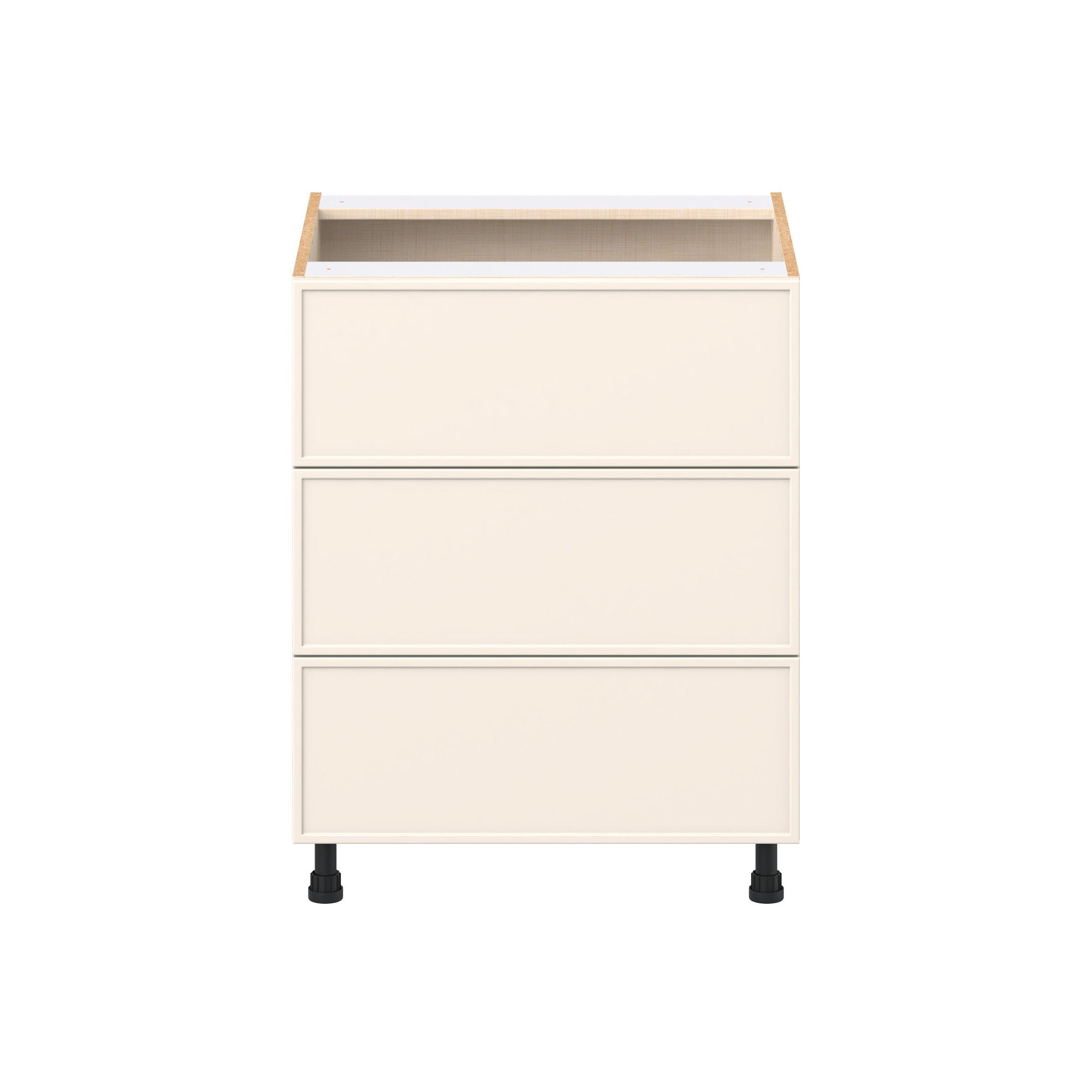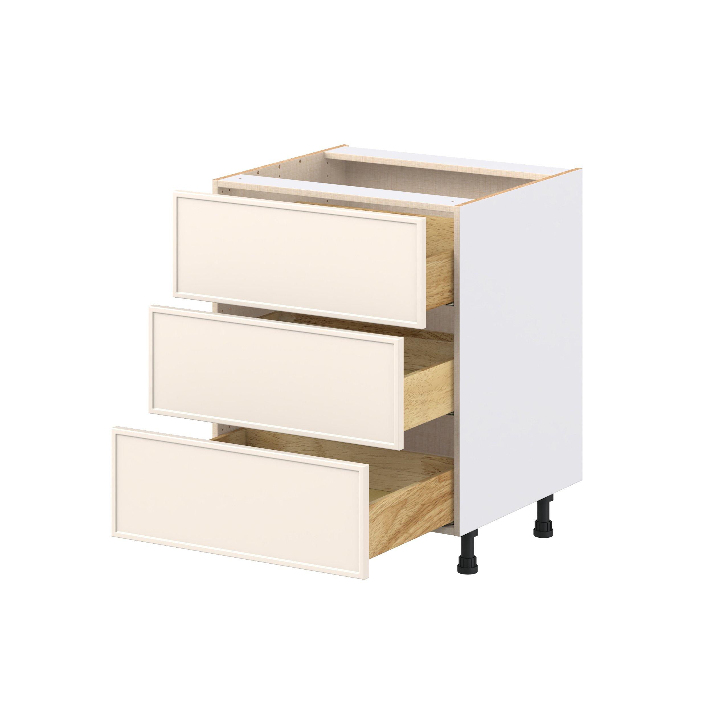 Enjoy a modern twist on a classic with Linden slim shaker cabinets. Available in premium-painted fresh washed linen and earthy moss green finishes, this collection exudes warmth and creates an inviting atmosphere Crafted from one-piece MDF Studio Design Collection Linden 27 in. Painted Washed Linen Drawer Base Cabinet is designed to resist hairline cracks while the easy-to-clean finish stands up to stains and moisture. Featuring 5-piece doors and dovetail drawer joints, these cabinets offer durability and elegance. This collection combines style with everyday storage solutions.
