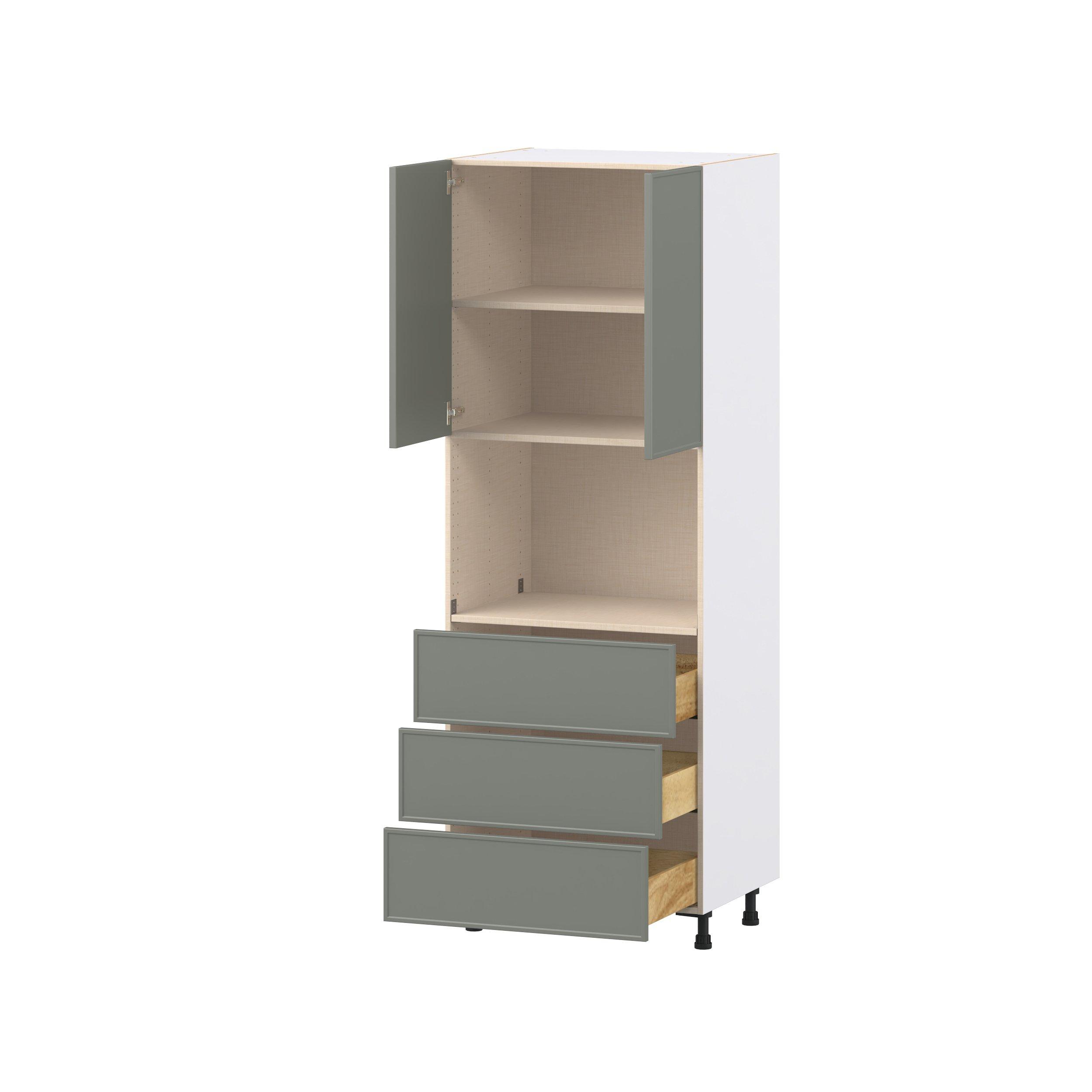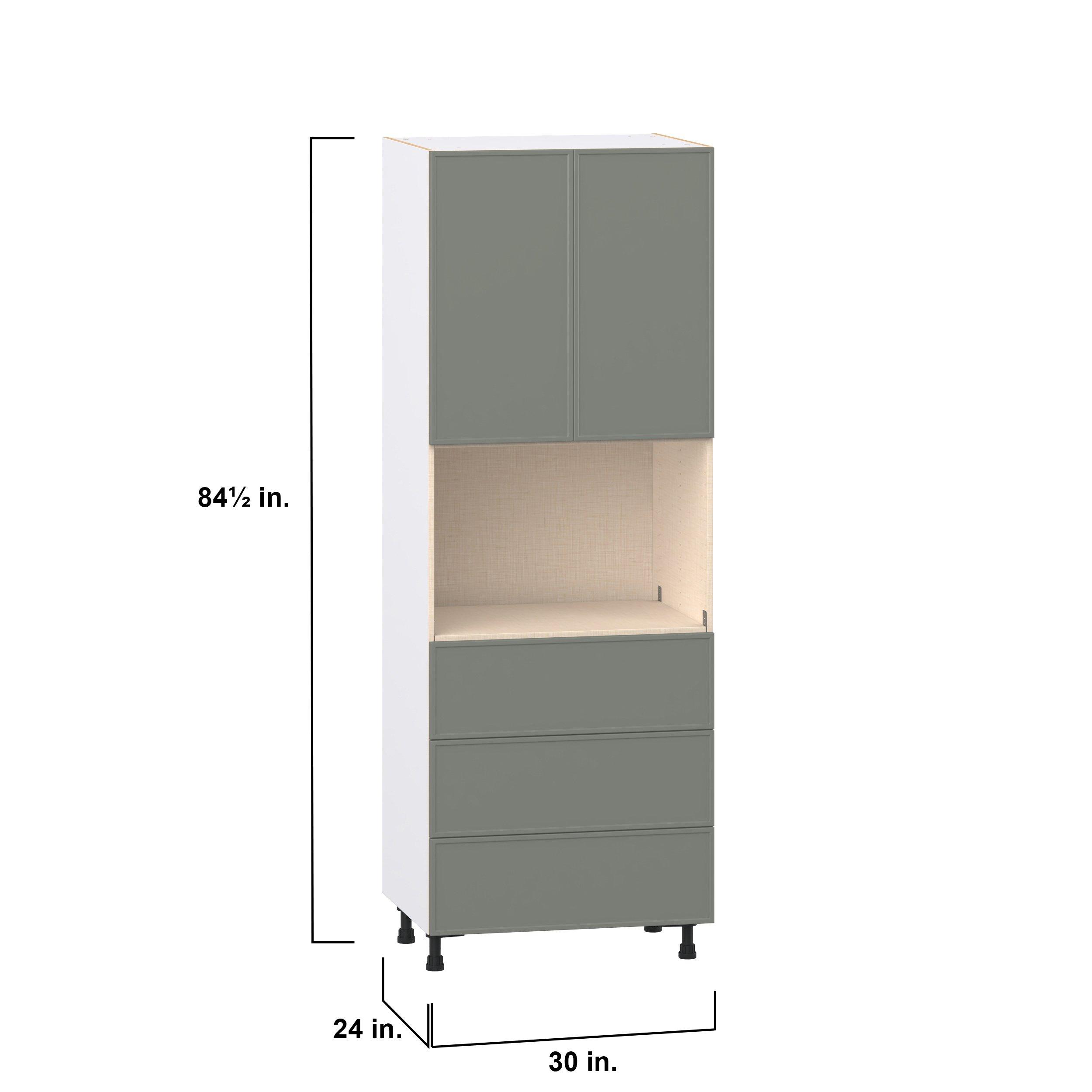 Enjoy a modern twist on a classic with Linden slim shaker cabinets. Available in premium-painted fresh washed linen and earthy moss green finishes, this collection exudes warmth and creates an inviting atmosphere Crafted from one-piece MDF Studio Design Collection Linden 30 in. Painted Moss Green Door and Drawer Microwave Pantry Cabinet is designed to resist hairline cracks while the easy-to-clean finish stands up to stains and moisture. Featuring 5-piece doors and dovetail drawer joints, these cabinets offer durability and elegance. This collection combines style with everyday storage solutions.