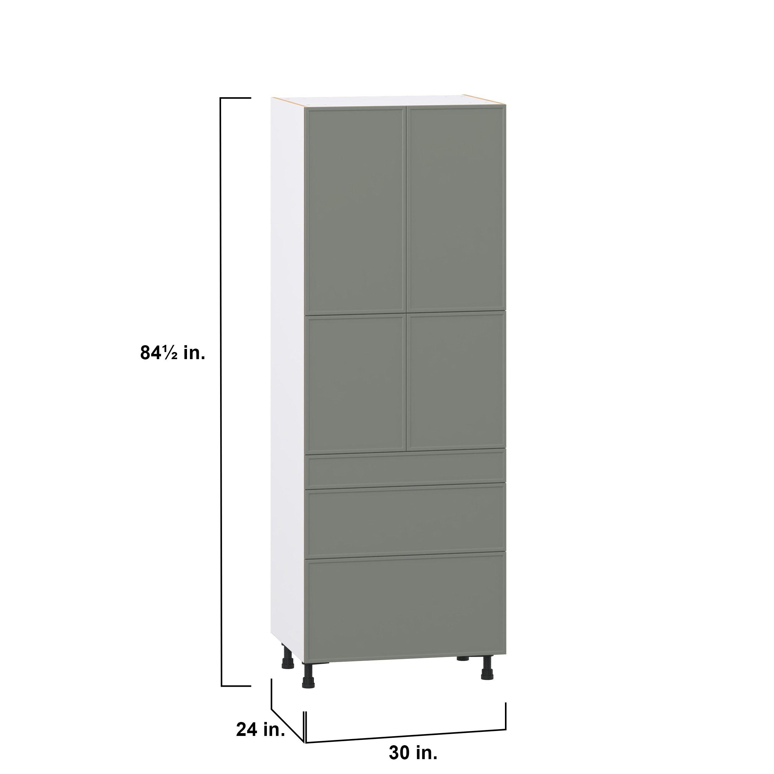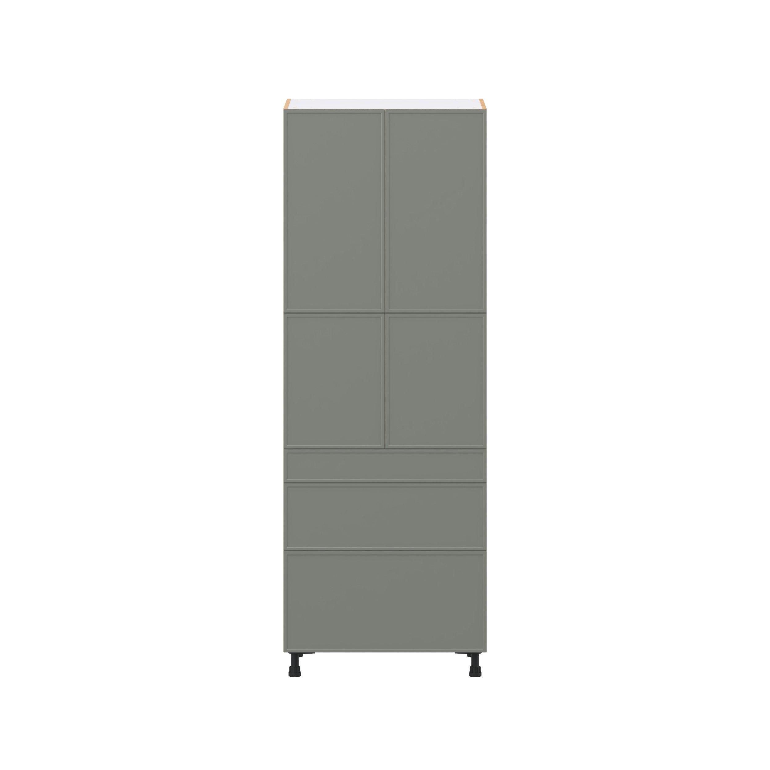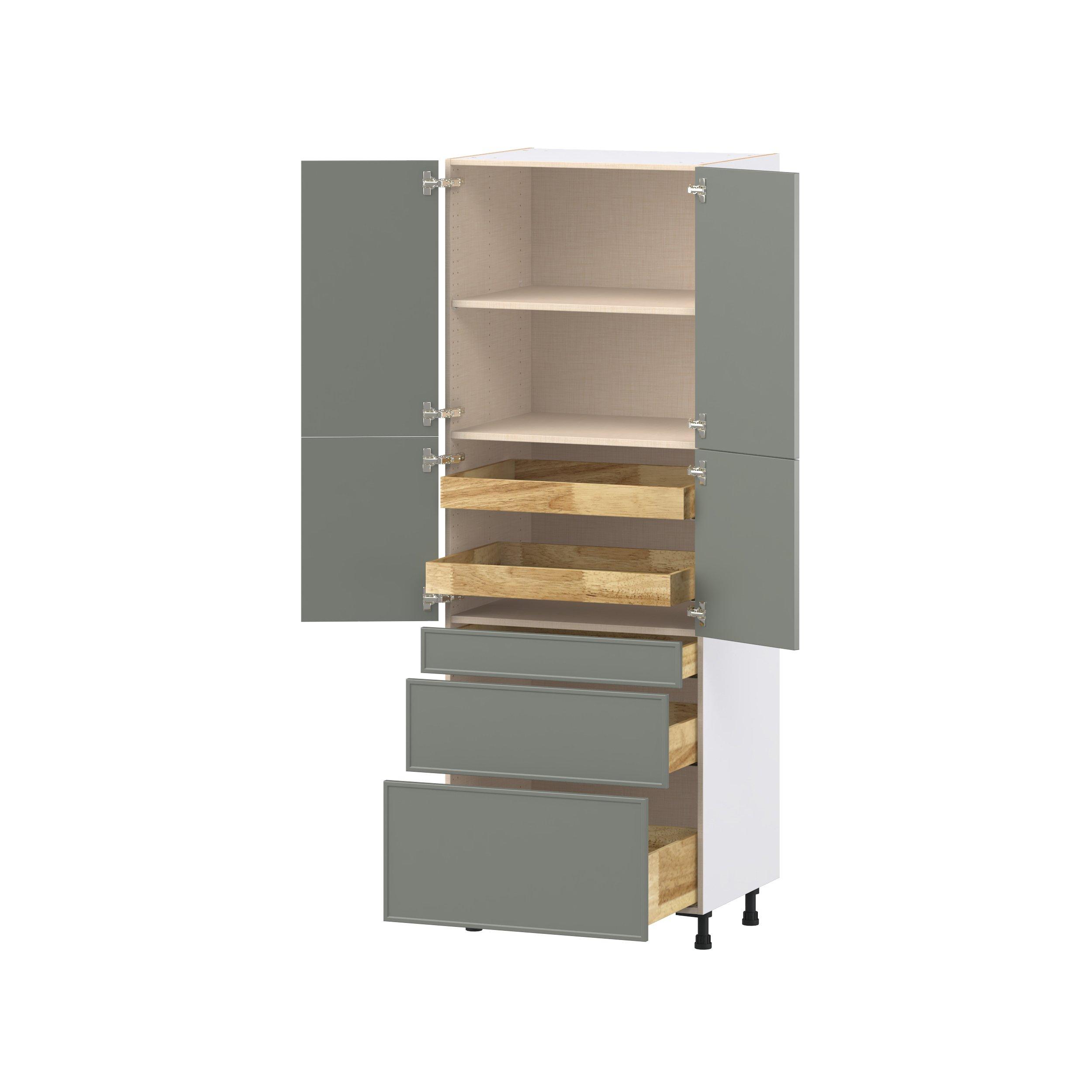 Enjoy a modern twist on a classic with Linden slim shaker cabinets. Available in premium-painted fresh washed linen and earthy moss green finishes, this collection exudes warmth and creates an inviting atmosphere Crafted from one-piece MDF Studio Design Collection Linden 30 in. Painted Moss Green Door and Drawer Pantry Cabinet with Inner Pull-Out is designed to resist hairline cracks while the easy-to-clean finish stands up to stains and moisture. Featuring 5-piece doors and dovetail drawer joints, these cabinets offer durability and elegance. This collection combines style with everyday storage solutions.