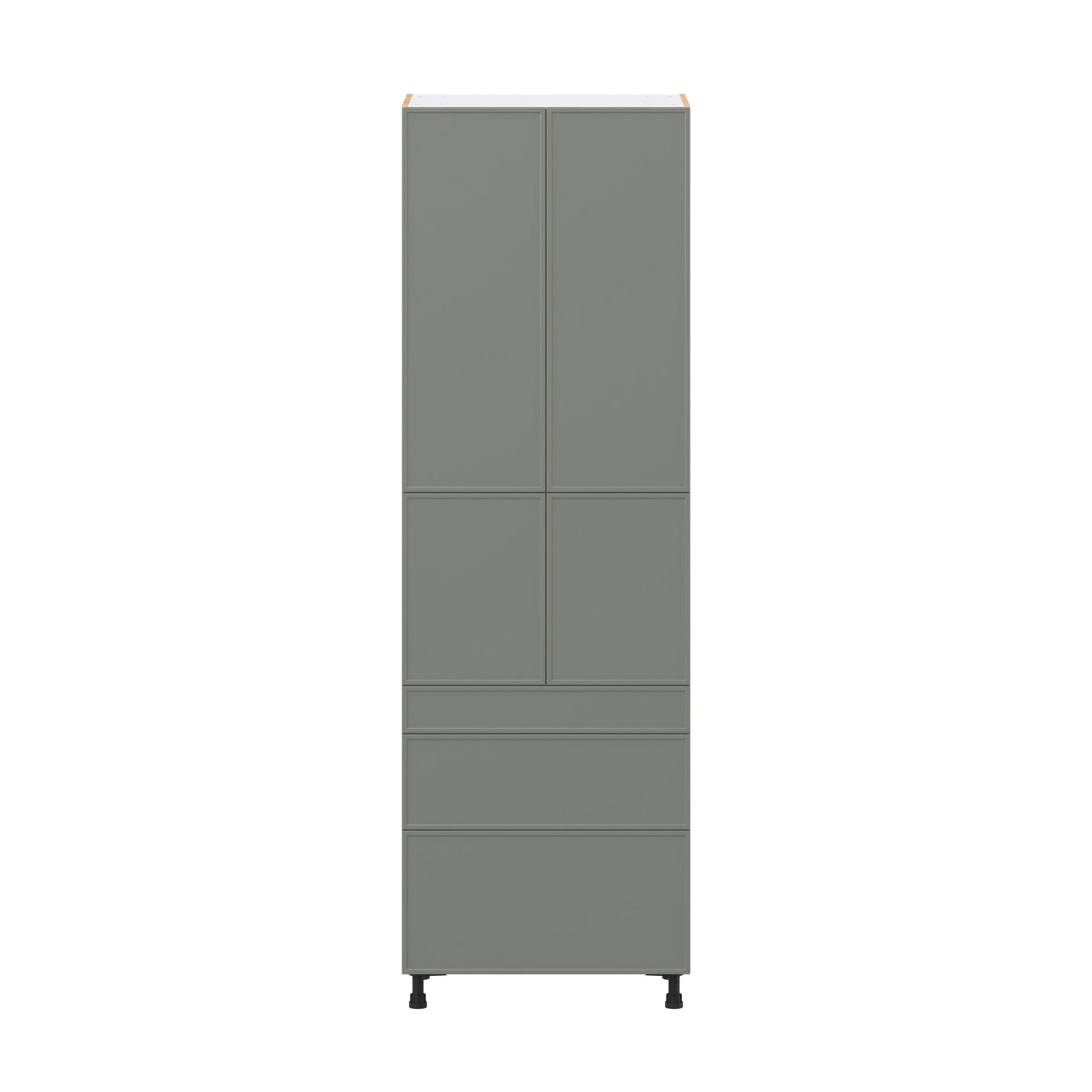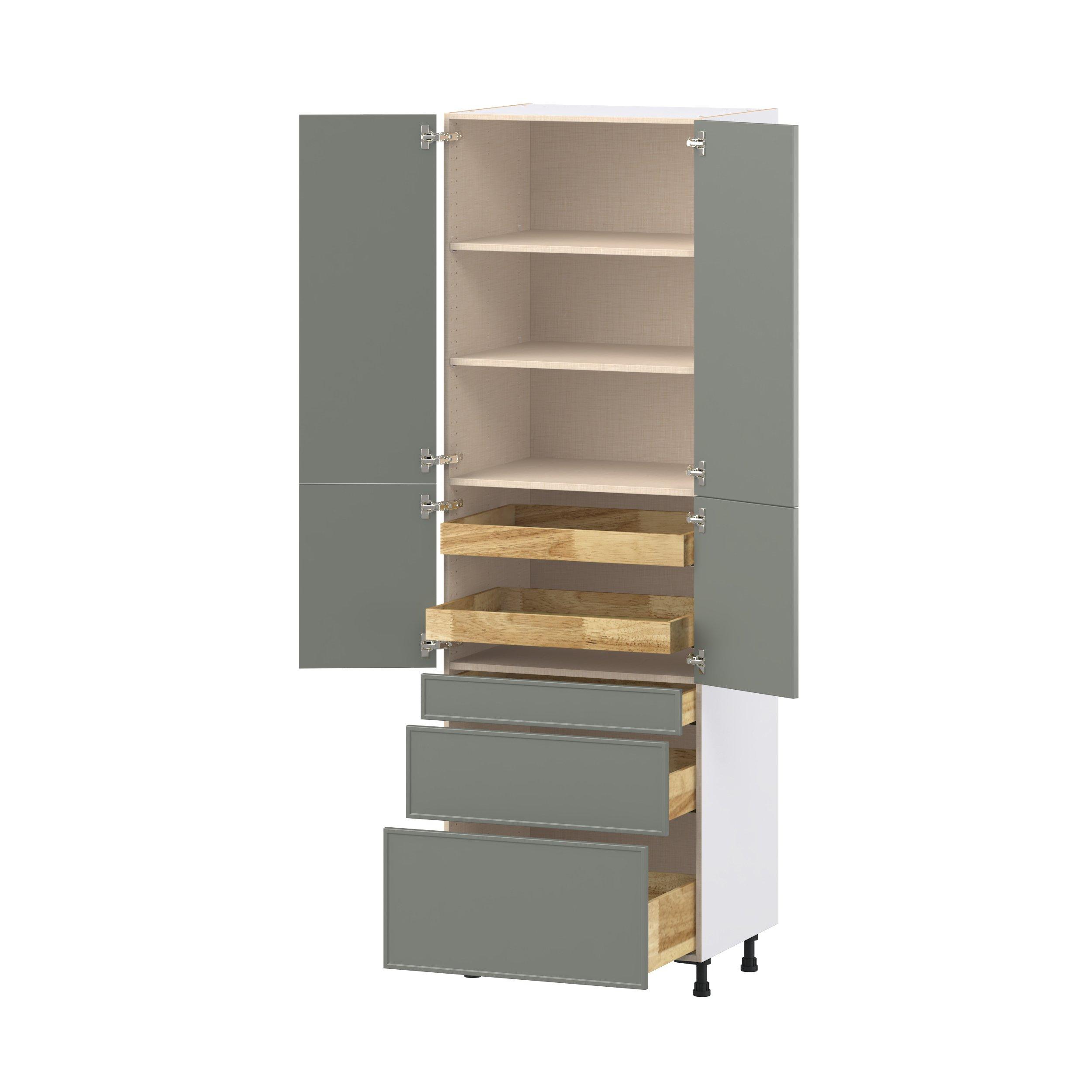 Enjoy a modern twist on a classic with Linden slim shaker cabinets. Available in premium-painted fresh washed linen and earthy moss green finishes, this collection exudes warmth and creates an inviting atmosphere Crafted from one-piece MDF Studio Design Collection Linden 30 in. Painted Moss Green Door and Drawer Pantry Cabinet with Inner Pull-Out is designed to resist hairline cracks while the easy-to-clean finish stands up to stains and moisture. Featuring 5-piece doors and dovetail drawer joints, these cabinets offer durability and elegance. This collection combines style with everyday storage solutions.