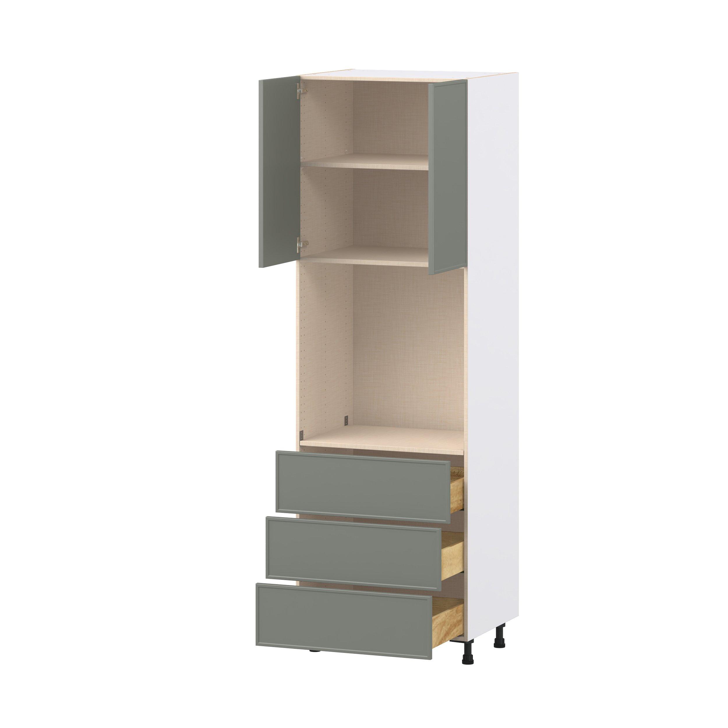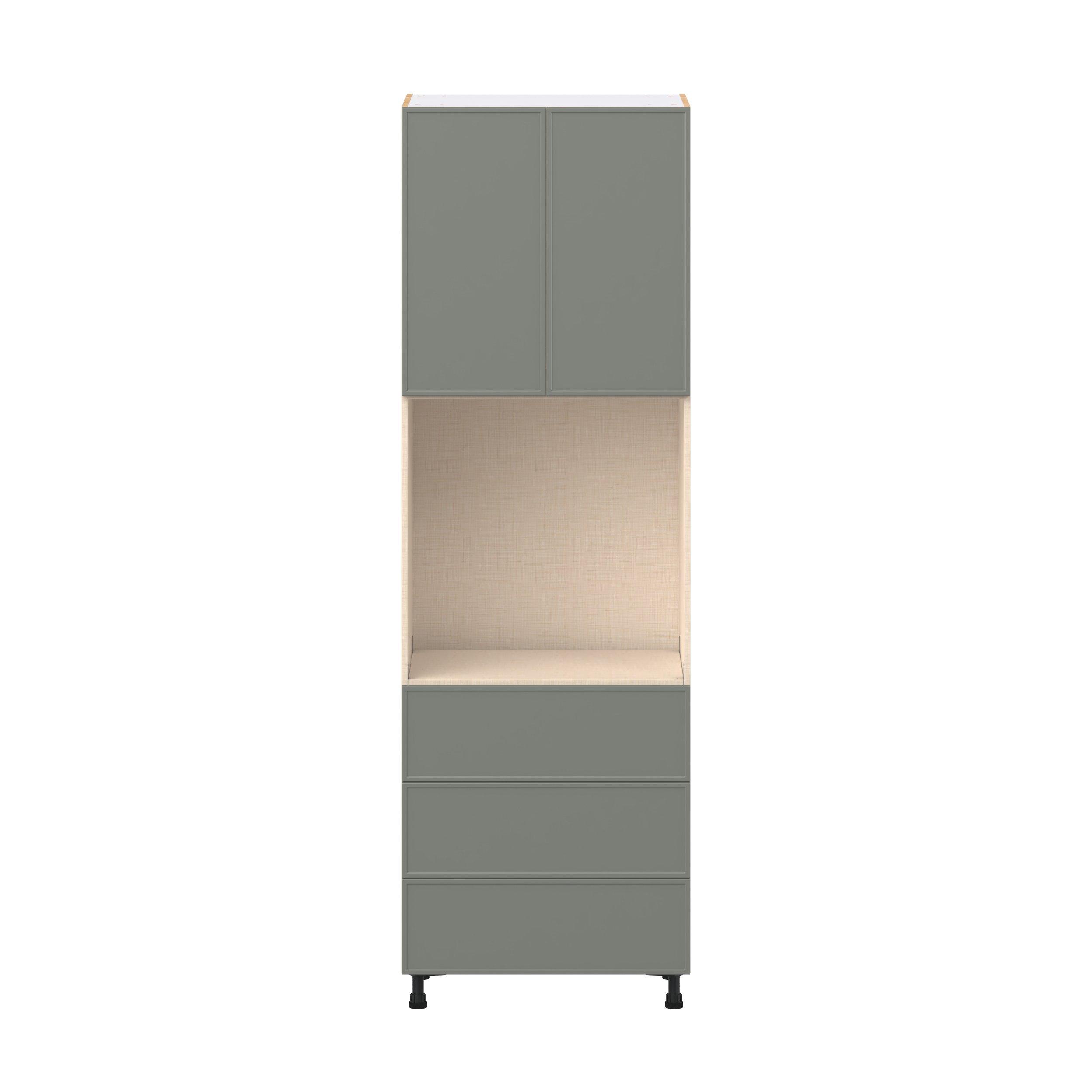 Enjoy a modern twist on a classic with Linden slim shaker cabinets. Available in premium-painted fresh washed linen and earthy moss green finishes, this collection exudes warmth and creates an inviting atmosphere Crafted from one-piece MDF Studio Design Collection Linden 30 in. Painted Moss Green Door and Drawer Single Oven Pantry Cabinet is designed to resist hairline cracks while the easy-to-clean finish stands up to stains and moisture. Featuring 5-piece doors and dovetail drawer joints, these cabinets offer durability and elegance. This collection combines style with everyday storage solutions.