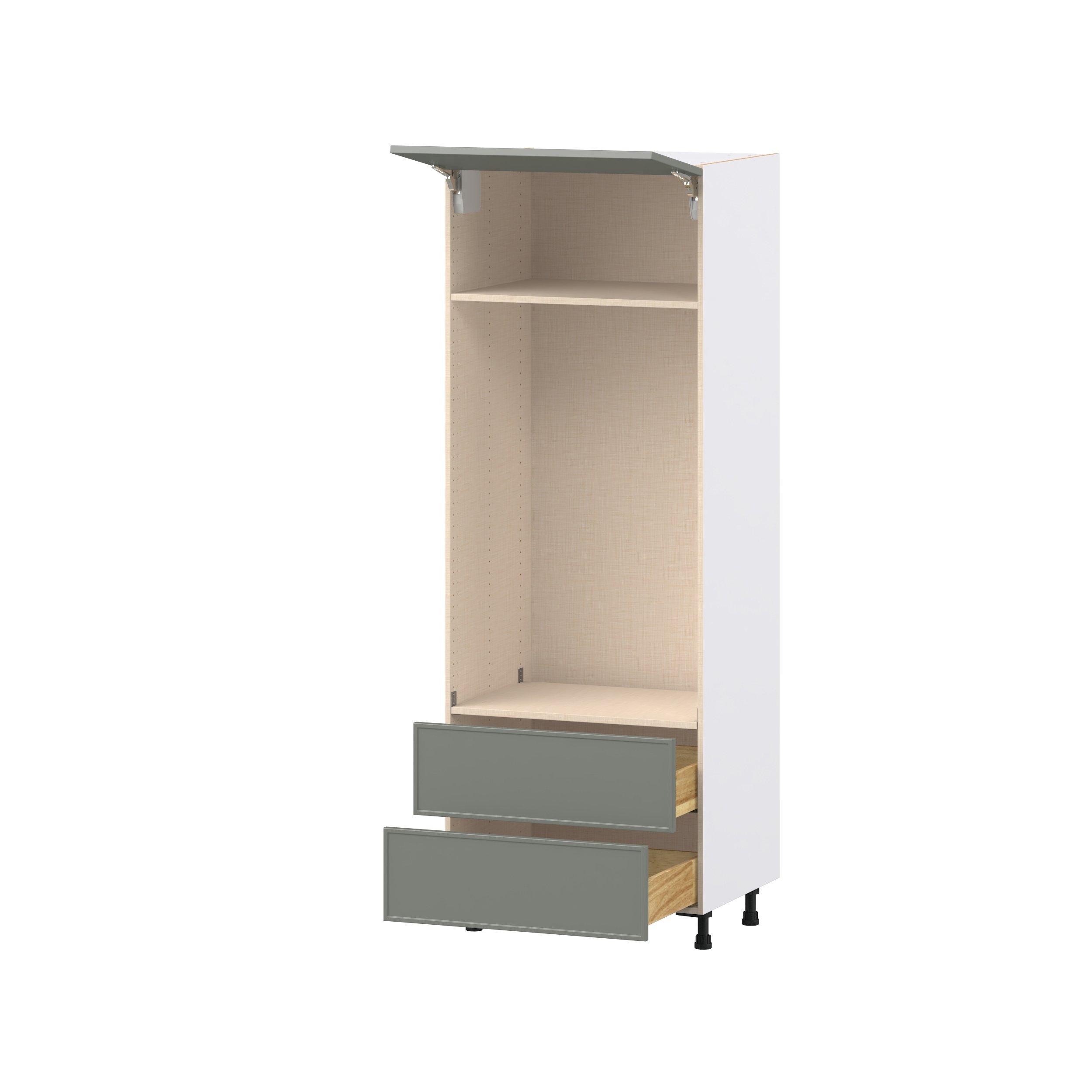 Enjoy a modern twist on a classic with Linden slim shaker cabinets. Available in premium-painted fresh washed linen and earthy moss green finishes, this collection exudes warmth and creates an inviting atmosphere Crafted from one-piece MDF Studio Design Collection Linden 30 in. Painted Moss Green Lift Up Door and Drawer Microwave/Oven Pantry Cabinet is designed to resist hairline cracks while the easy-to-clean finish stands up to stains and moisture. Featuring 5-piece doors and dovetail drawer joints, these cabinets offer durability and elegance. This collection combines style with everyday storage solutions.