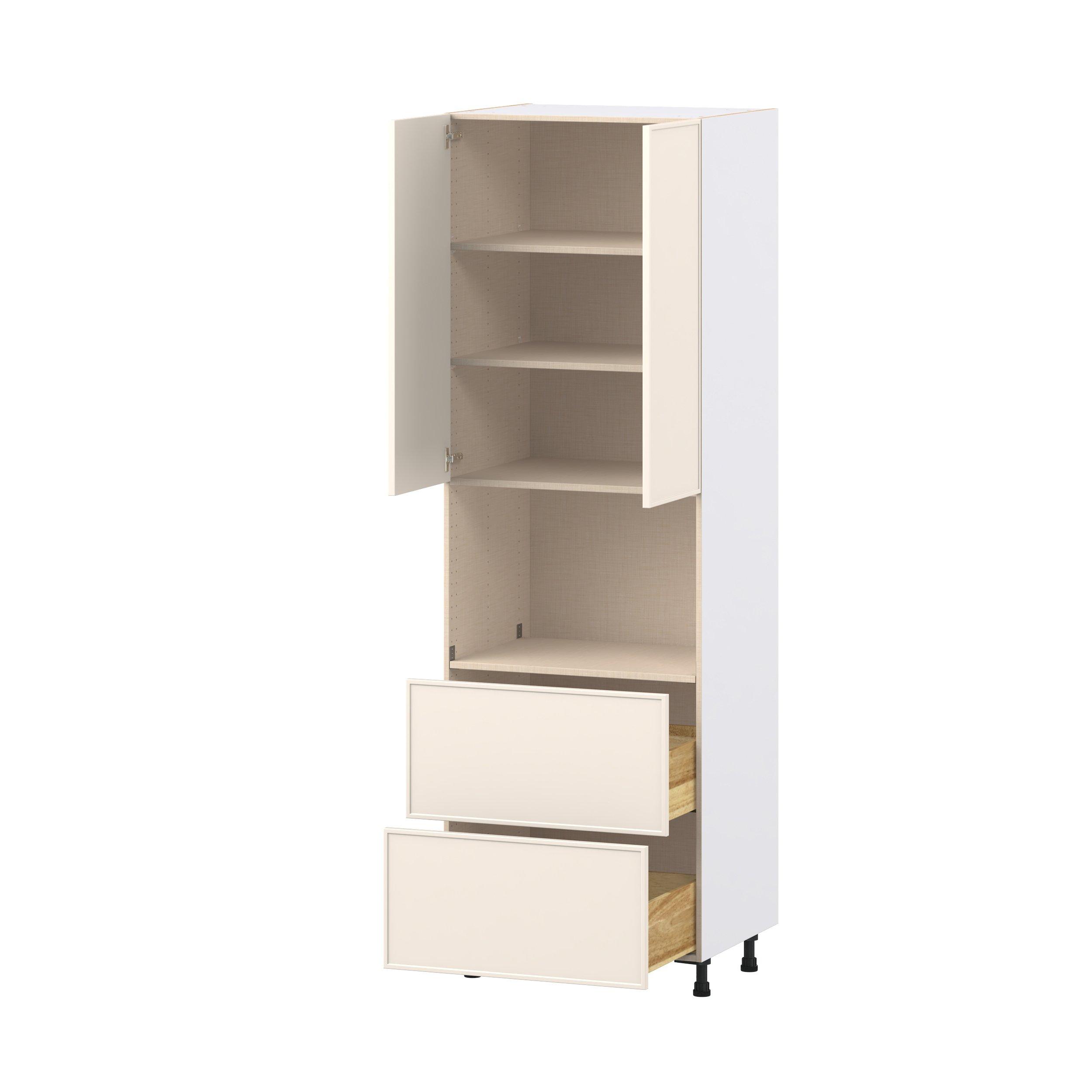 Enjoy a modern twist on a classic with Linden slim shaker cabinets. Available in premium-painted fresh washed linen and earthy moss green finishes, this collection exudes warmth and creates an inviting atmosphere Crafted from one-piece MDF Studio Design Collection Linden 30 in. Painted Washed Linen Door and Drawer Microwave Pantry Cabinet is designed to resist hairline cracks while the easy-to-clean finish stands up to stains and moisture. Featuring 5-piece doors and dovetail drawer joints, these cabinets offer durability and elegance. This collection combines style with everyday storage solutions.