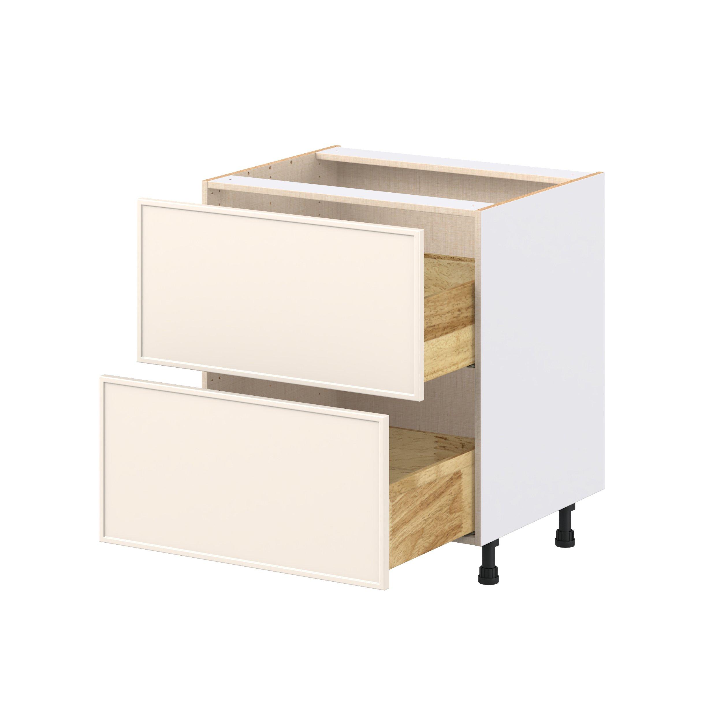 Enjoy a modern twist on a classic with Linden slim shaker cabinets. Available in premium-painted fresh washed linen and earthy moss green finishes, this collection exudes warmth and creates an inviting atmosphere Crafted from one-piece MDF Studio Design Collection Linden 30 in. Painted Washed Linen Drawer Base Cabinet is designed to resist hairline cracks while the easy-to-clean finish stands up to stains and moisture. Featuring 5-piece doors and dovetail drawer joints, these cabinets offer durability and elegance. This collection combines style with everyday storage solutions.