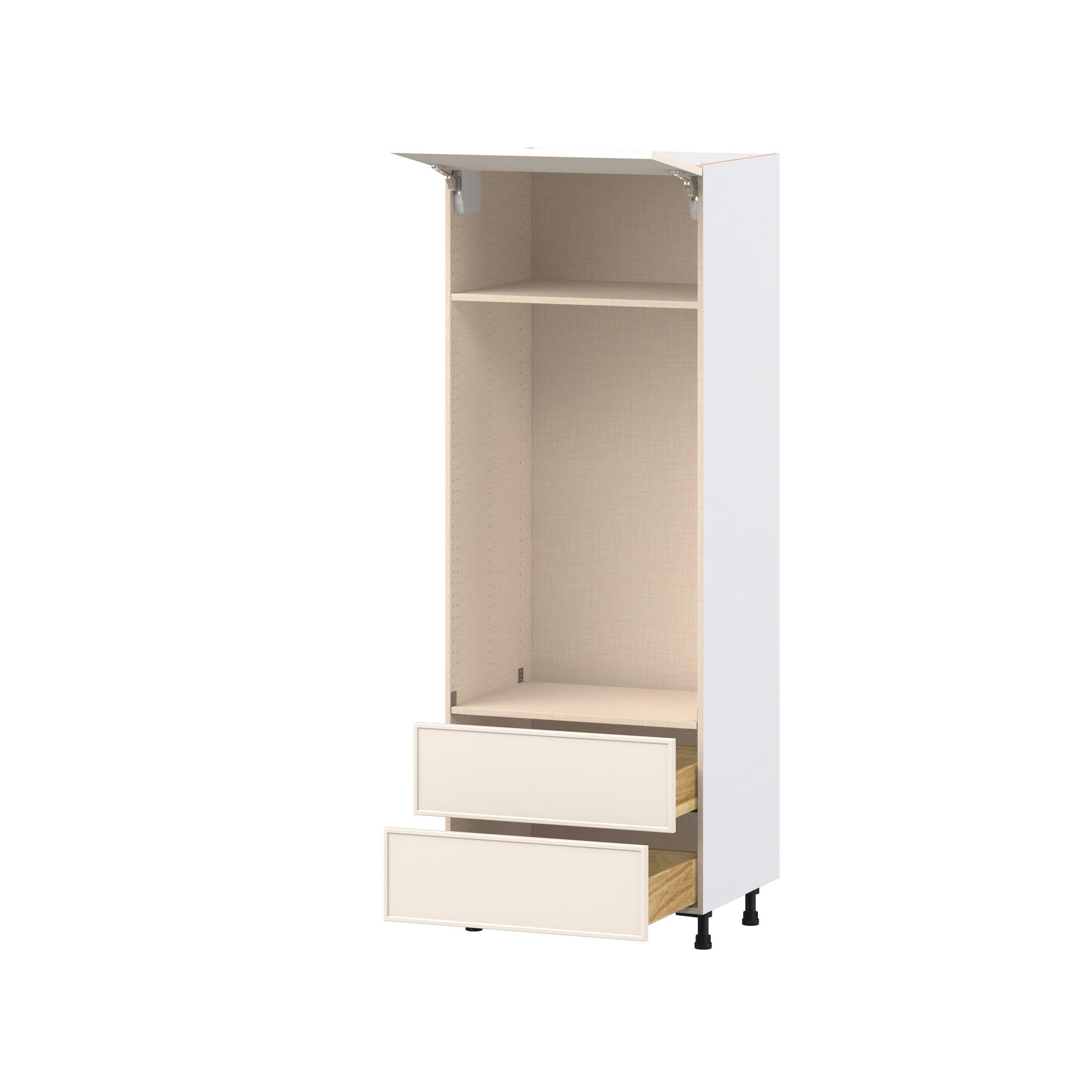 Enjoy a modern twist on a classic with Linden slim shaker cabinets. Available in premium-painted fresh washed linen and earthy moss green finishes, this collection exudes warmth and creates an inviting atmosphere Crafted from one-piece MDF Studio Design Collection Linden 30 in. Painted Washed Linen Lift Up Door and Drawer Microwave/Oven Pantry Cabinet is designed to resist hairline cracks while the easy-to-clean finish stands up to stains and moisture. Featuring 5-piece doors and dovetail drawer joints, these cabinets offer durability and elegance. This collection combines style with everyday storage solutions.