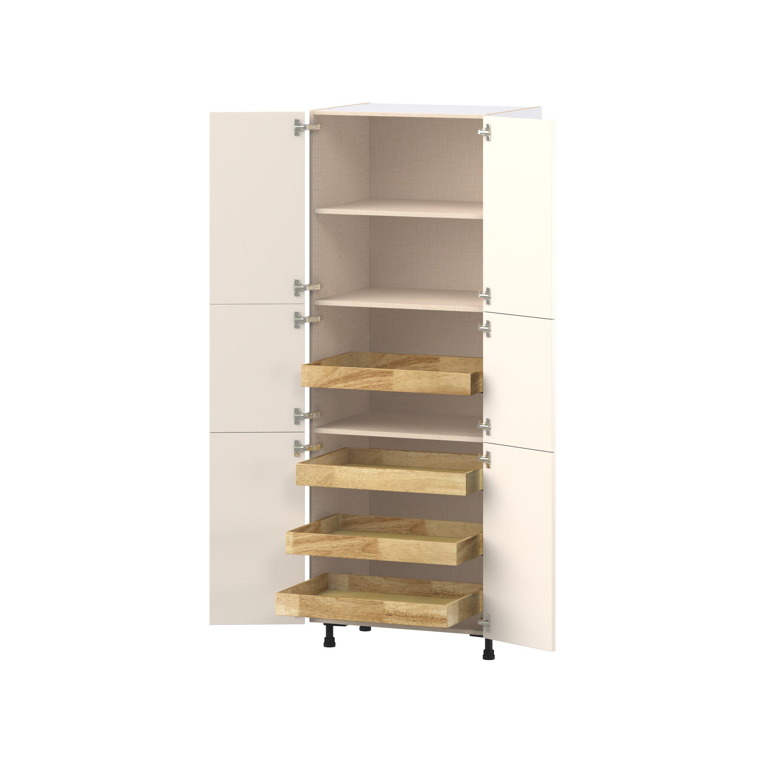 Enjoy a modern twist on a classic with Linden slim shaker cabinets. Available in premium-painted fresh washed linen and earthy moss green finishes, this collection exudes warmth and creates an inviting atmosphere Crafted from one-piece MDF Studio Design Collection Linden 30 in. Painted Washed Linen Pantry Cabinet with Inner Pull-Out Drawer is designed to resist hairline cracks while the easy-to-clean finish stands up to stains and moisture. Featuring 5-piece doors and dovetail drawer joints, these cabinets offer durability and elegance. This collection combines style with everyday storage solutions.