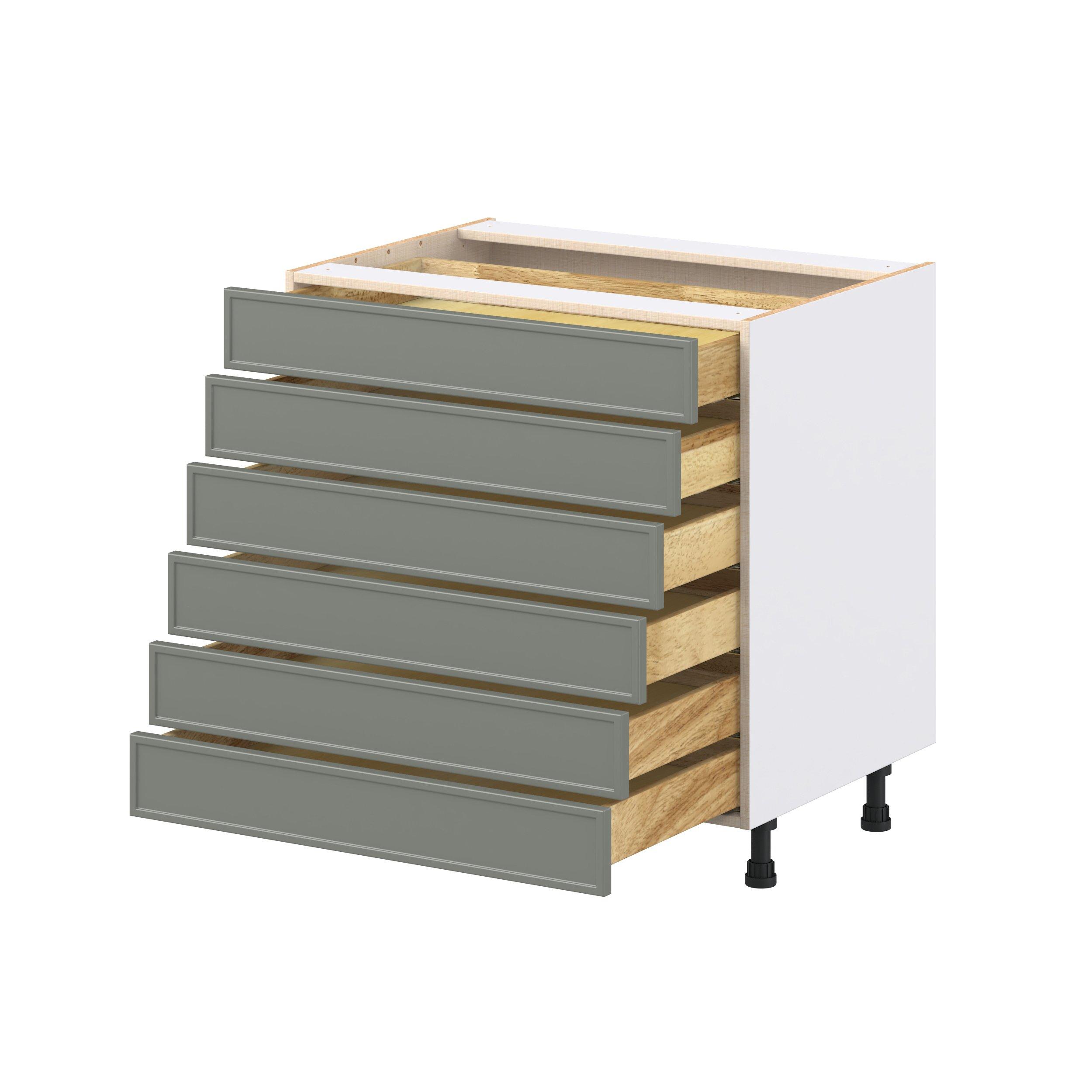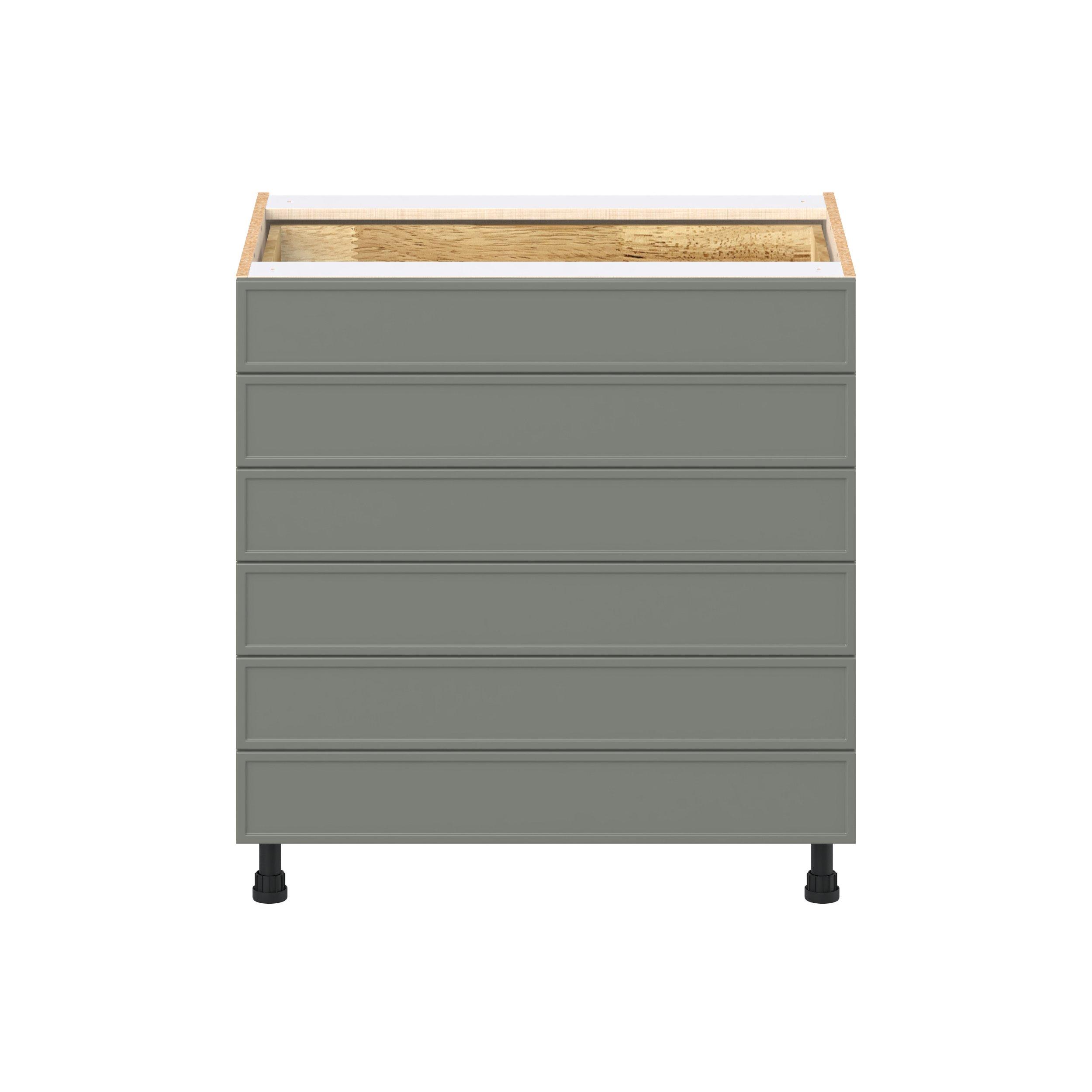 Enjoy a modern twist on a classic with Linden slim shaker cabinets. Available in premium-painted fresh washed linen and earthy moss green finishes, this collection exudes warmth and creates an inviting atmosphere Crafted from one-piece MDF Studio Design Collection Linden 33 in. Painted Moss Green Drawer Base Cabinet is designed to resist hairline cracks while the easy-to-clean finish stands up to stains and moisture. Featuring 5-piece doors and dovetail drawer joints, these cabinets offer durability and elegance. This collection combines style with everyday storage solutions.