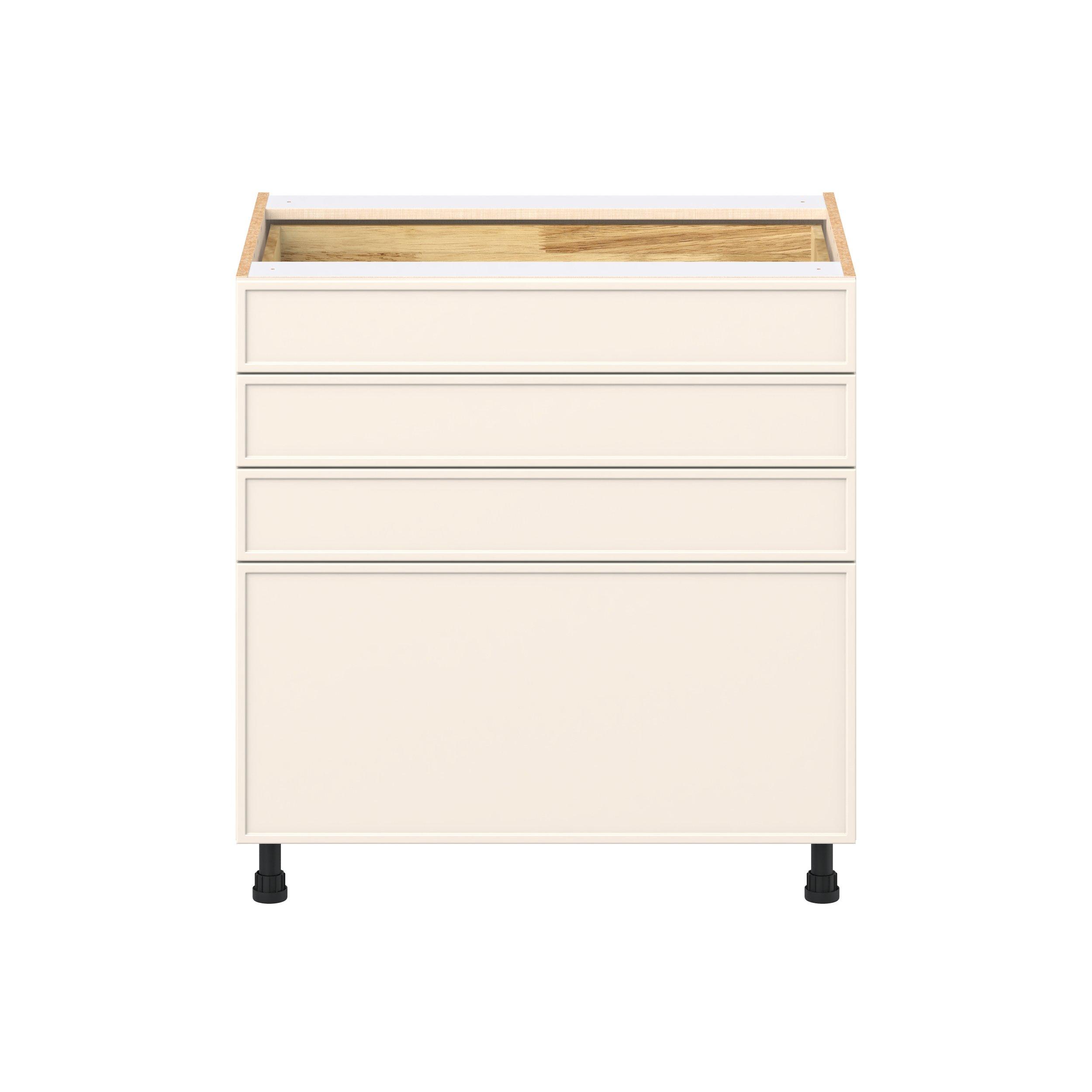 Enjoy a modern twist on a classic with Linden slim shaker cabinets. Available in premium-painted fresh washed linen and earthy moss green finishes, this collection exudes warmth and creates an inviting atmosphere Crafted from one-piece MDF Studio Design Collection Linden 33 in. Painted Washed Linen Drawer Base Cabinet is designed to resist hairline cracks while the easy-to-clean finish stands up to stains and moisture. Featuring 5-piece doors and dovetail drawer joints, these cabinets offer durability and elegance. This collection combines style with everyday storage solutions.