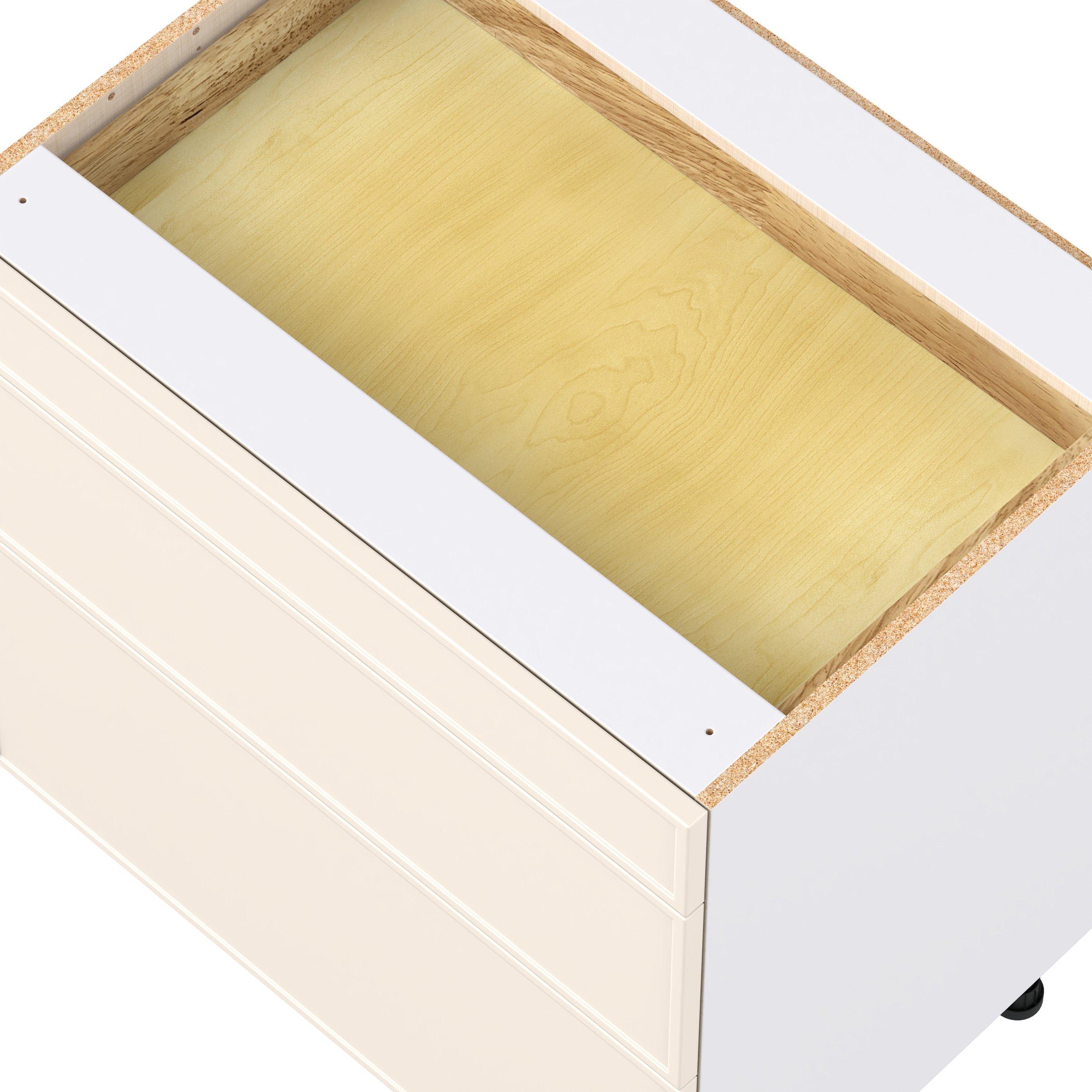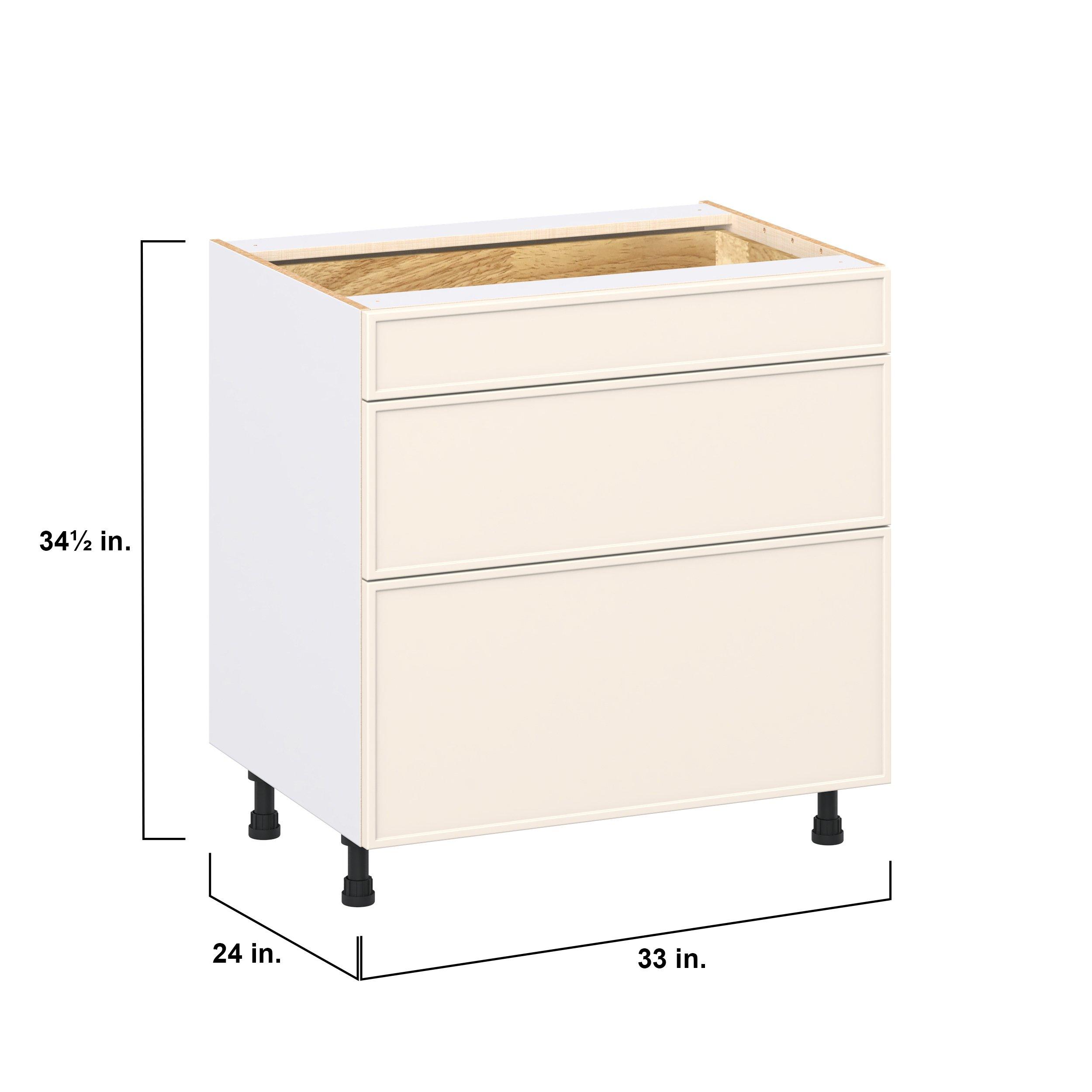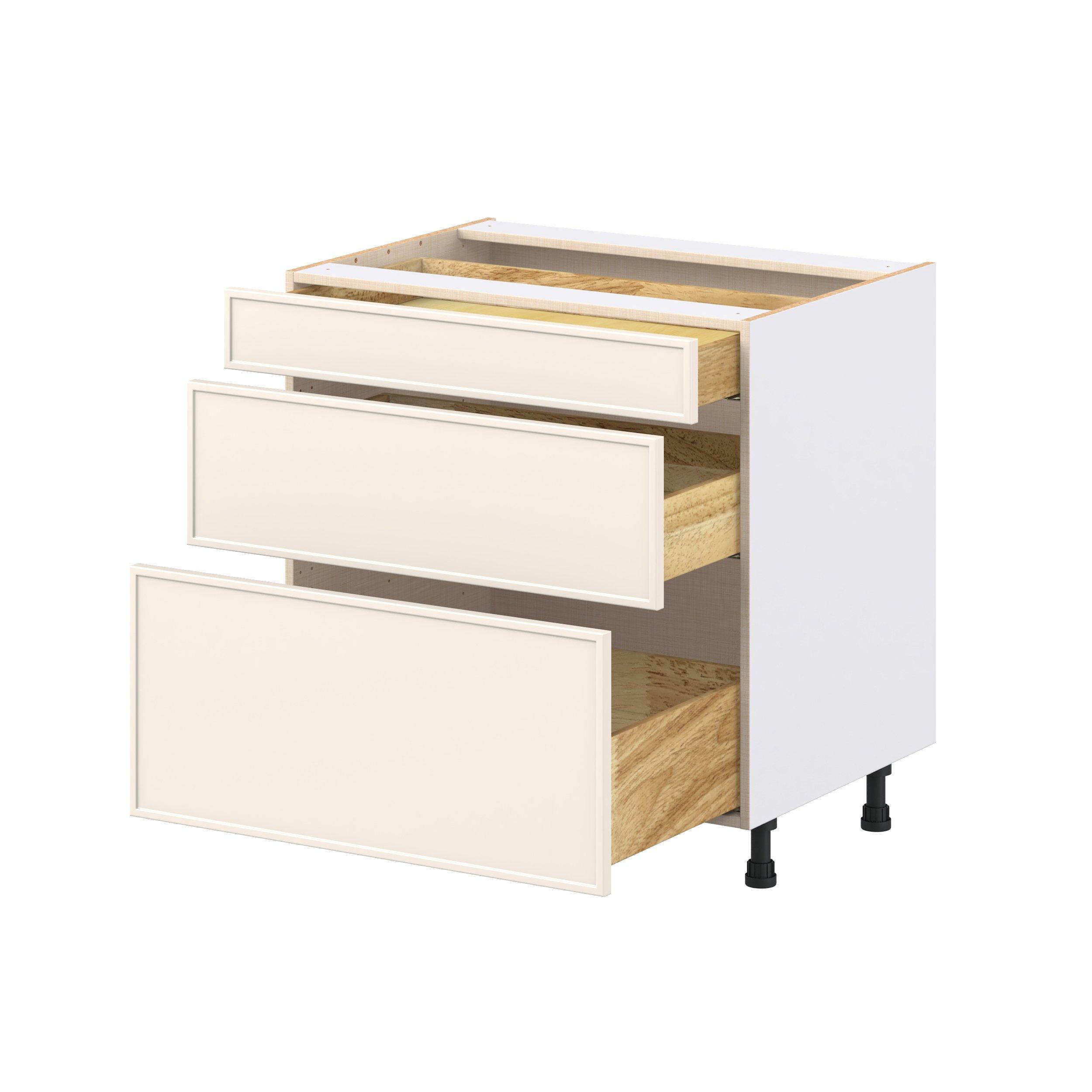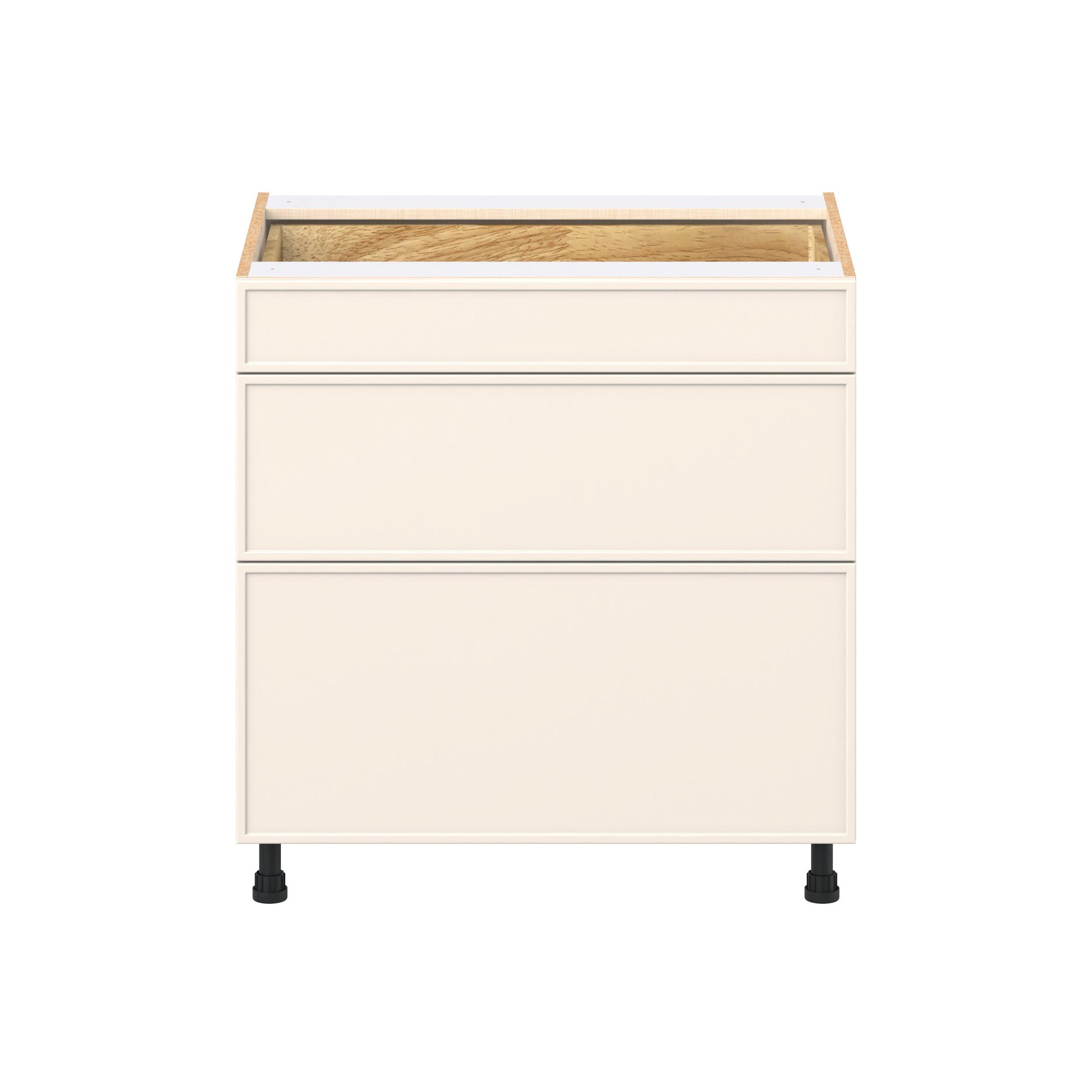 Enjoy a modern twist on a classic with Linden slim shaker cabinets. Available in premium-painted fresh washed linen and earthy moss green finishes, this collection exudes warmth and creates an inviting atmosphere Crafted from one-piece MDF Studio Design Collection Linden 33 in. Painted Washed Linen Drawer Base Cabinet is designed to resist hairline cracks while the easy-to-clean finish stands up to stains and moisture. Featuring 5-piece doors and dovetail drawer joints, these cabinets offer durability and elegance. This collection combines style with everyday storage solutions.