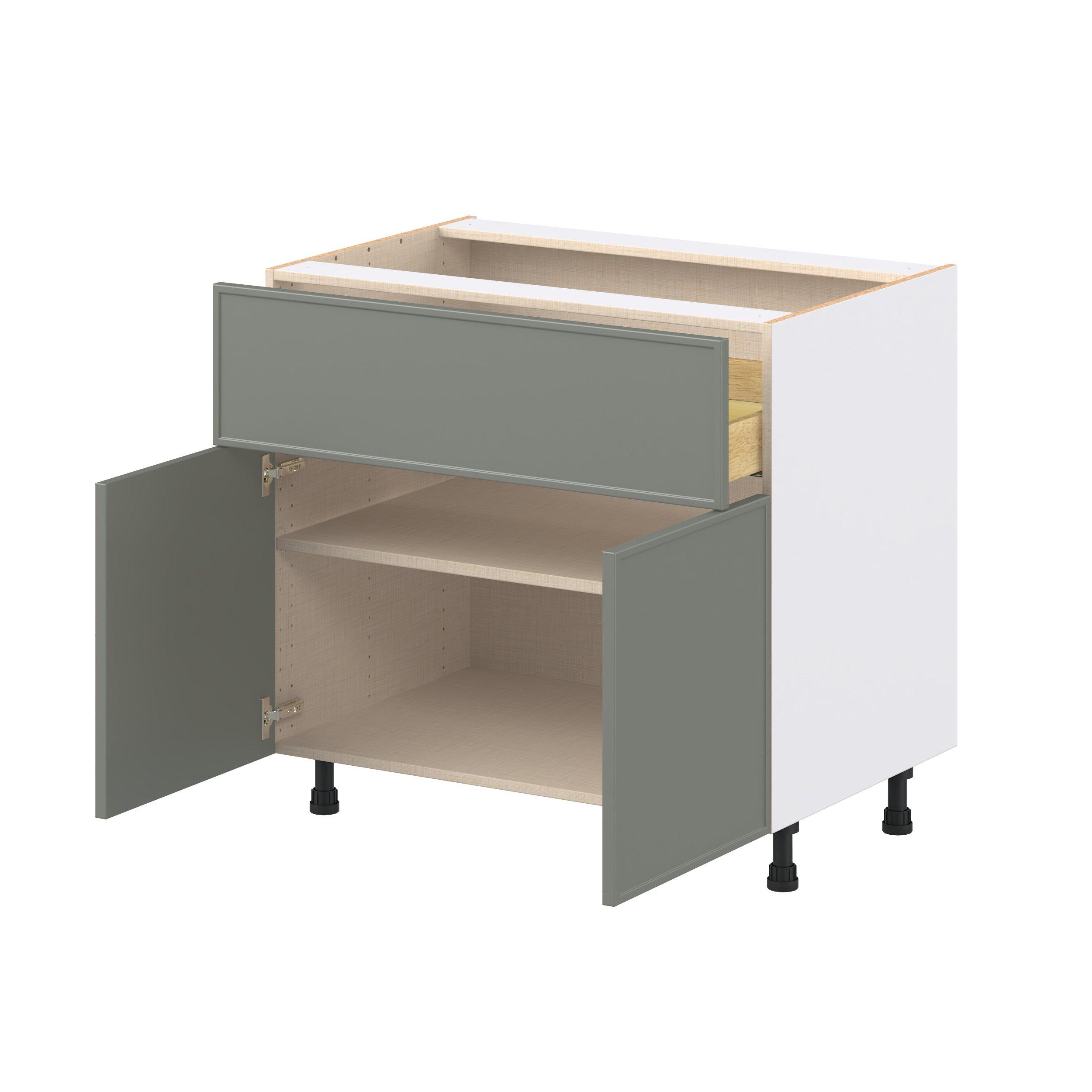 Enjoy a modern twist on a classic with Linden slim shaker cabinets. Available in premium-painted fresh washed linen and earthy moss green finishes, this collection exudes warmth and creates an inviting atmosphere Crafted from one-piece MDF Studio Design Collection Linden 36 in. Painted Moss Green Cooktop Base Cabinet is designed to resist hairline cracks while the easy-to-clean finish stands up to stains and moisture. Featuring 5-piece doors and dovetail drawer joints, these cabinets offer durability and elegance. This collection combines style with everyday storage solutions.