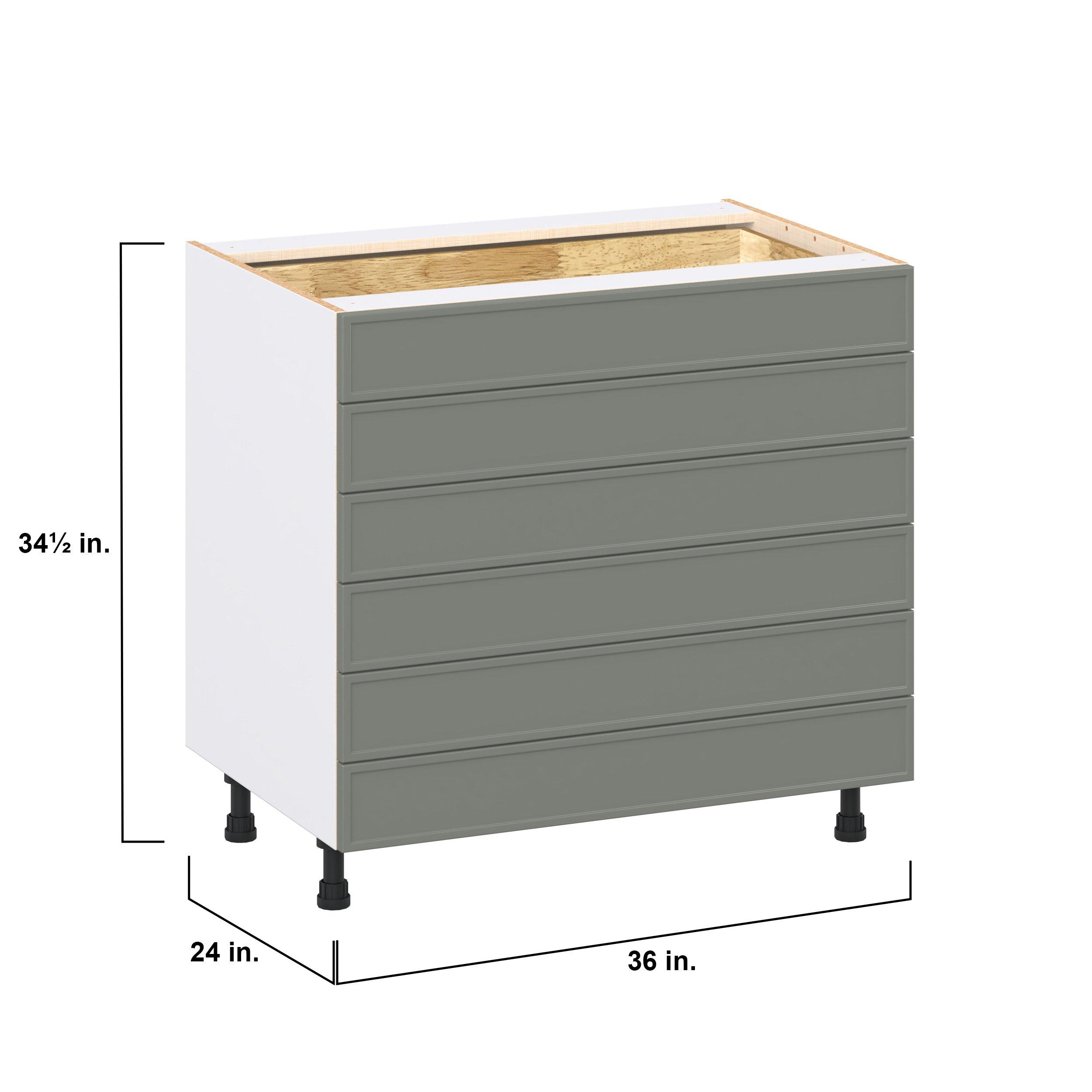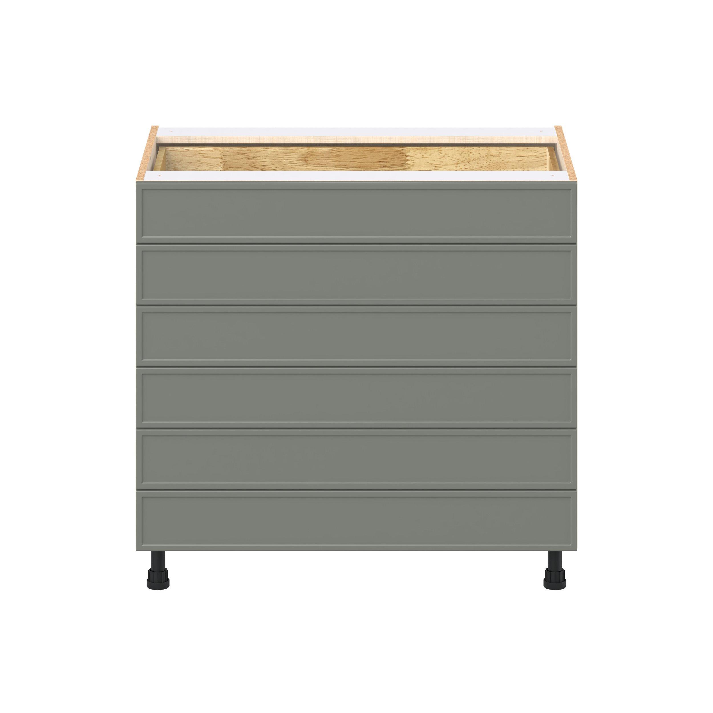 Enjoy a modern twist on a classic with Linden slim shaker cabinets. Available in premium-painted fresh washed linen and earthy moss green finishes, this collection exudes warmth and creates an inviting atmosphere Crafted from one-piece MDF Studio Design Collection Linden 36 in. Painted Moss Green Drawer Base Cabinet is designed to resist hairline cracks while the easy-to-clean finish stands up to stains and moisture. Featuring 5-piece doors and dovetail drawer joints, these cabinets offer durability and elegance. This collection combines style with everyday storage solutions.
