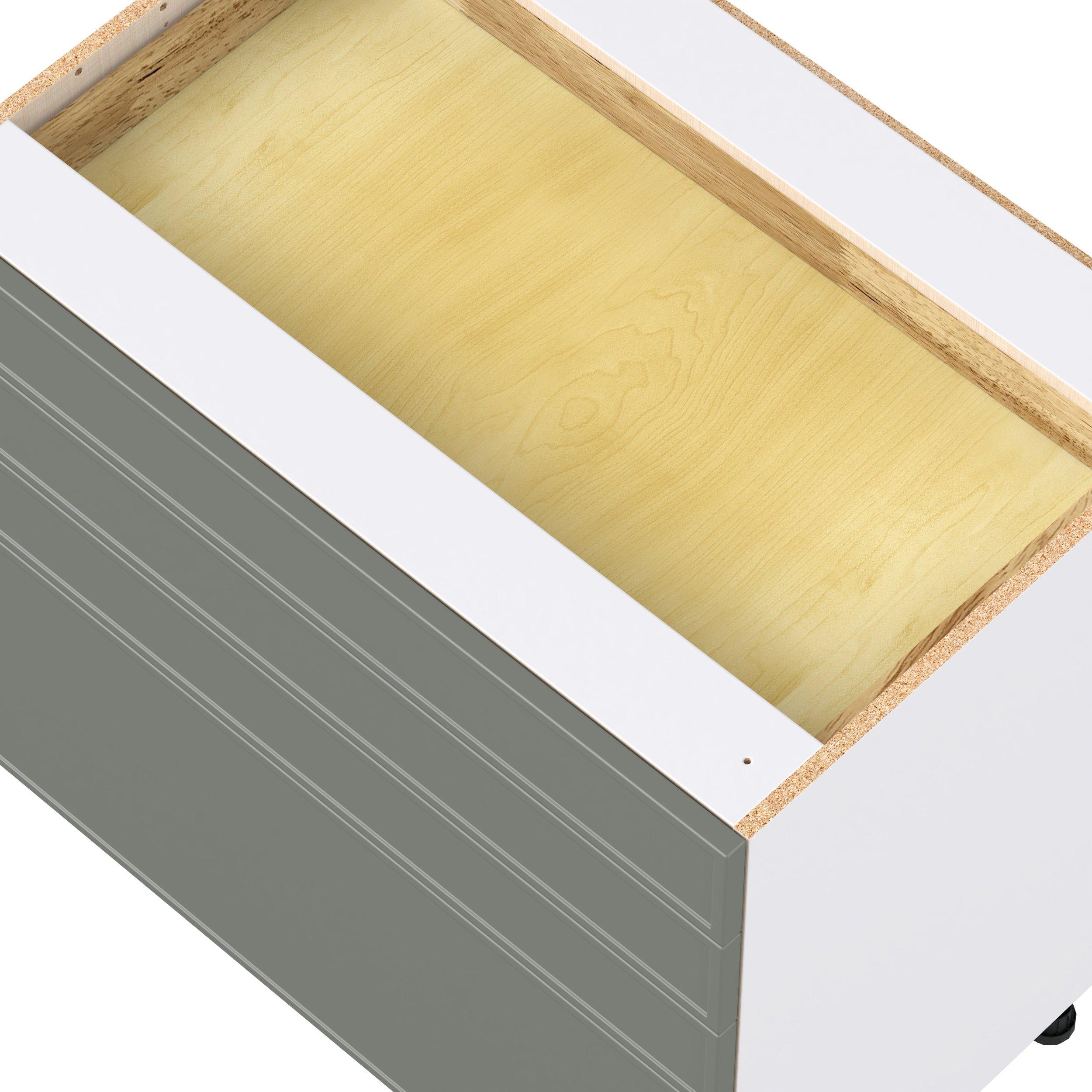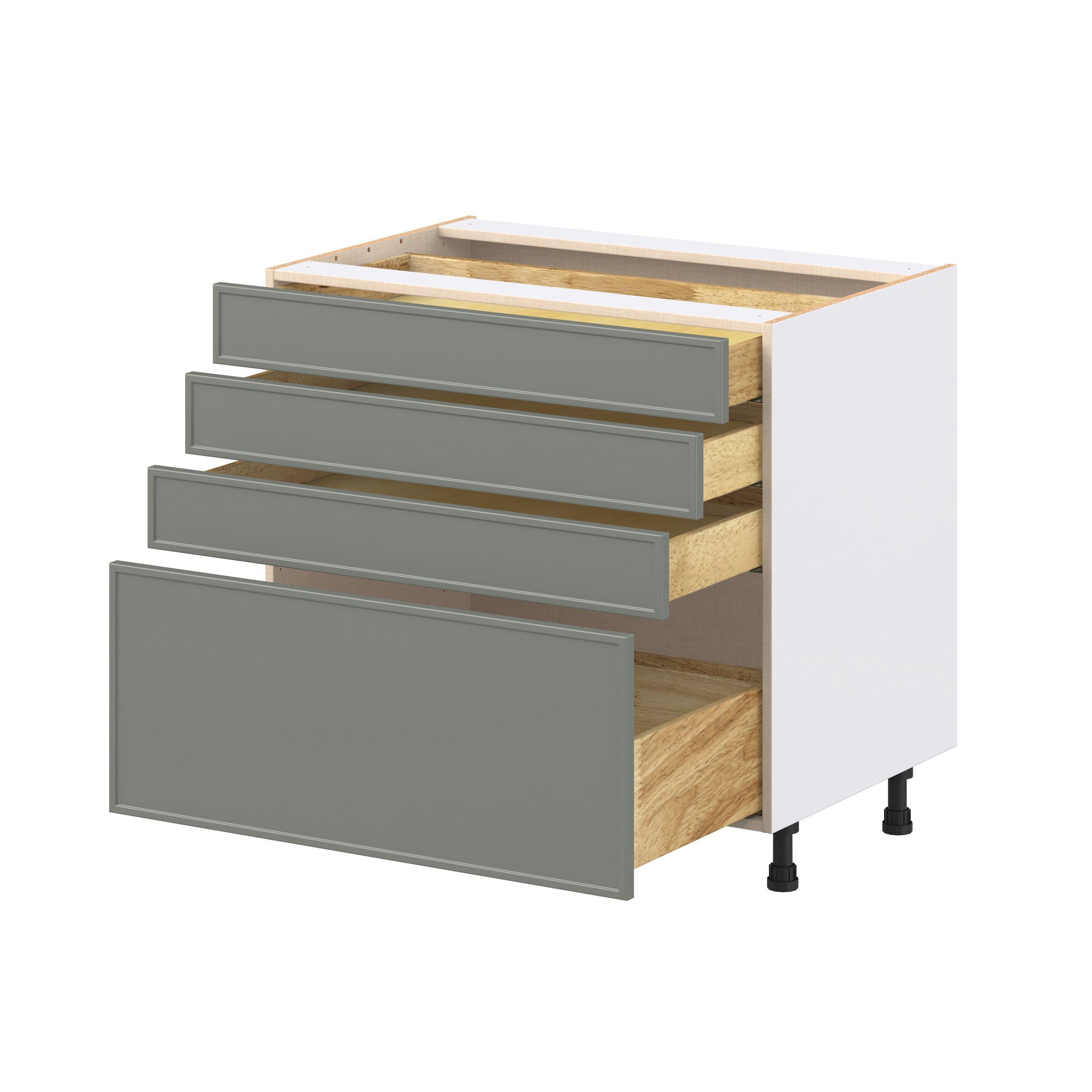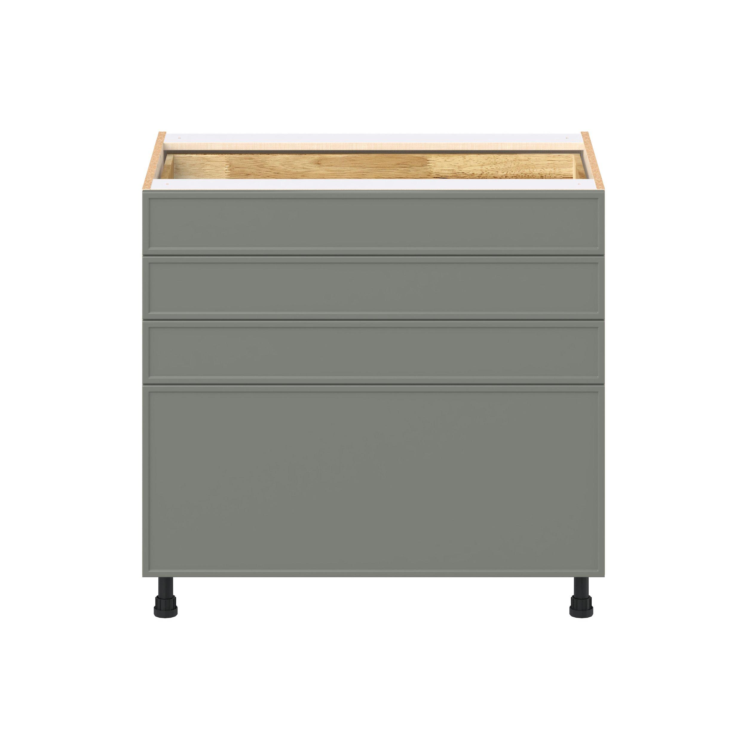 Enjoy a modern twist on a classic with Linden slim shaker cabinets. Available in premium-painted fresh washed linen and earthy moss green finishes, this collection exudes warmth and creates an inviting atmosphere Crafted from one-piece MDF Studio Design Collection Linden 36 in. Painted Moss Green Drawer Base Cabinet is designed to resist hairline cracks while the easy-to-clean finish stands up to stains and moisture. Featuring 5-piece doors and dovetail drawer joints, these cabinets offer durability and elegance. This collection combines style with everyday storage solutions.