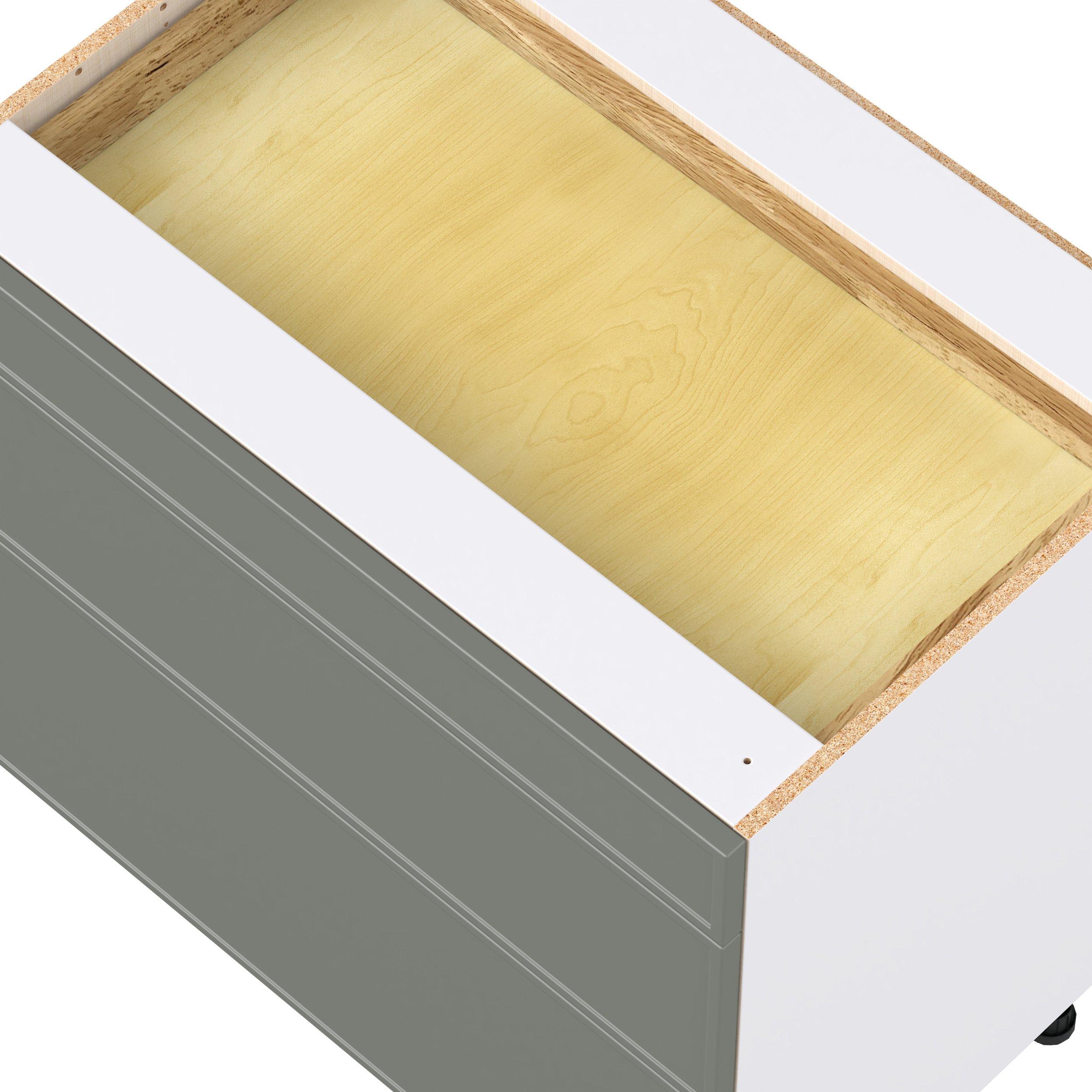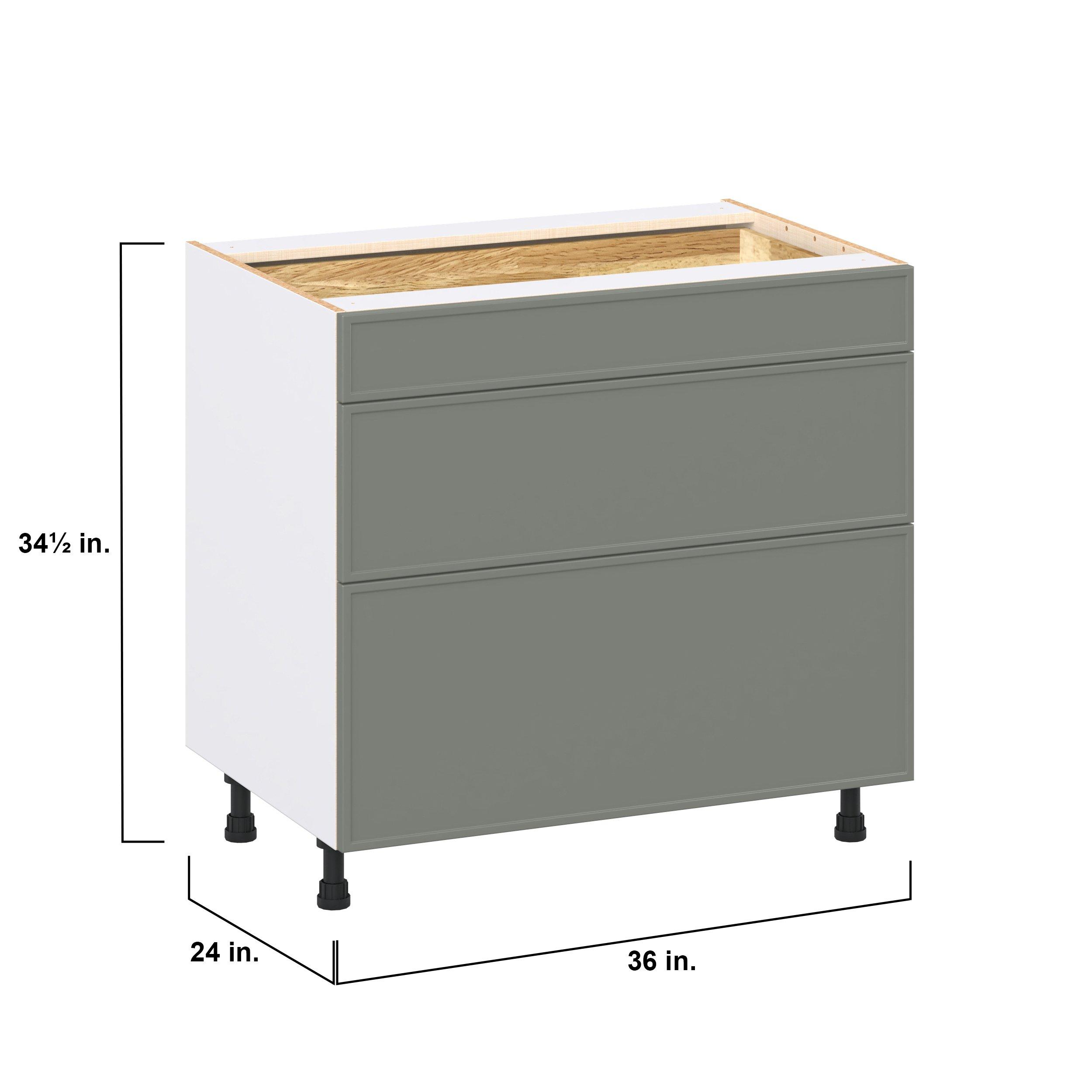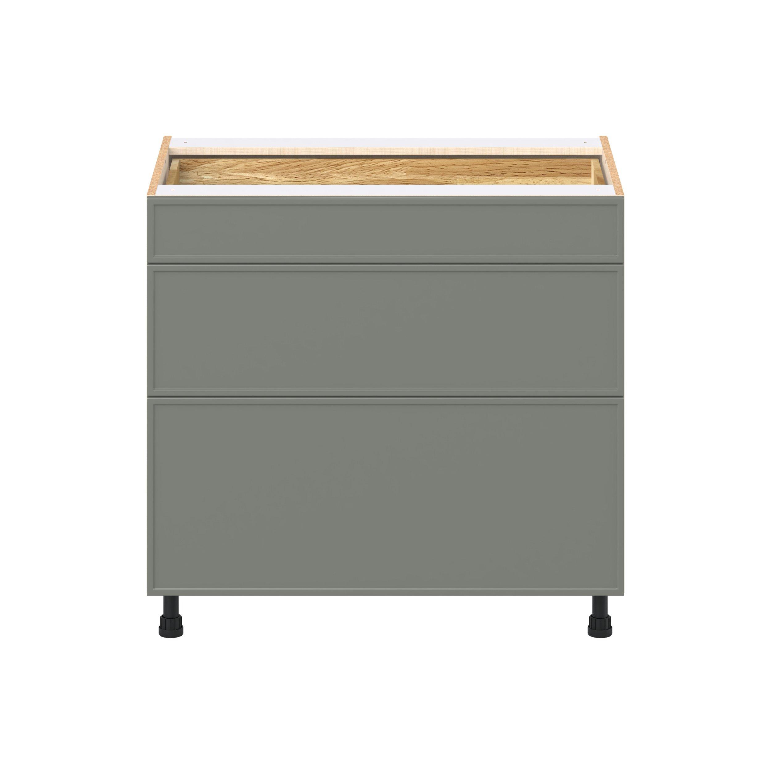 Enjoy a modern twist on a classic with Linden slim shaker cabinets. Available in premium-painted fresh washed linen and earthy moss green finishes, this collection exudes warmth and creates an inviting atmosphere Crafted from one-piece MDF Studio Design Collection Linden 36 in. Painted Moss Green Drawer Base Cabinet is designed to resist hairline cracks while the easy-to-clean finish stands up to stains and moisture. Featuring 5-piece doors and dovetail drawer joints, these cabinets offer durability and elegance. This collection combines style with everyday storage solutions.