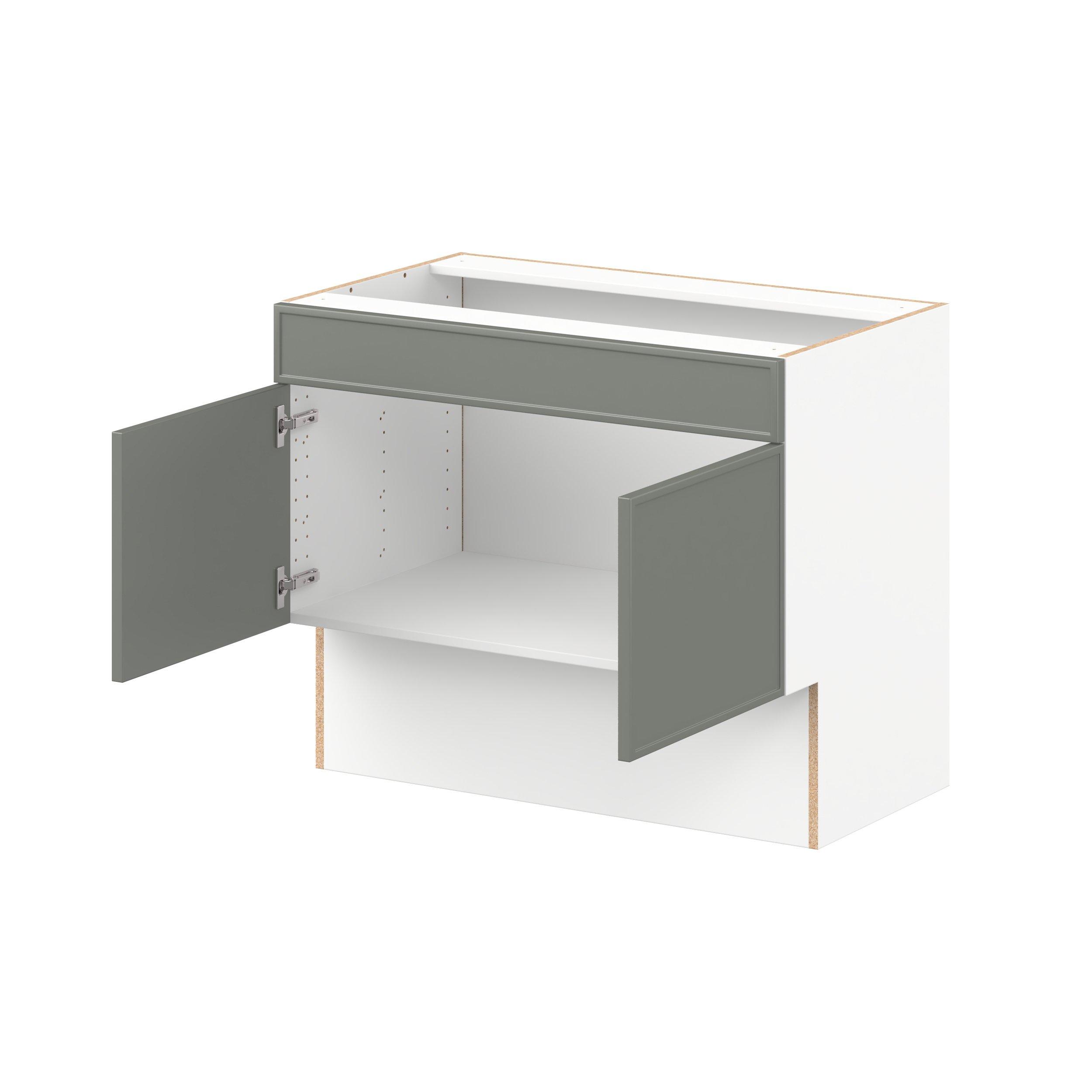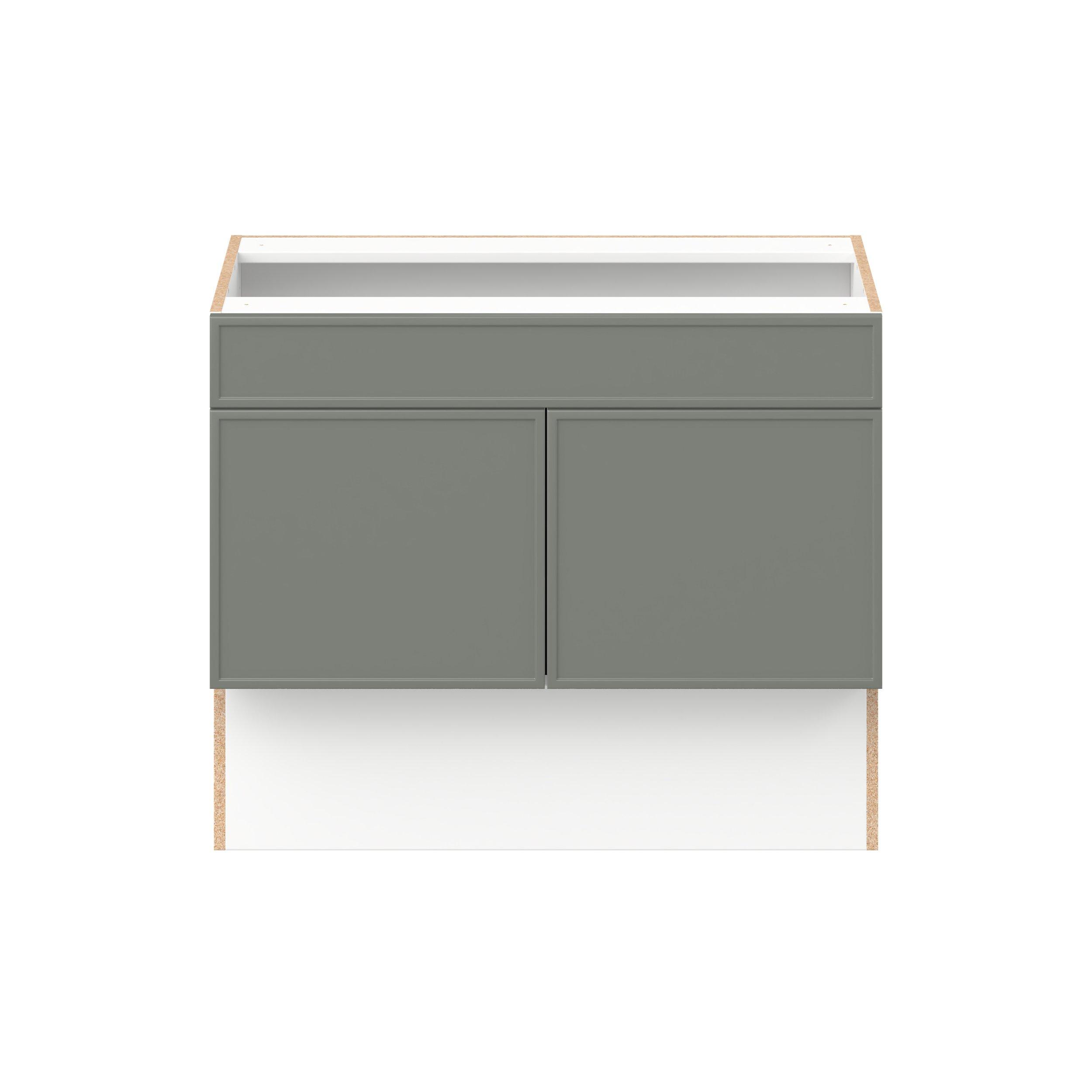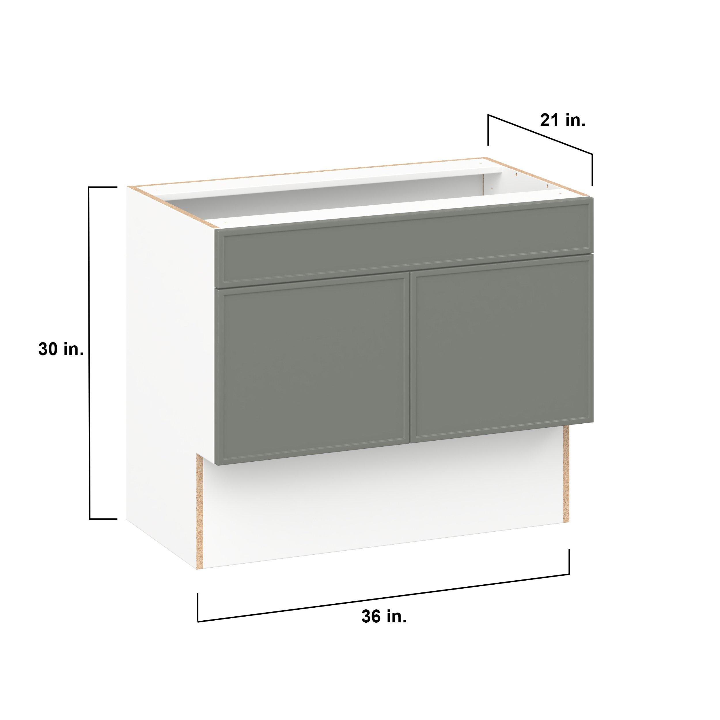 Enjoy a modern twist on a classic with Linden slim shaker cabinets. Available in premium-painted fresh washed linen and earthy moss green finishes, this collection exudes warmth and creates an inviting atmosphere Crafted from one-piece MDF Studio Design Collection Linden 36 in. Painted Moss Green Vanity Sink Base Cabinet with Removable Front is designed to resist hairline cracks while the easy-to-clean finish stands up to stains and moisture. Featuring 5-piece doors and dovetail drawer joints, these cabinets offer durability and elegance. This collection combines style with everyday storage solutions.
