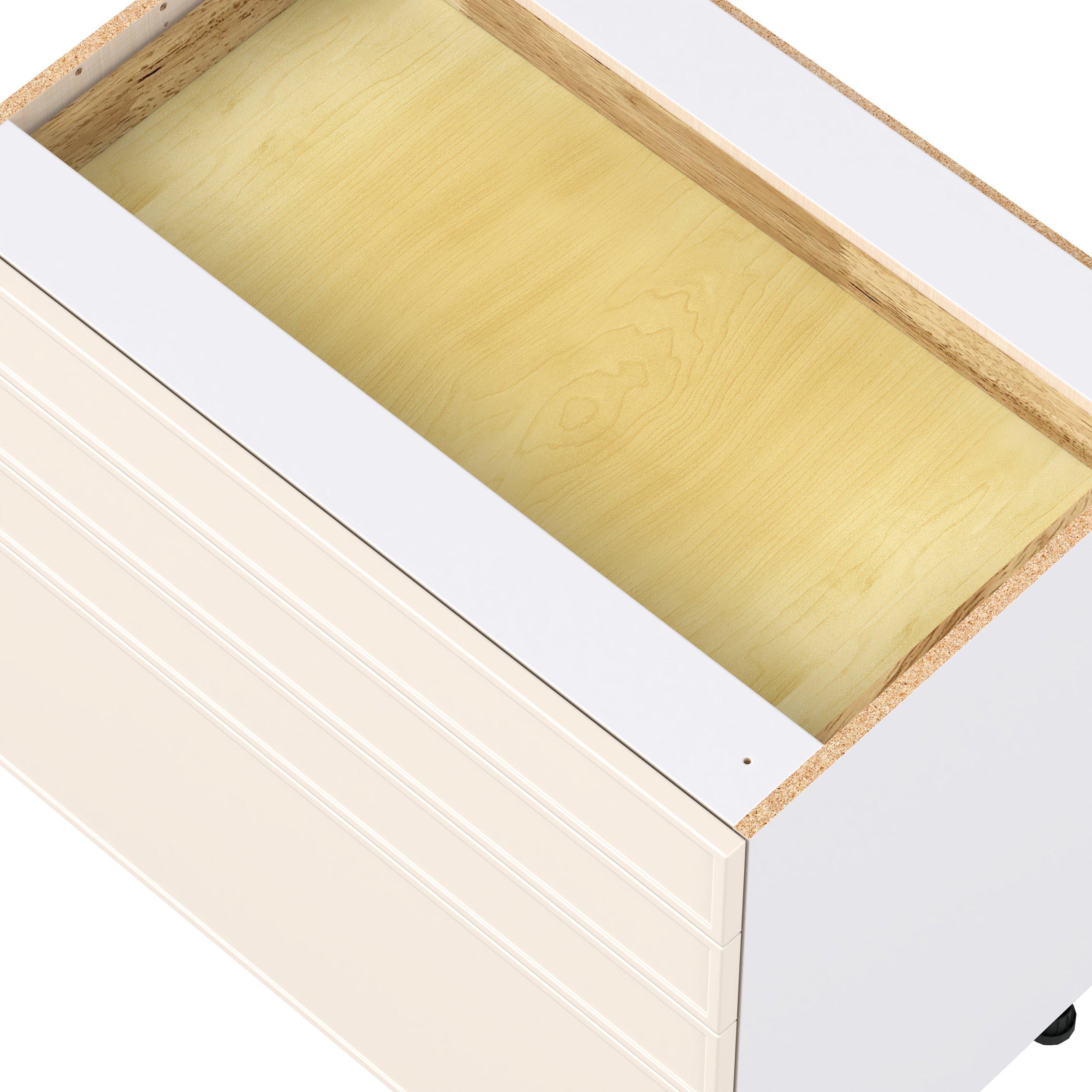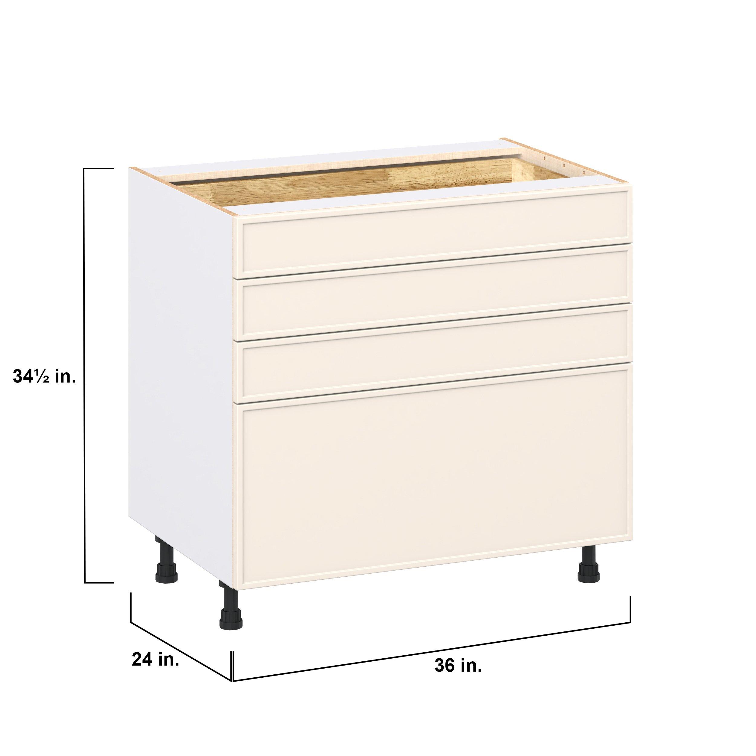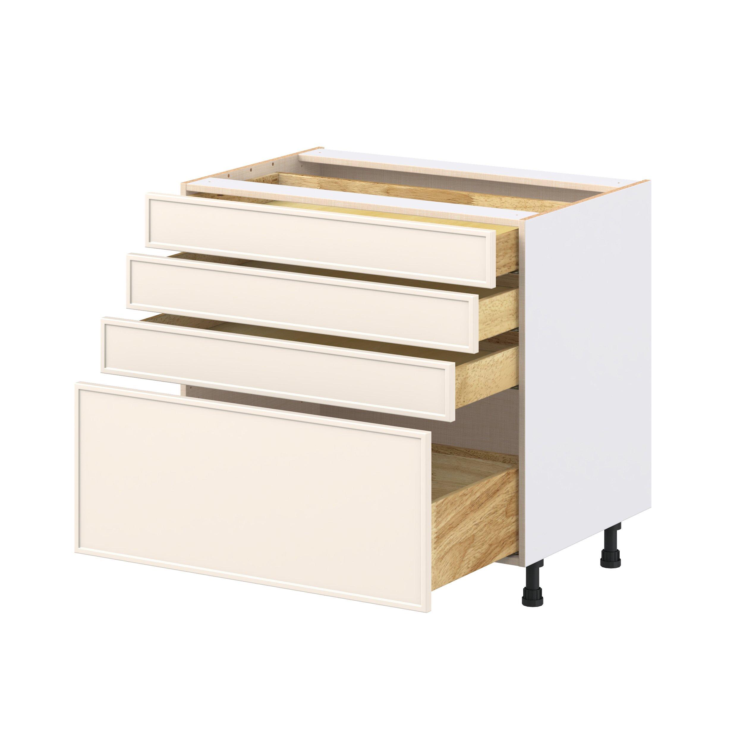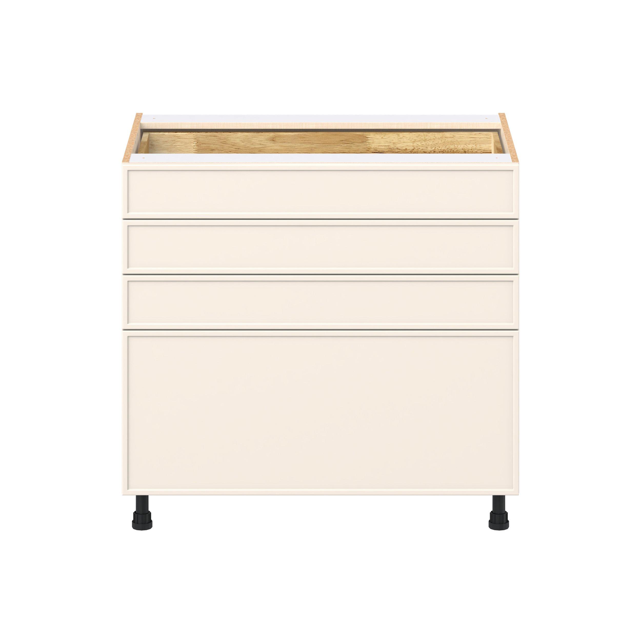 Enjoy a modern twist on a classic with Linden slim shaker cabinets. Available in premium-painted fresh washed linen and earthy moss green finishes, this collection exudes warmth and creates an inviting atmosphere Crafted from one-piece MDF Studio Design Collection Linden 36 in. Painted Washed Linen Drawer Base Cabinet is designed to resist hairline cracks while the easy-to-clean finish stands up to stains and moisture. Featuring 5-piece doors and dovetail drawer joints, these cabinets offer durability and elegance. This collection combines style with everyday storage solutions.