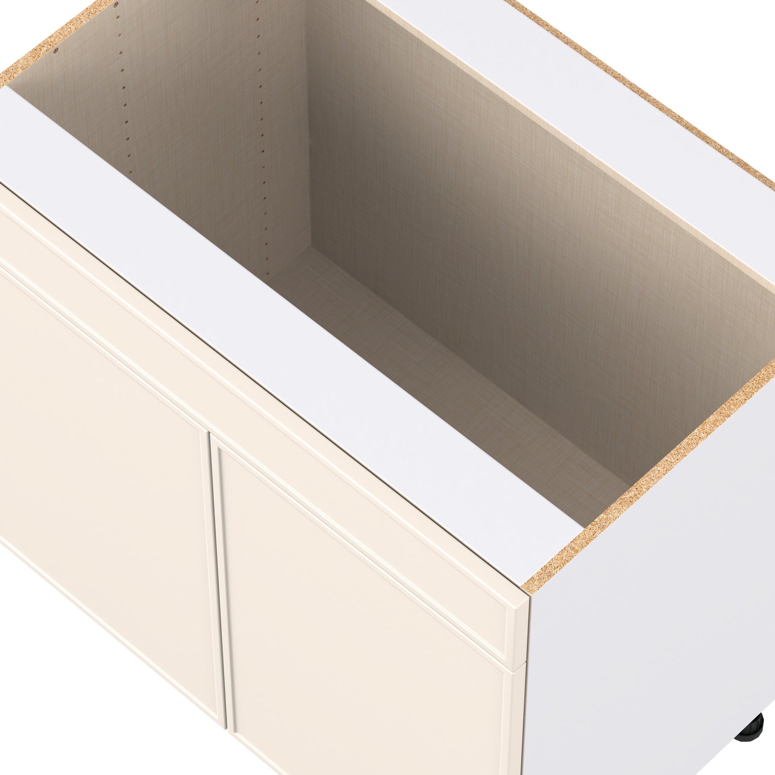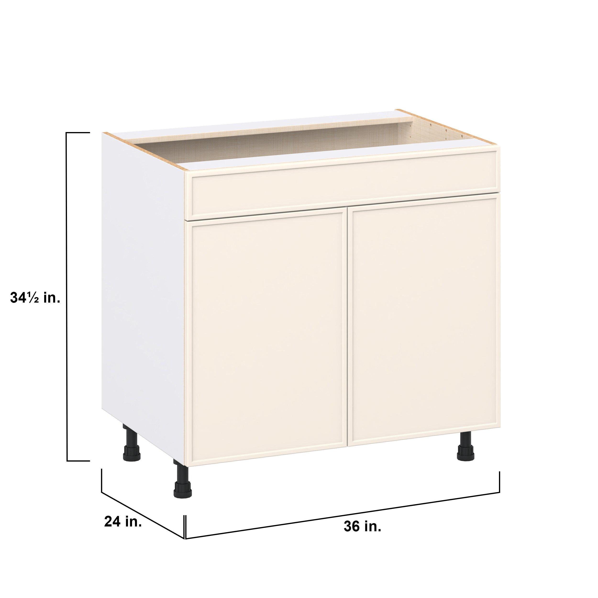 Enjoy a modern twist on a classic with Linden slim shaker cabinets. Available in premium-painted fresh washed linen and earthy moss green finishes, this collection exudes warmth and creates an inviting atmosphere Crafted from one-piece MDF Studio Design Collection Linden 36 in. Painted Washed Linen Sink Base Cabinet with False Front is designed to resist hairline cracks while the easy-to-clean finish stands up to stains and moisture. Featuring 5-piece doors and dovetail drawer joints, these cabinets offer durability and elegance. This collection combines style with everyday storage solutions.