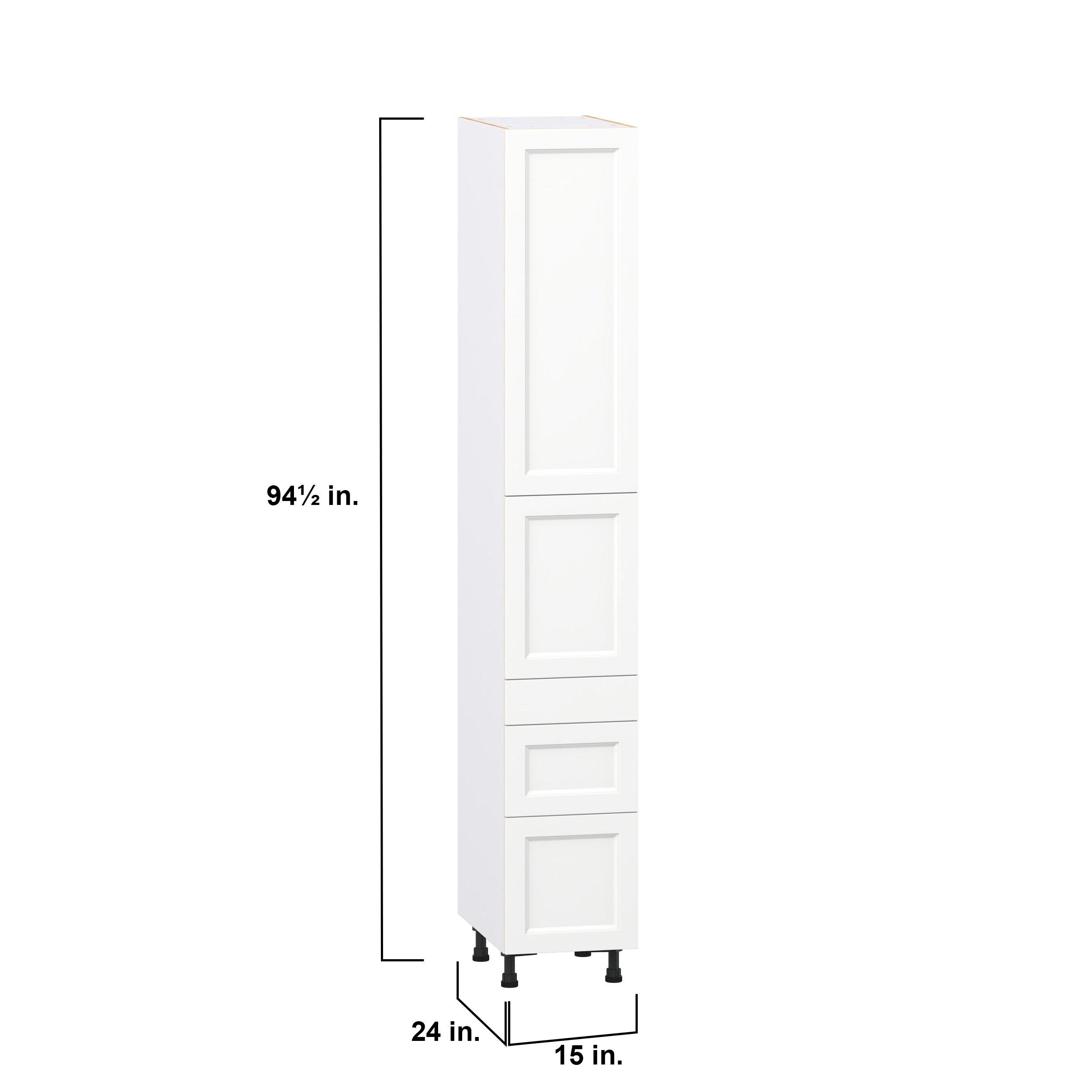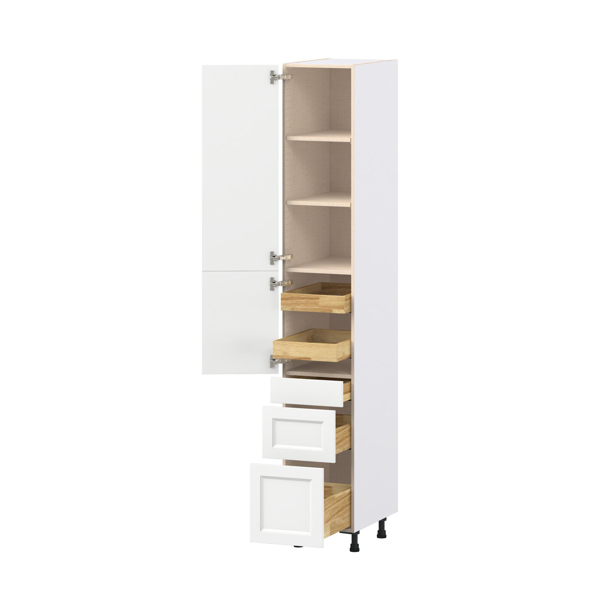 Make a statement with Peachtree premium painted shaker-inspired cabinets, offering both style and durability for years to come. Available in classic bright white and rich midnight blue, this collection is designed to fit seamlessly into both modern and transitional interiors. Crafted from one-piece MDF Studio Design Collection Peachtree 15 in. Painted Bright White Door and Drawer Pantry Cabinet with Inner Pull-Out is designed to resist hairline cracks while the easy-to-clean finish stands up to stains and moisture. Featuring 5-piece doors and dovetail drawer joints, these cabinets offer durability and elegance. This collection combines style with everyday storage solutions.