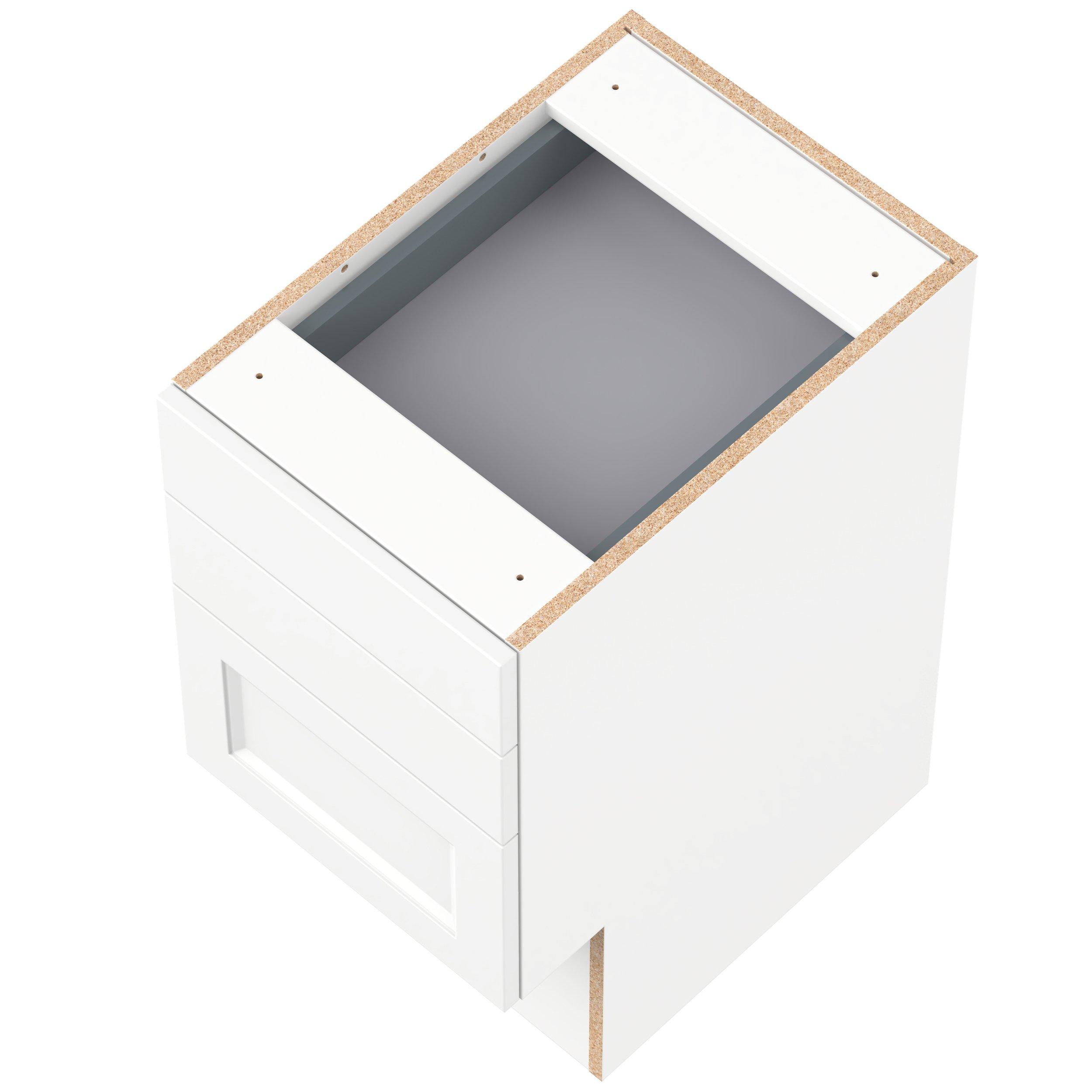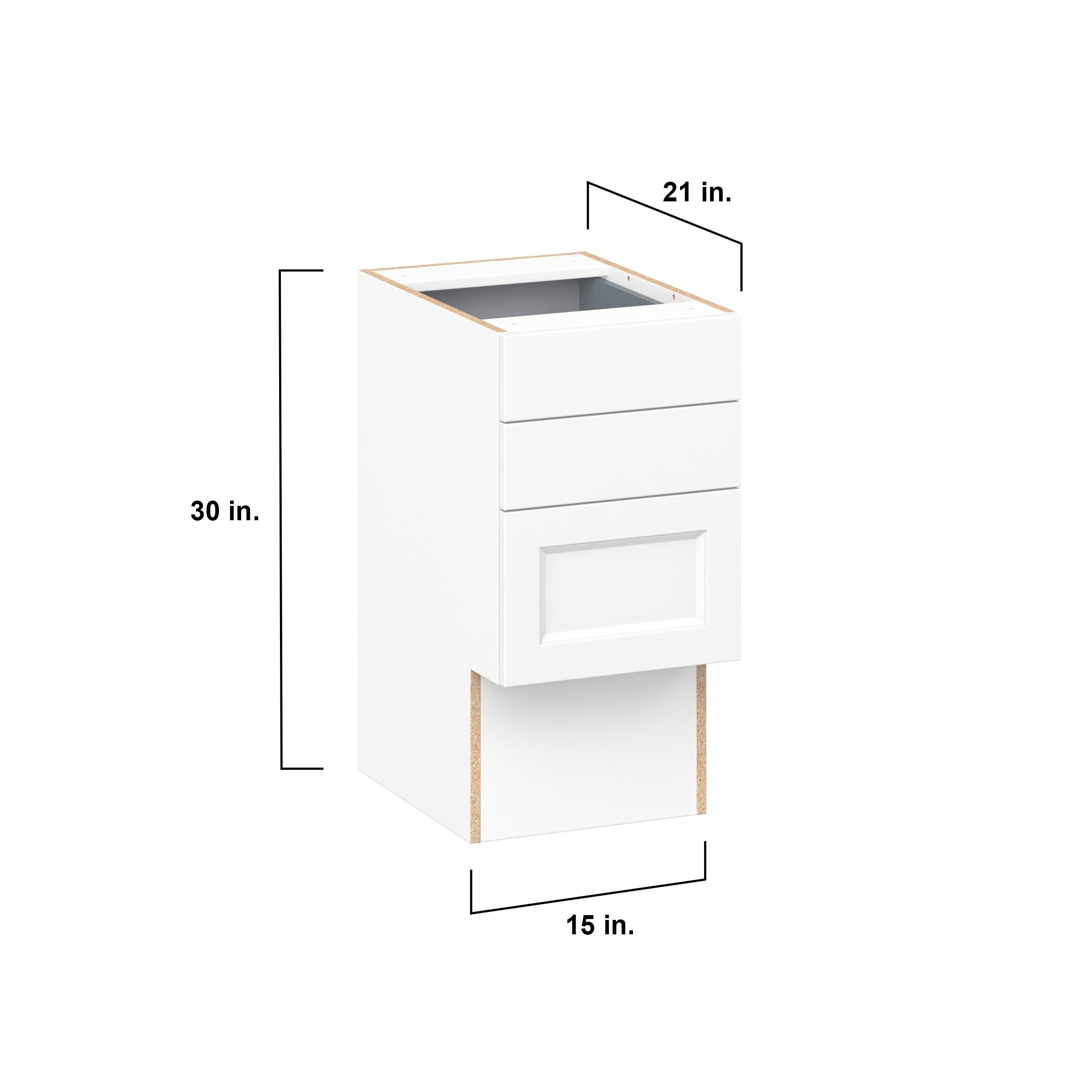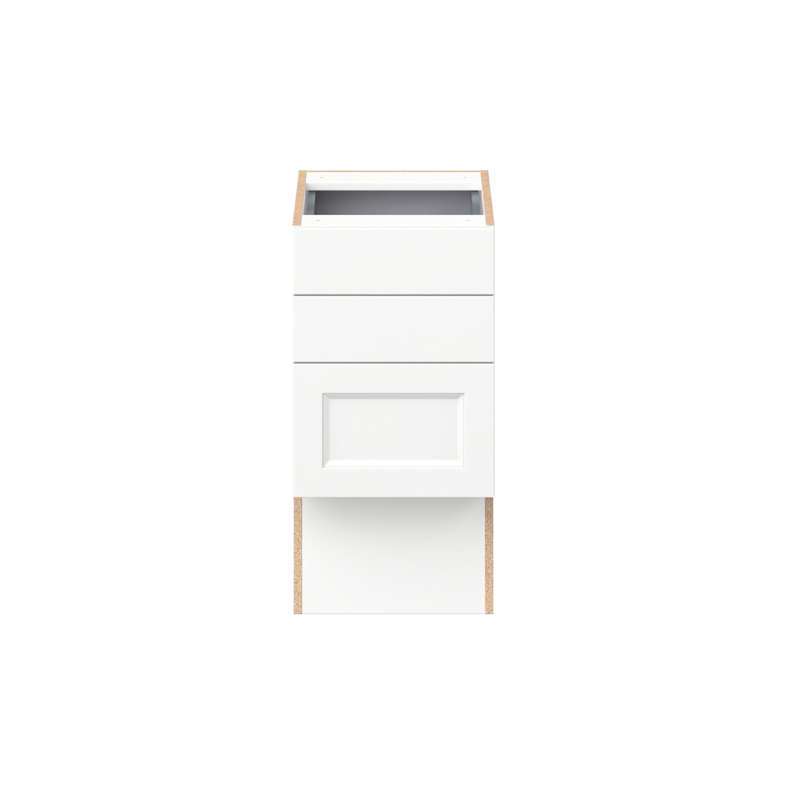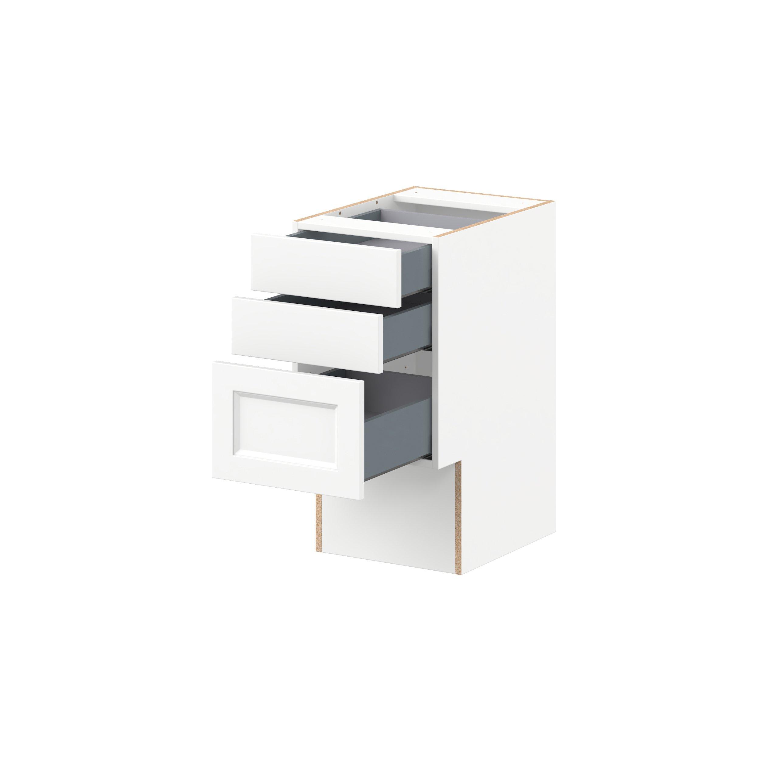 Make a statement with Peachtree premium painted shaker-inspired cabinets, offering both style and durability for years to come. Available in classic bright white and rich midnight blue, this collection is designed to fit seamlessly into both modern and transitional interiors. Crafted from one-piece MDF Studio Design Collection Peachtree 15 in. Painted Bright White Vanity Drawer Base Cabinet is designed to resist hairline cracks while the easy-to-clean finish stands up to stains and moisture. Featuring 5-piece doors and dovetail drawer joints, these cabinets offer durability and elegance. This collection combines style with everyday storage solutions.