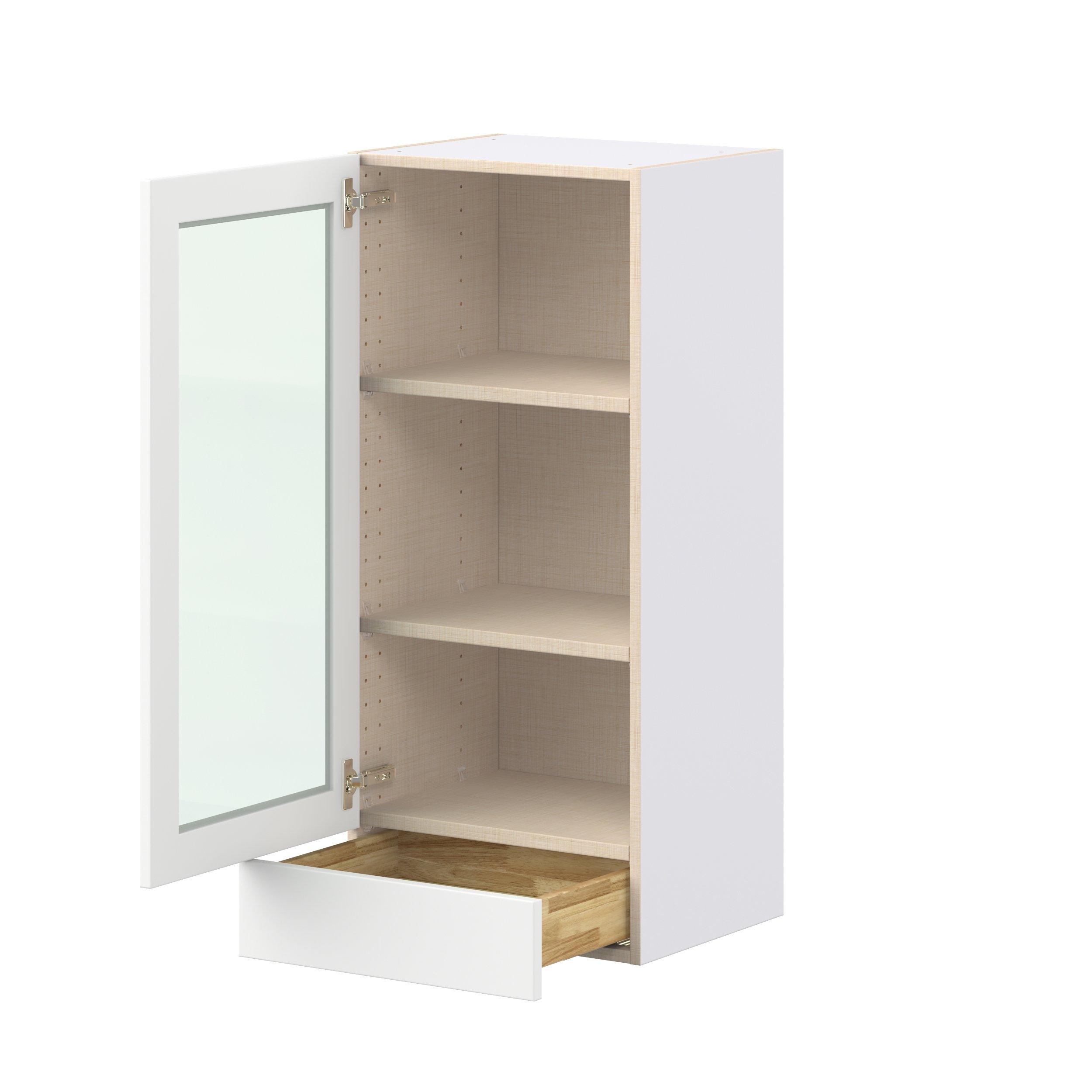 Make a statement with Peachtree premium painted shaker-inspired cabinets, offering both style and durability for years to come. Available in classic bright white and rich midnight blue, this collection is designed to fit seamlessly into both modern and transitional interiors. Crafted from one-piece MDF Studio Design Collection Peachtree 18 in. Painted Bright White Drawer Wall Cabinet with Glass Door is designed to resist hairline cracks while the easy-to-clean finish stands up to stains and moisture. Featuring 5-piece doors and dovetail drawer joints, these cabinets offer durability and elegance. This collection combines style with everyday storage solutions.