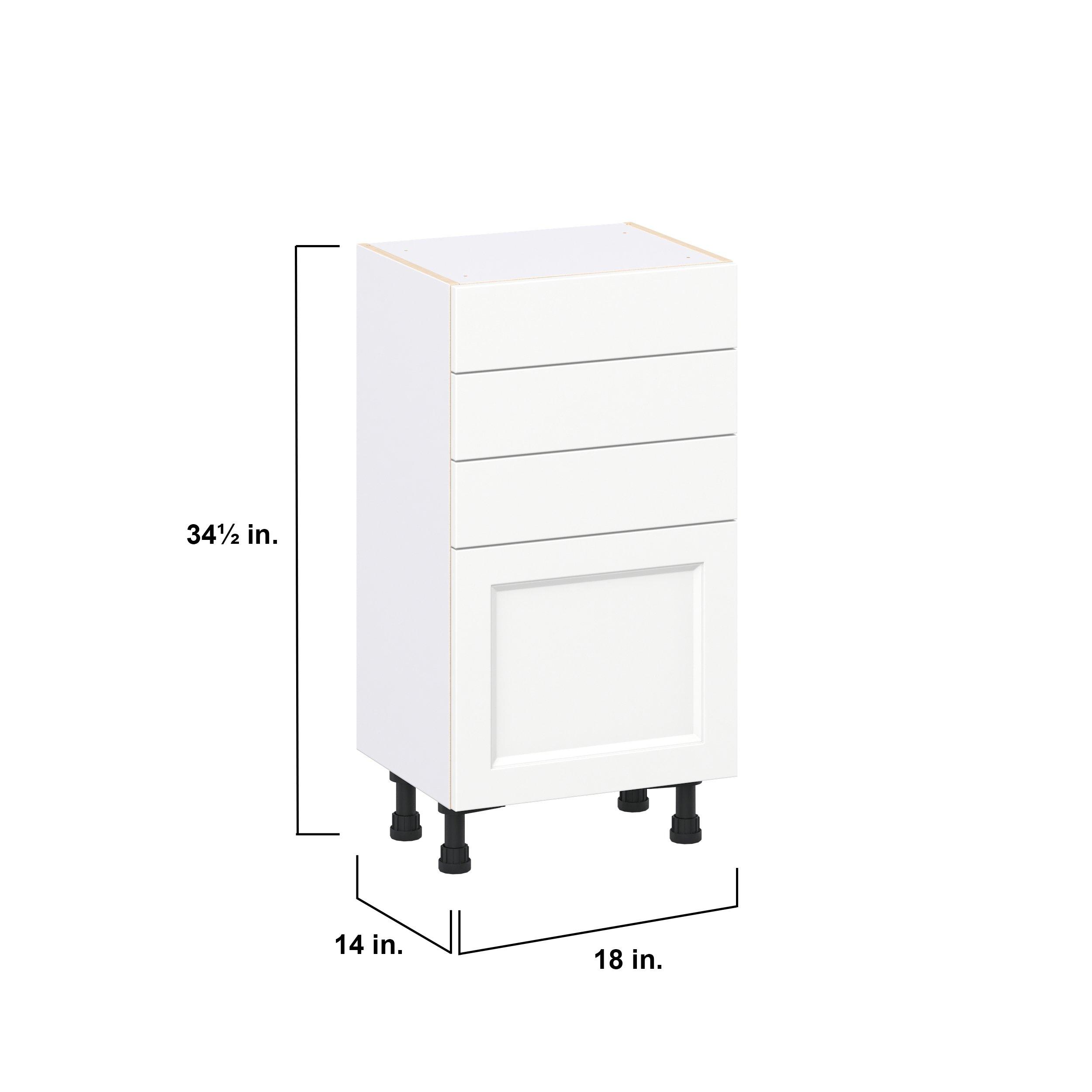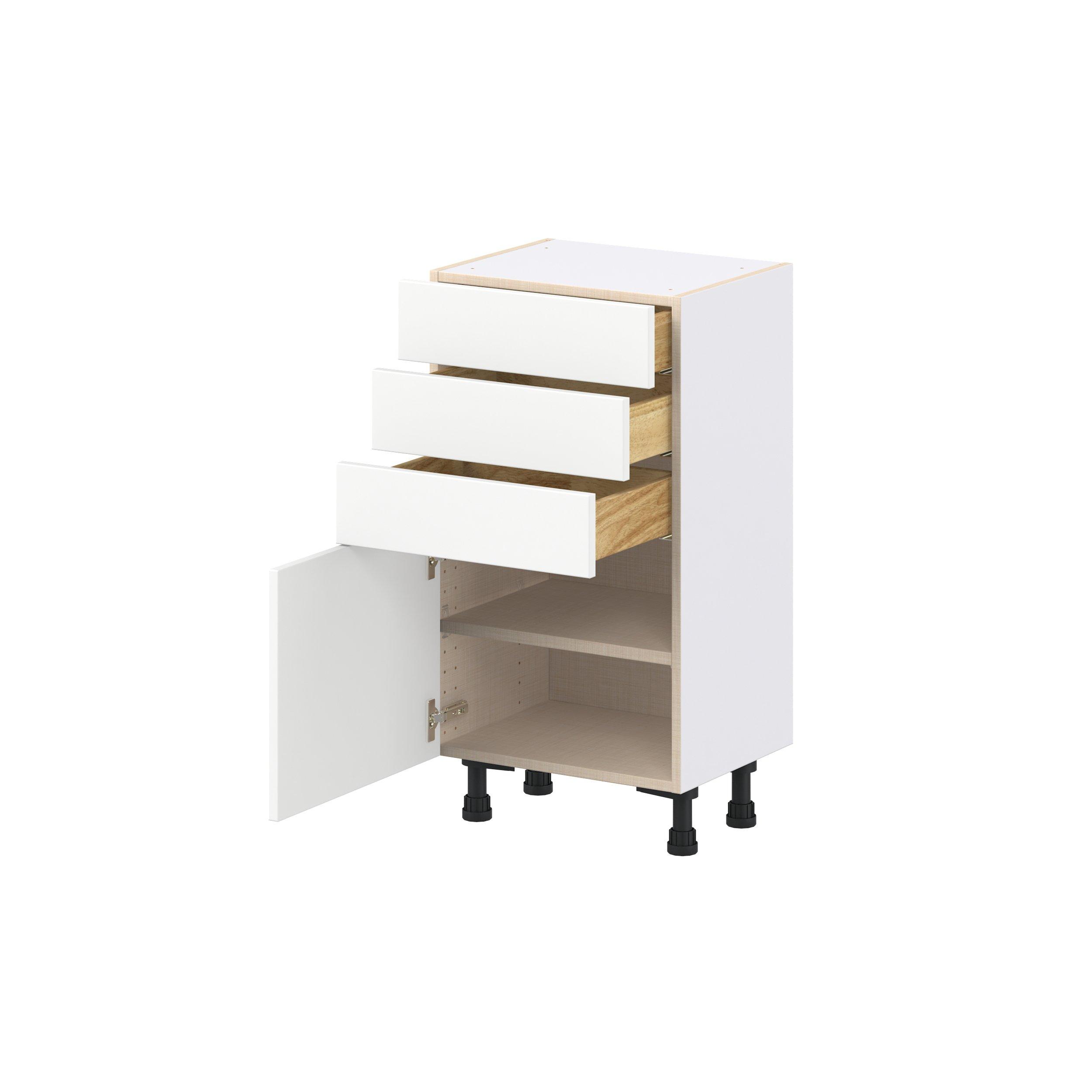 Make a statement with Peachtree premium painted shaker-inspired cabinets, offering both style and durability for years to come. Available in classic bright white and rich midnight blue, this collection is designed to fit seamlessly into both modern and transitional interiors. Crafted from one-piece MDF Studio Design Collection Peachtree 18 in. Painted Bright White Shallow Base Cabinet is designed to resist hairline cracks while the easy-to-clean finish stands up to stains and moisture. Featuring 5-piece doors and dovetail drawer joints, these cabinets offer durability and elegance. This collection combines style with everyday storage solutions.